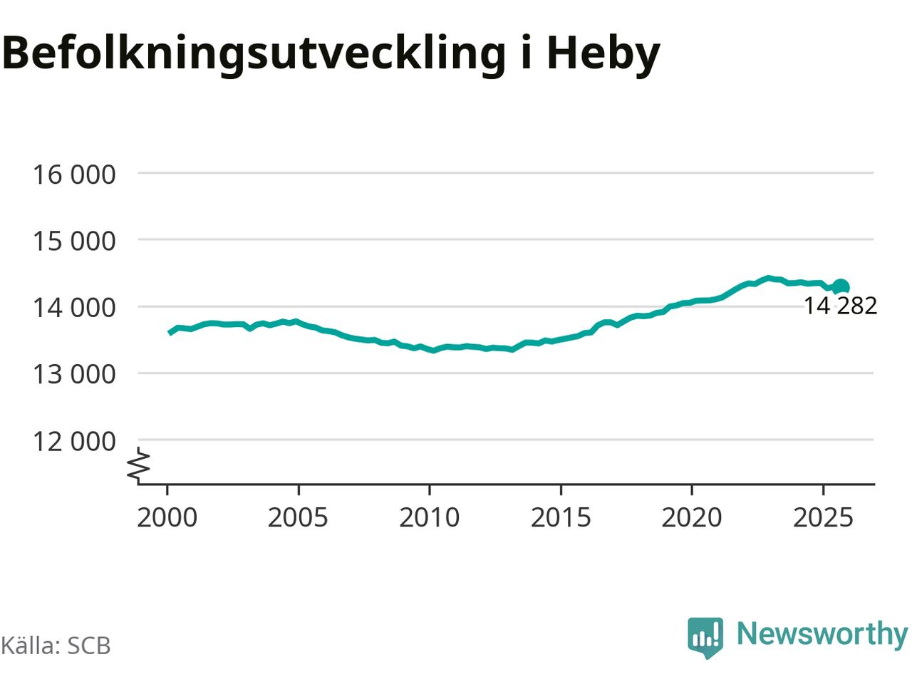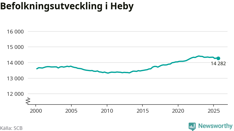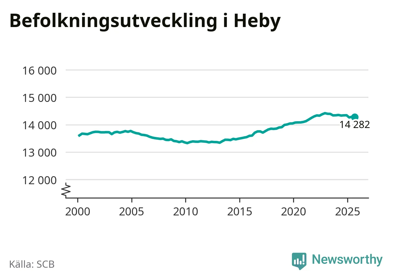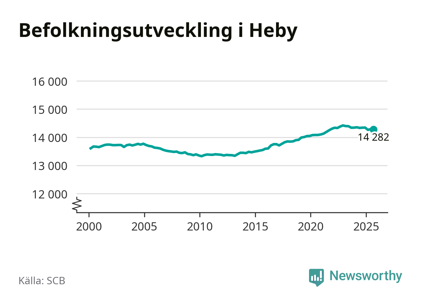 I slutet av tredje kvartalet 2025 bodde 14 282 personer i Heby kommun, enligt SCB:s senaste siffror. Det är 60 personer färre än vid samma tidpunkt förra året.