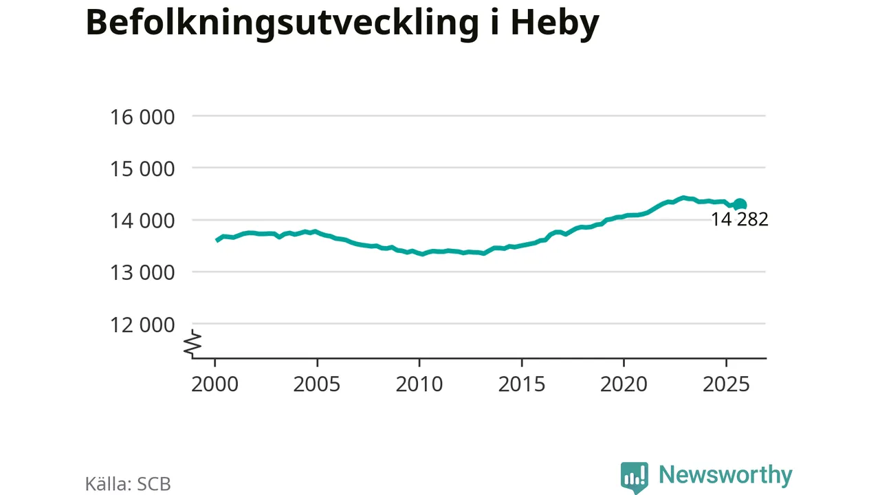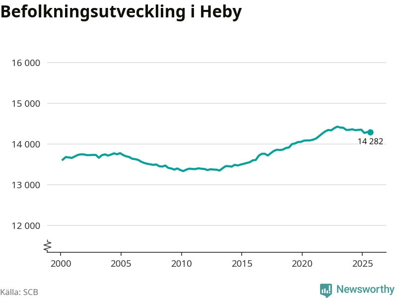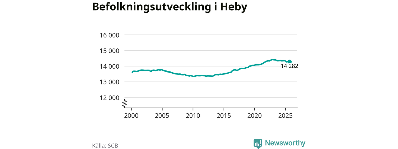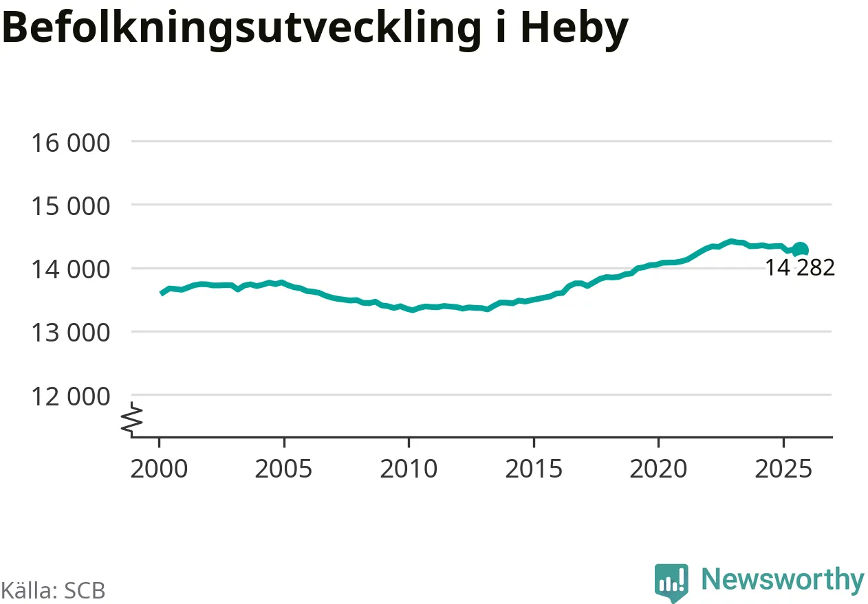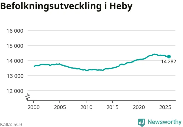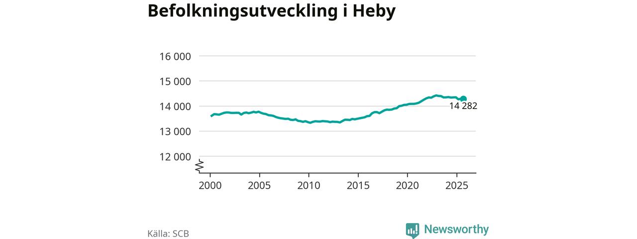 I slutet av tredje kvartalet 2025 bodde 14 282 personer i Heby kommun, enligt SCB:s senaste siffror. Det är 60 personer färre än vid samma tidpunkt förra året.