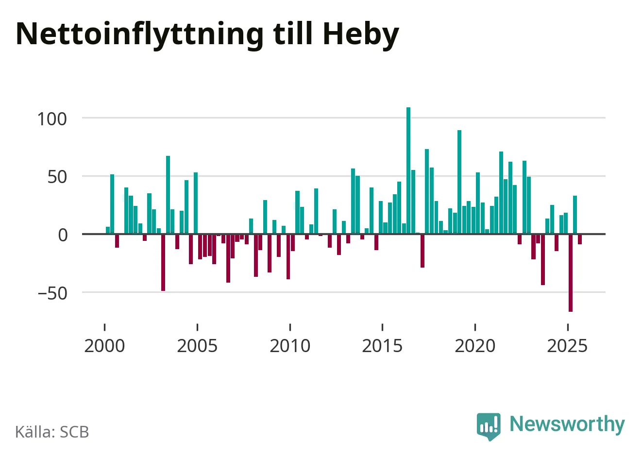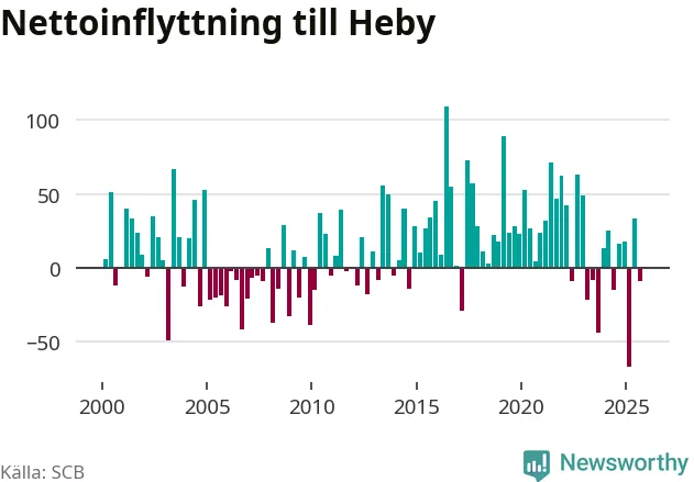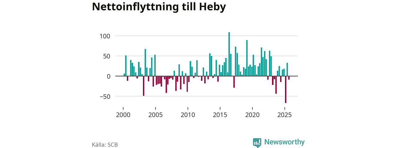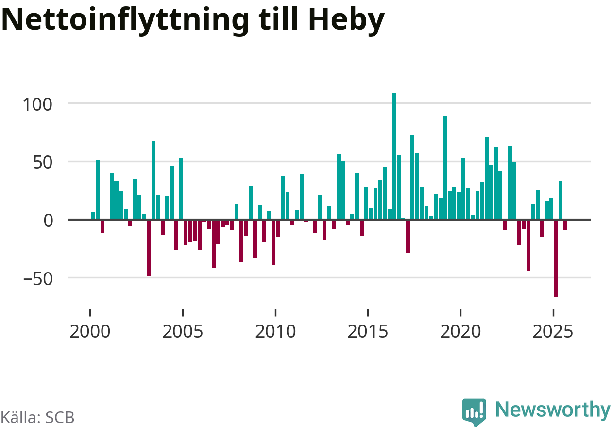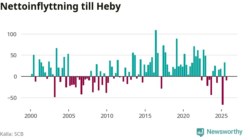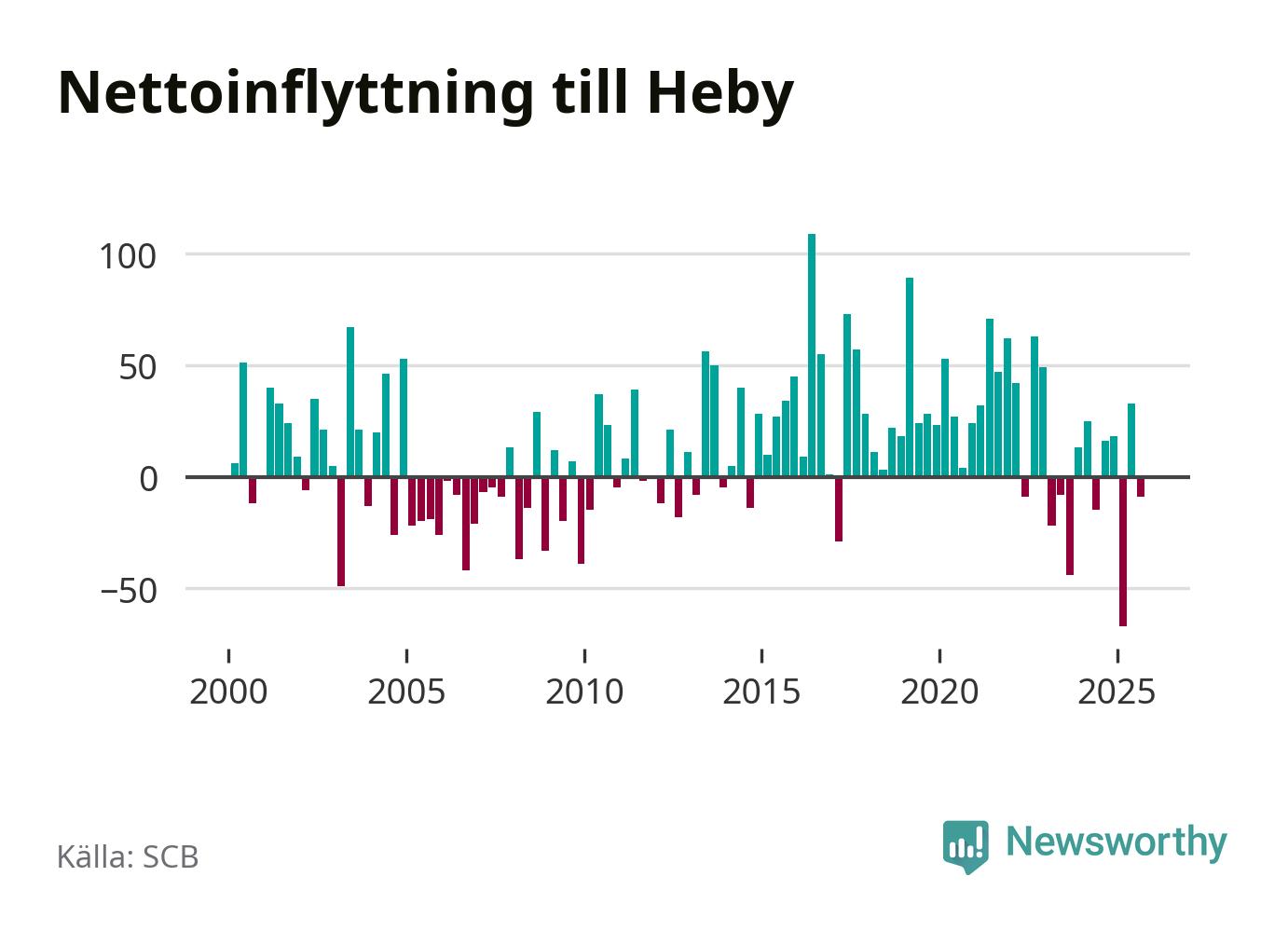 Under tredje kvartalet 2025 flyttade 240 personer till kommunen medan 249 personer flyttade därifrån. Det är historiskt sett en stor utflyttning under ett kvartal. Skillnaden mellan antalet in- och utflyttade är så liten att den lika gärna kan bero på SCB:s slumpmässiga brus. Sedan seklets början har Heby haft ett positivt flyttnetto under nästan alla kvartal.