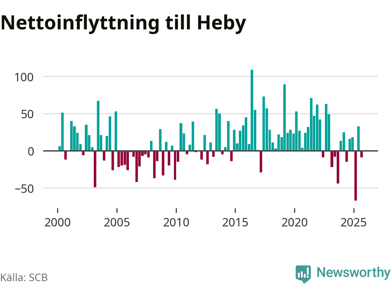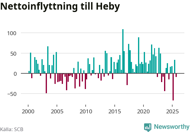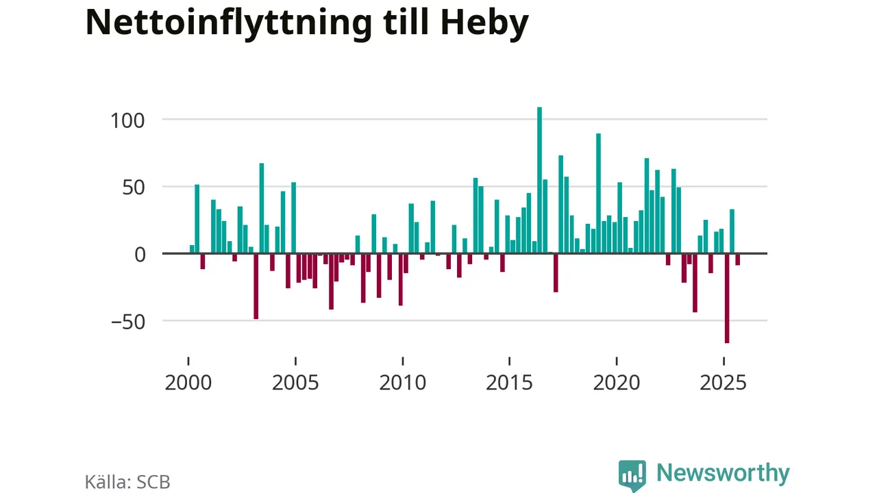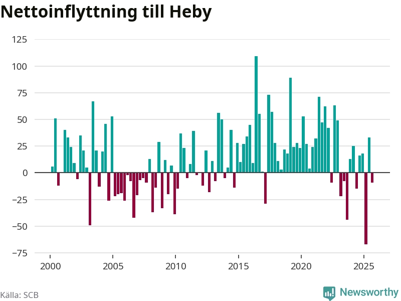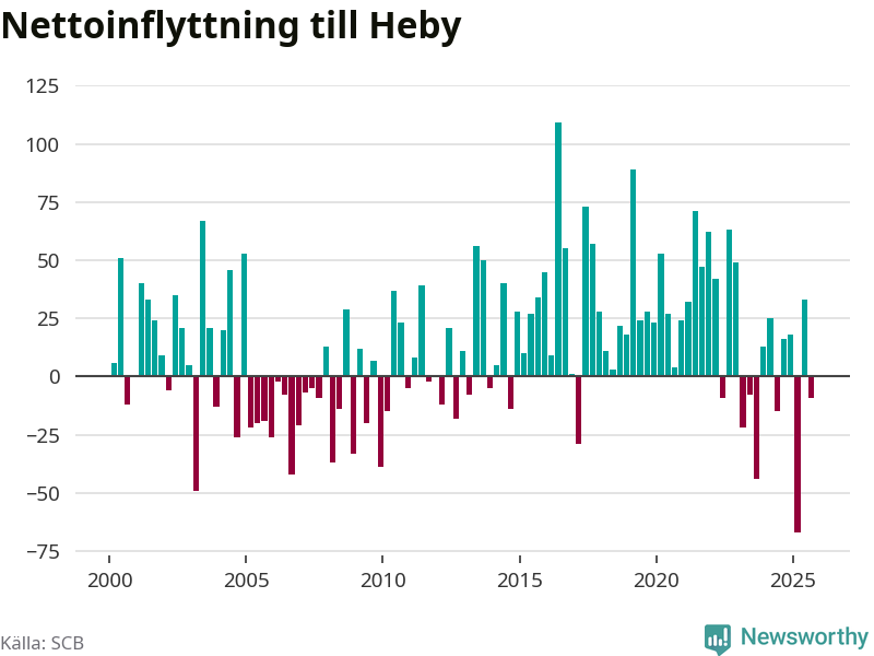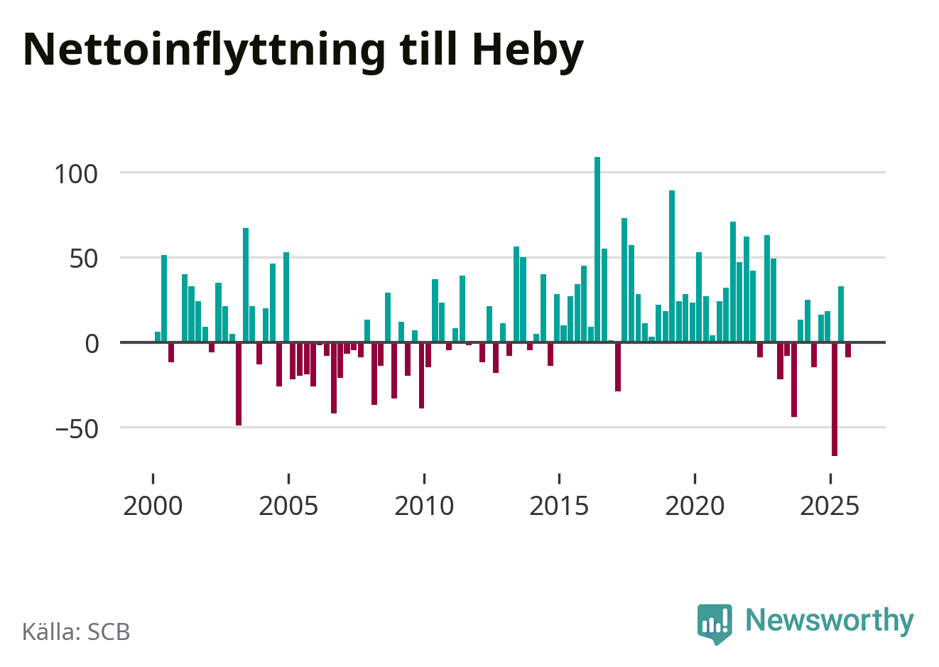 Under tredje kvartalet 2025 flyttade 240 personer till kommunen medan 249 personer flyttade därifrån. Det är historiskt sett en stor utflyttning under ett kvartal. Skillnaden mellan antalet in- och utflyttade är så liten att den lika gärna kan bero på SCB:s slumpmässiga brus. Sedan seklets början har Heby haft ett positivt flyttnetto under nästan alla kvartal.