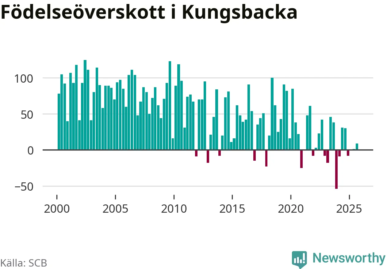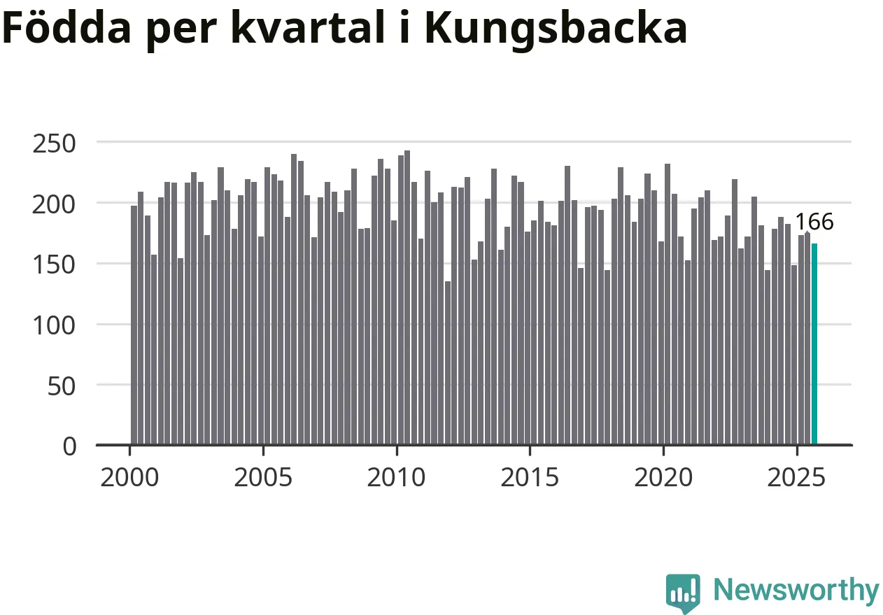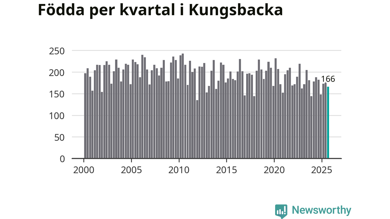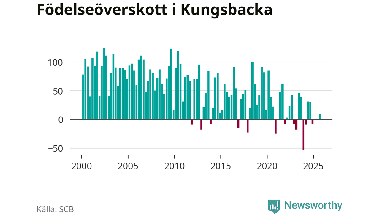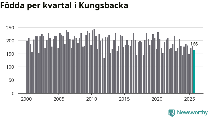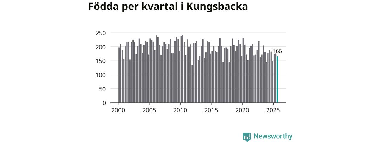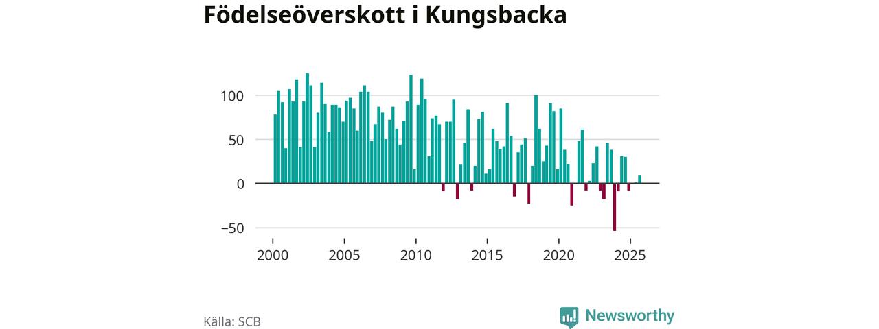 Enligt SCB:s siffror föddes 166 barn i Kungsbacka under det senaste kvartalet. Samtidigt avled 157 personer. Skillnaden mellan antal födda och döda är så liten att det inte går att säga om det beror på något annat än SCB:s röjandeskydd. Kommunen har oftast haft positivt födelsenetto tidigare.