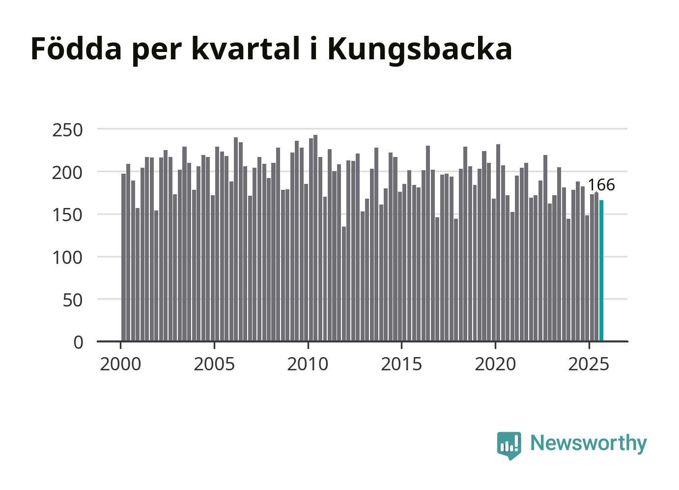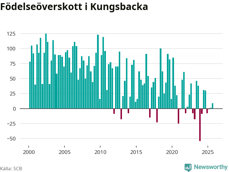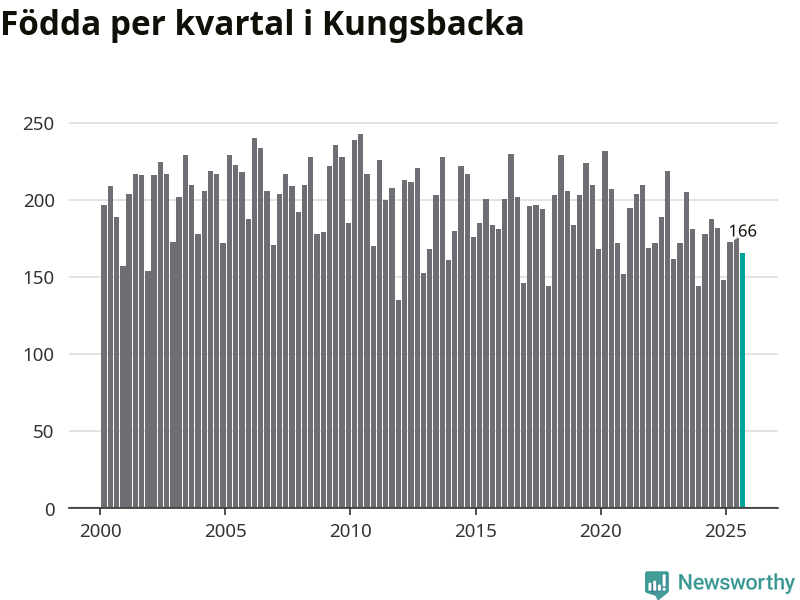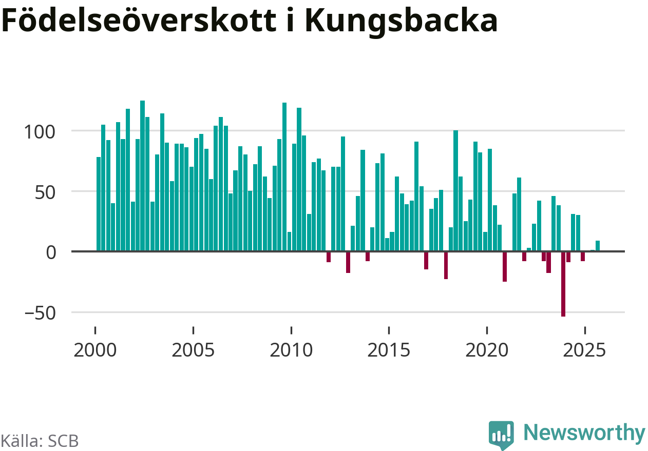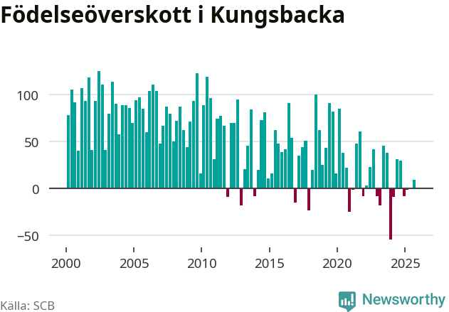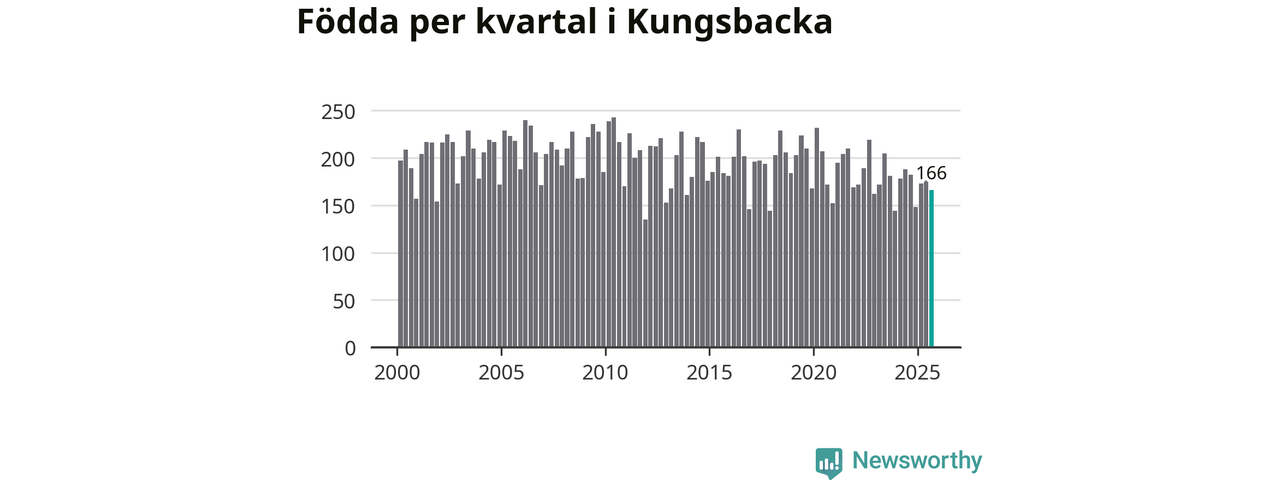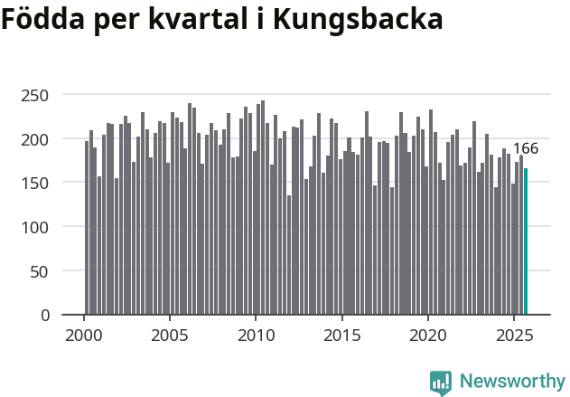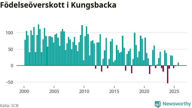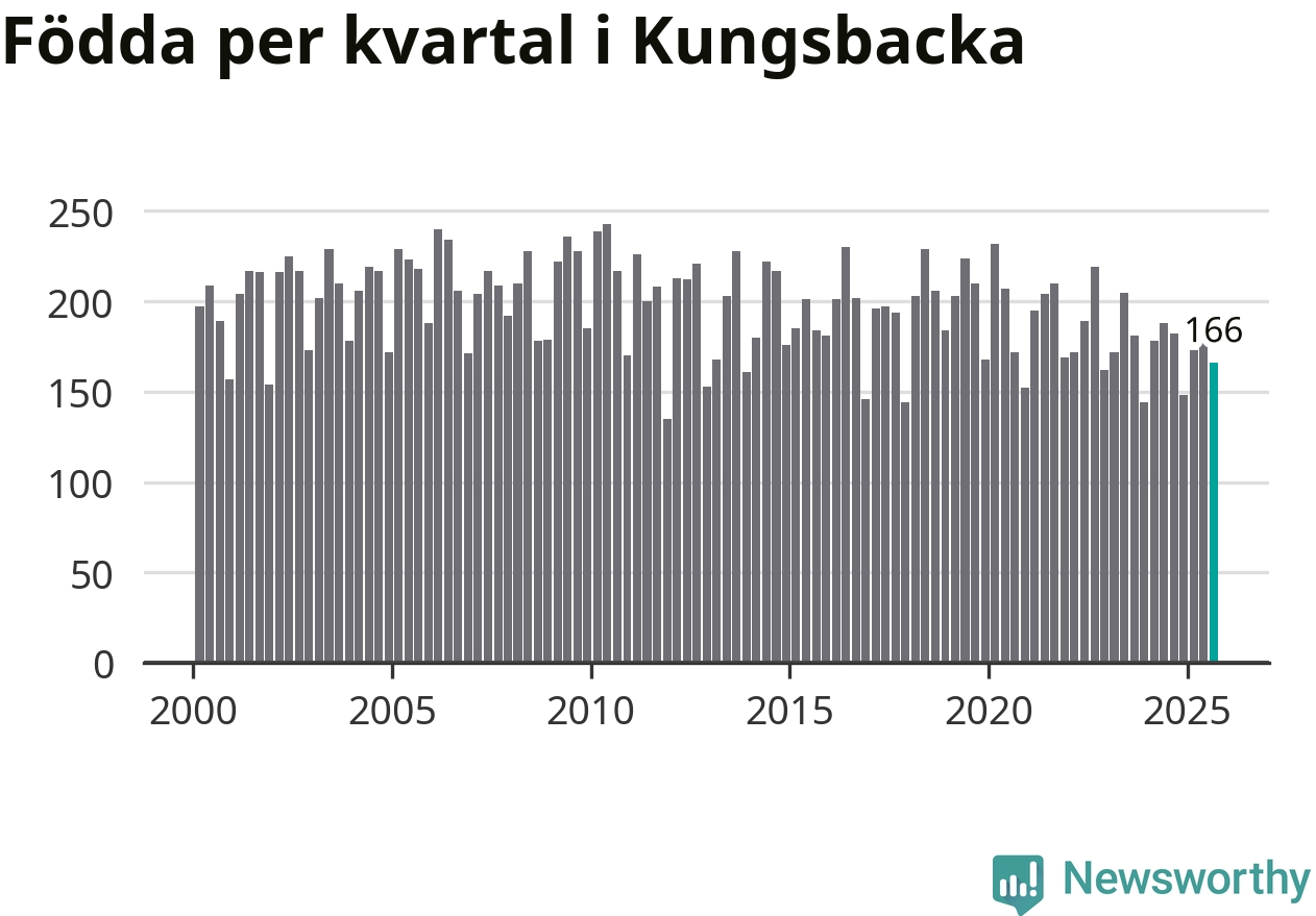 Enligt SCB:s siffror föddes 166 barn i Kungsbacka under det senaste kvartalet. Samtidigt avled 157 personer. Skillnaden mellan antal födda och döda är så liten att det inte går att säga om det beror på något annat än SCB:s röjandeskydd. Kommunen har oftast haft positivt födelsenetto tidigare.