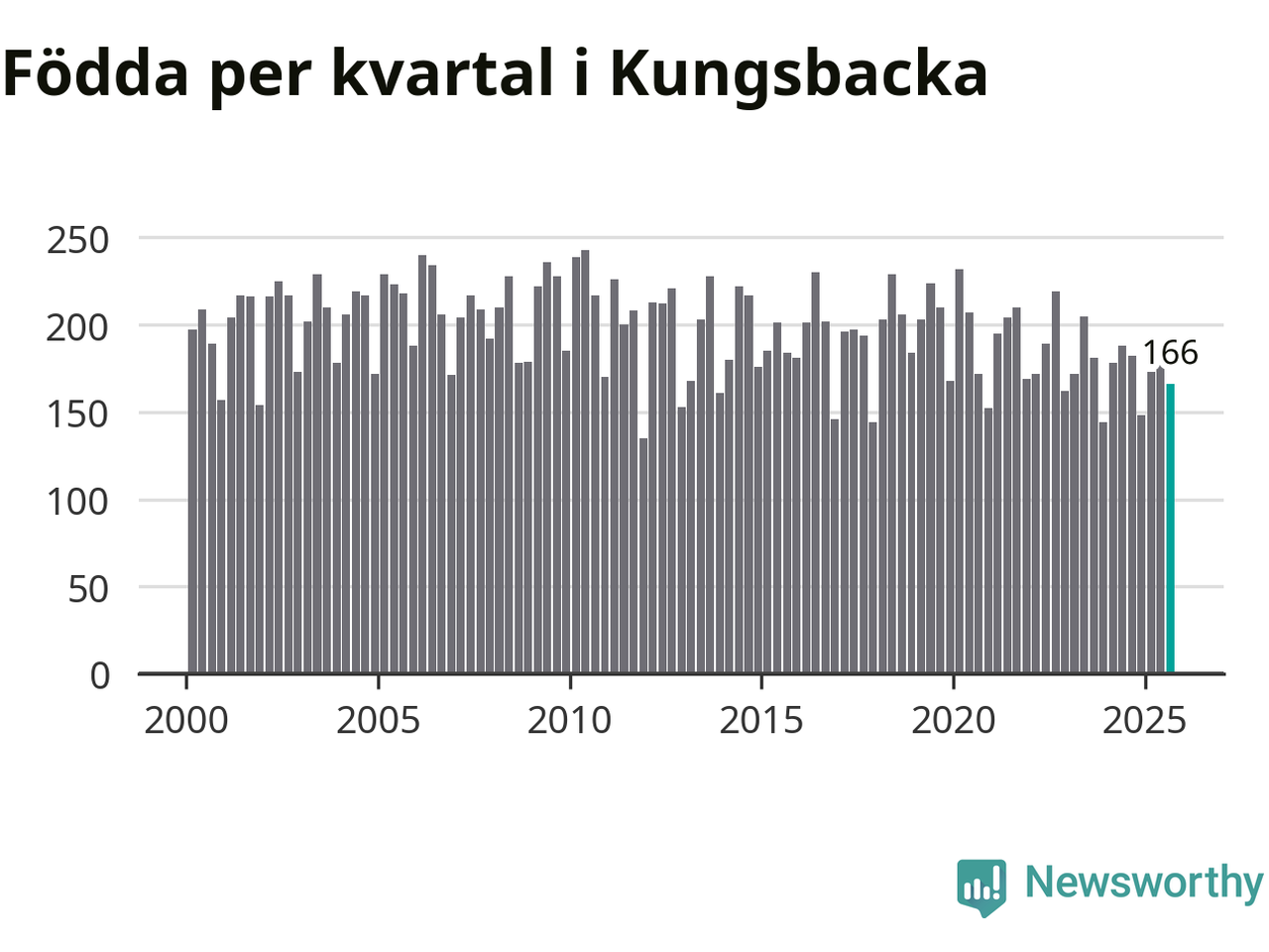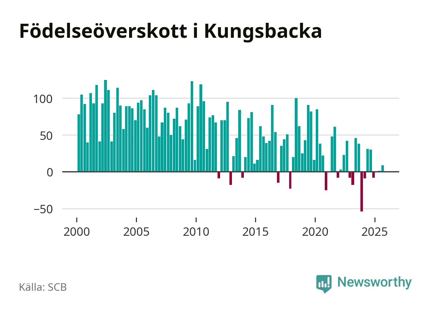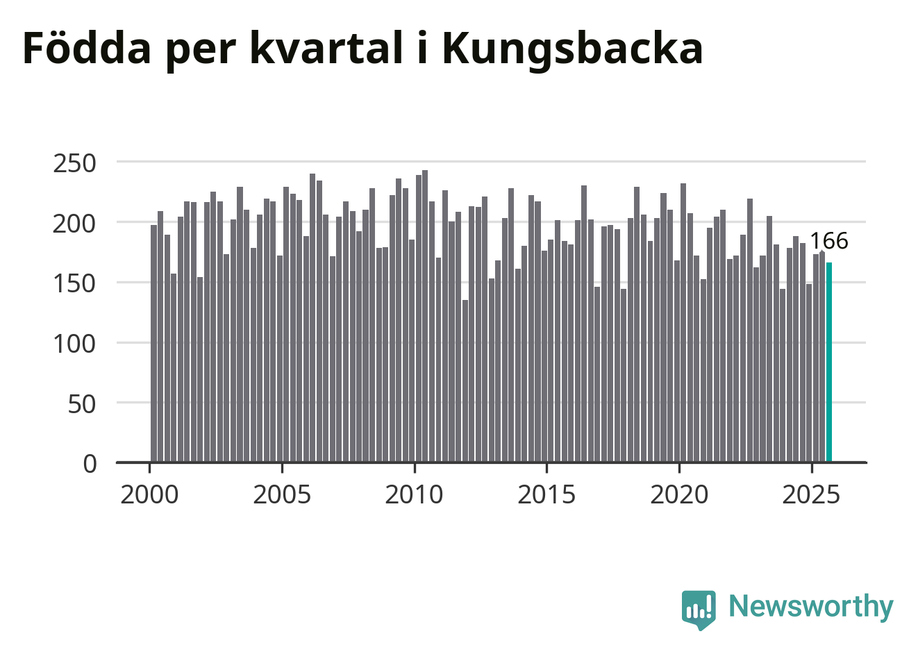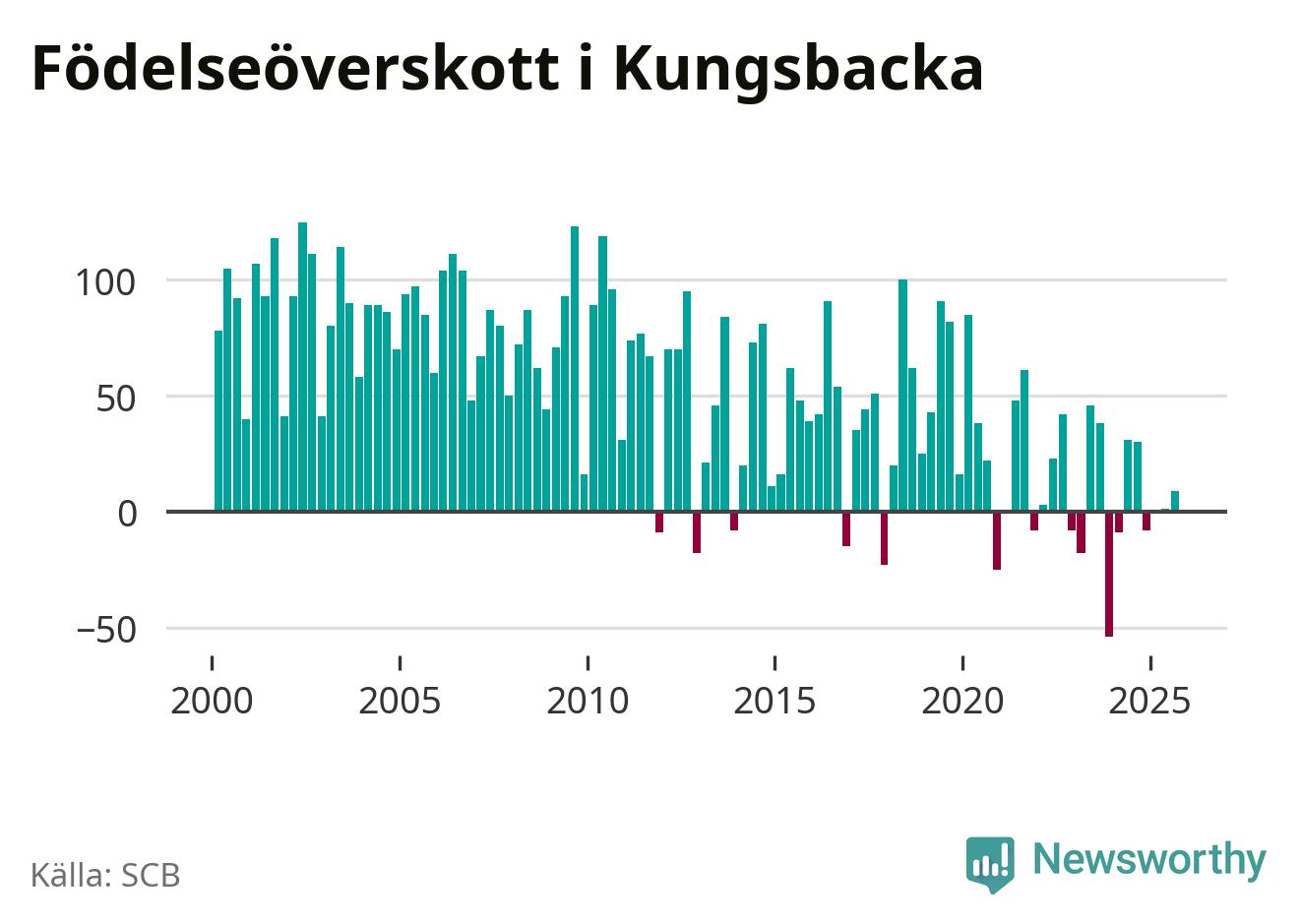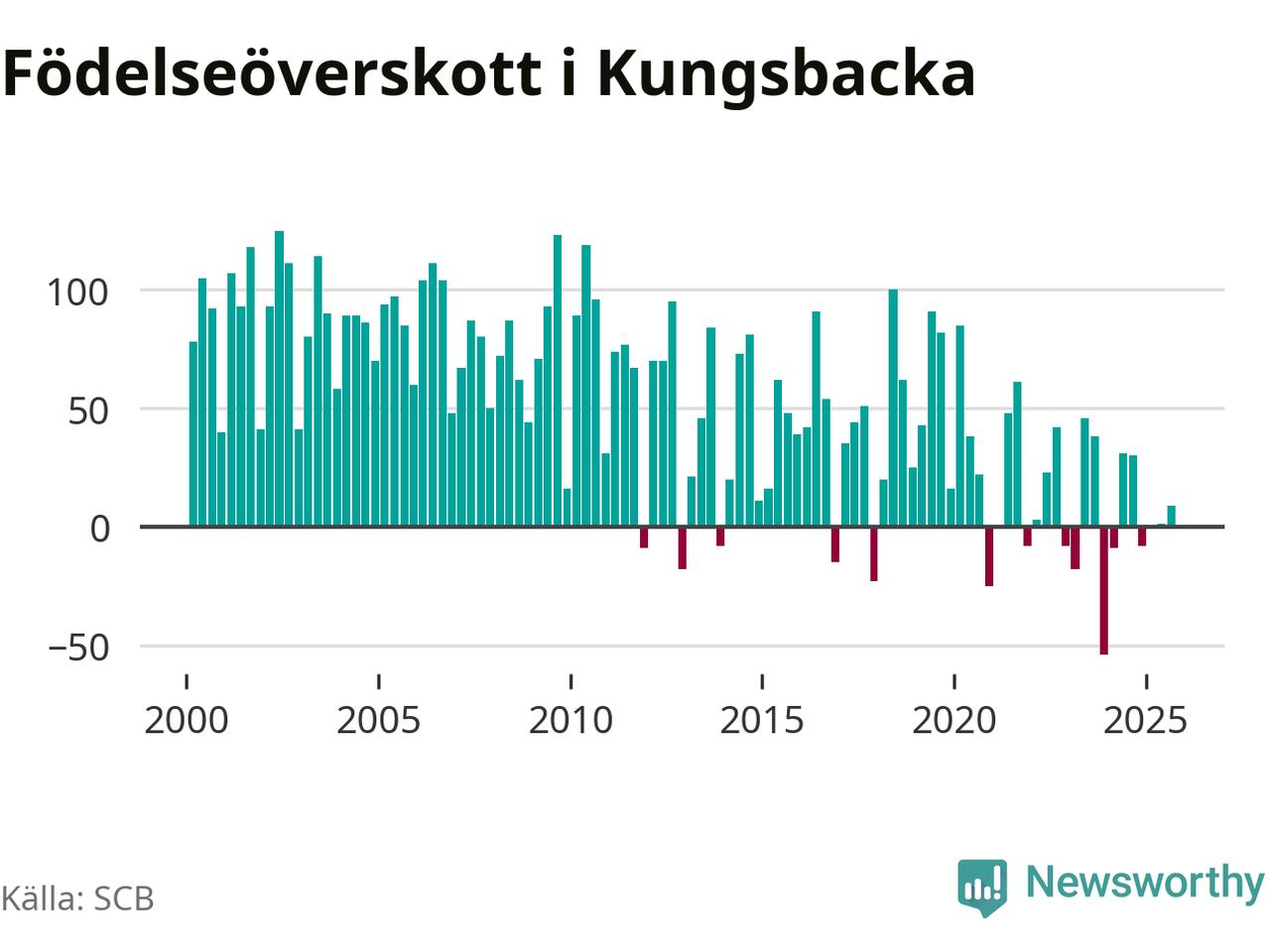Enligt SCB:s siffror föddes 166 barn i Kungsbacka under det senaste kvartalet. Samtidigt avled 157 personer. Skillnaden mellan antal födda och döda är så liten att det inte går att säga om det beror på något annat än SCB:s röjandeskydd. Kommunen har oftast haft positivt födelsenetto tidigare.
