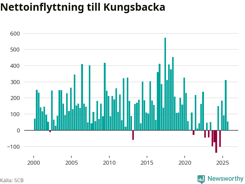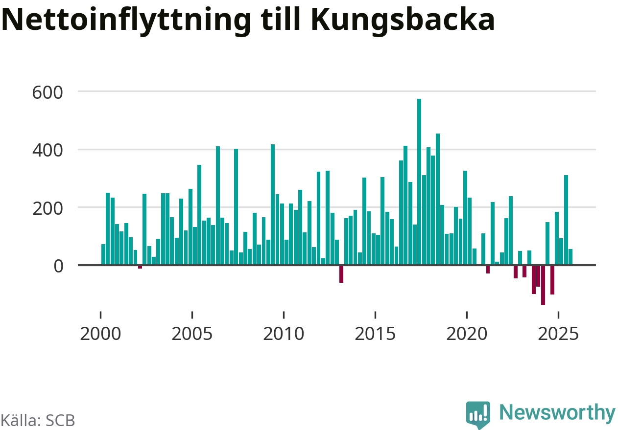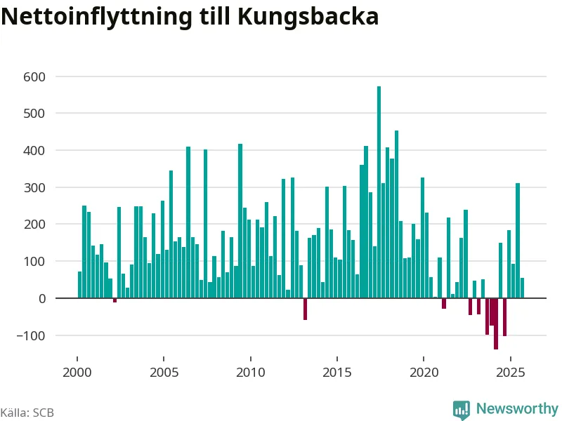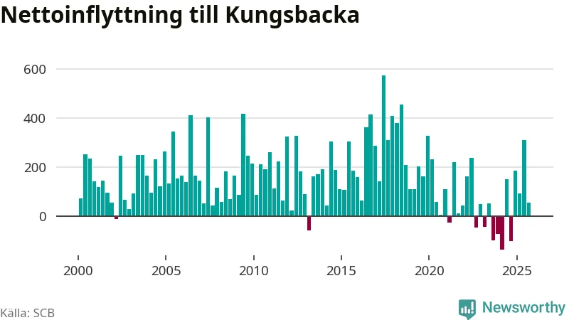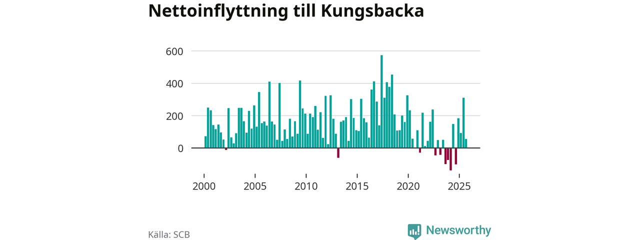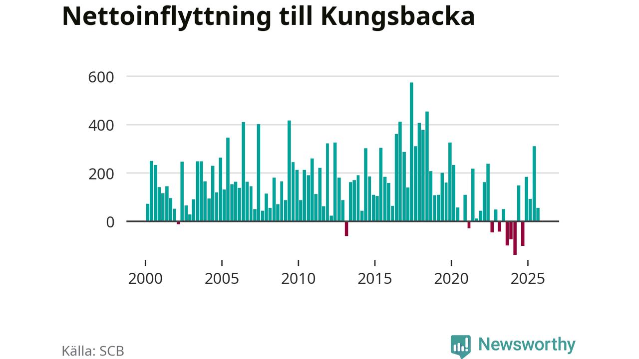 Under tredje kvartalet 2025 flyttade 1 146 personer till kommunen medan 1 091 personer flyttade därifrån. Det är historiskt sett en stor utflyttning under ett kvartal. Sedan seklets början har Kungsbacka haft ett positivt flyttnetto under nästan alla kvartal, inklusive det senaste kvartalet.