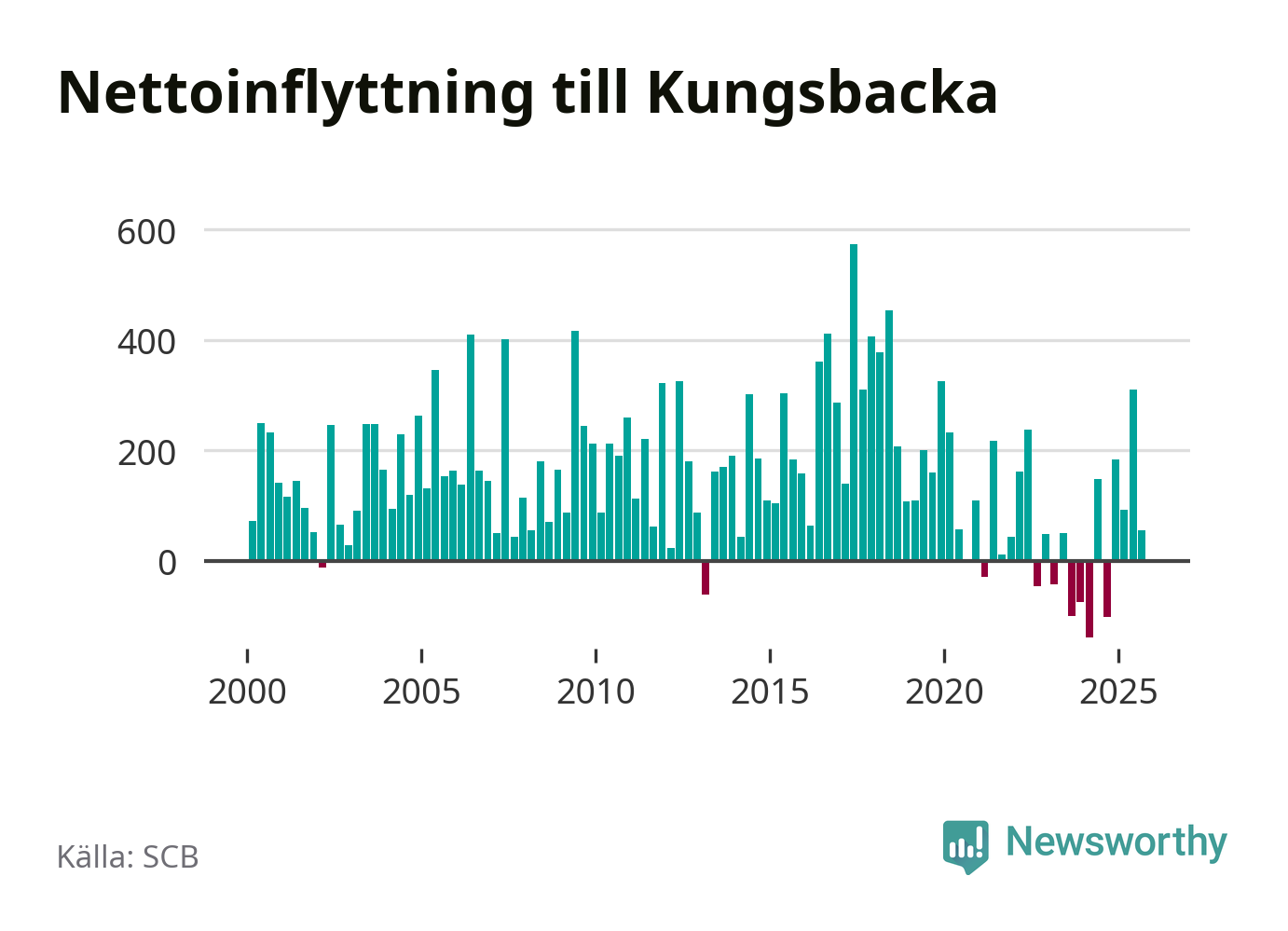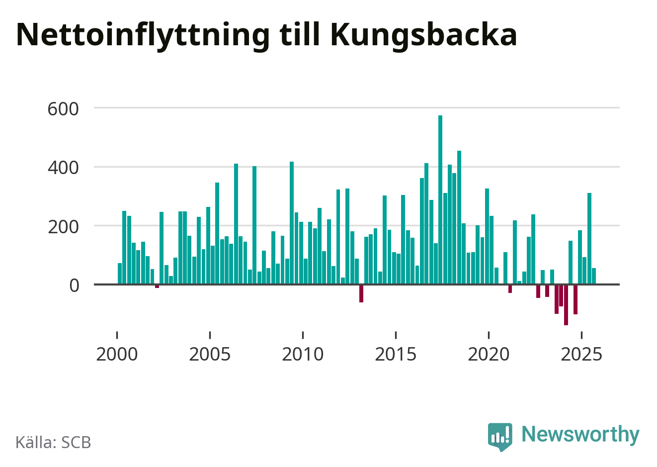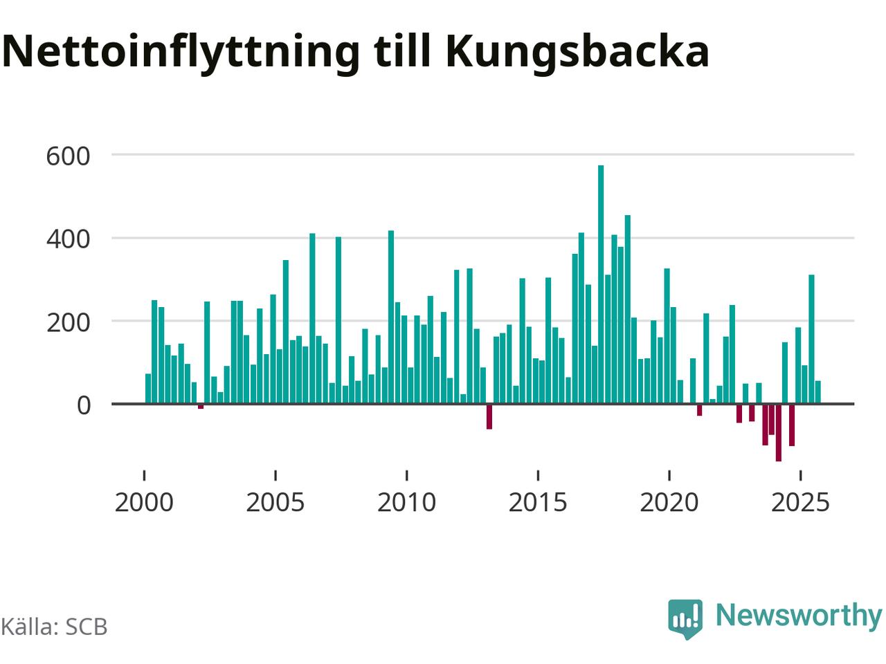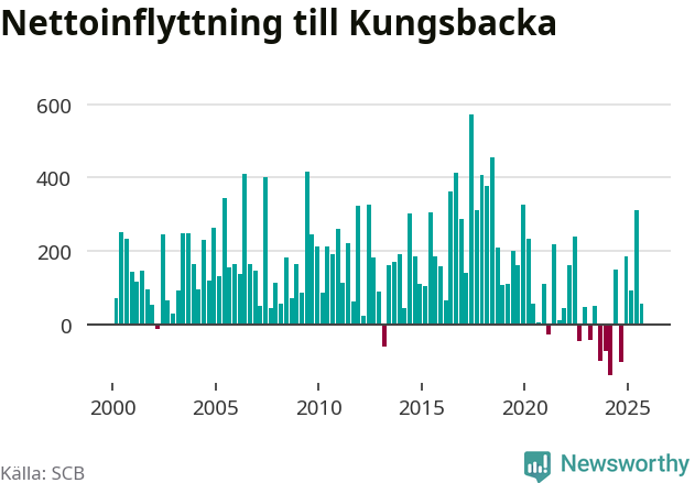Under tredje kvartalet 2025 flyttade 1 146 personer till kommunen medan 1 091 personer flyttade därifrån. Det är historiskt sett en stor utflyttning under ett kvartal. Sedan seklets början har Kungsbacka haft ett positivt flyttnetto under nästan alla kvartal, inklusive det senaste kvartalet.
