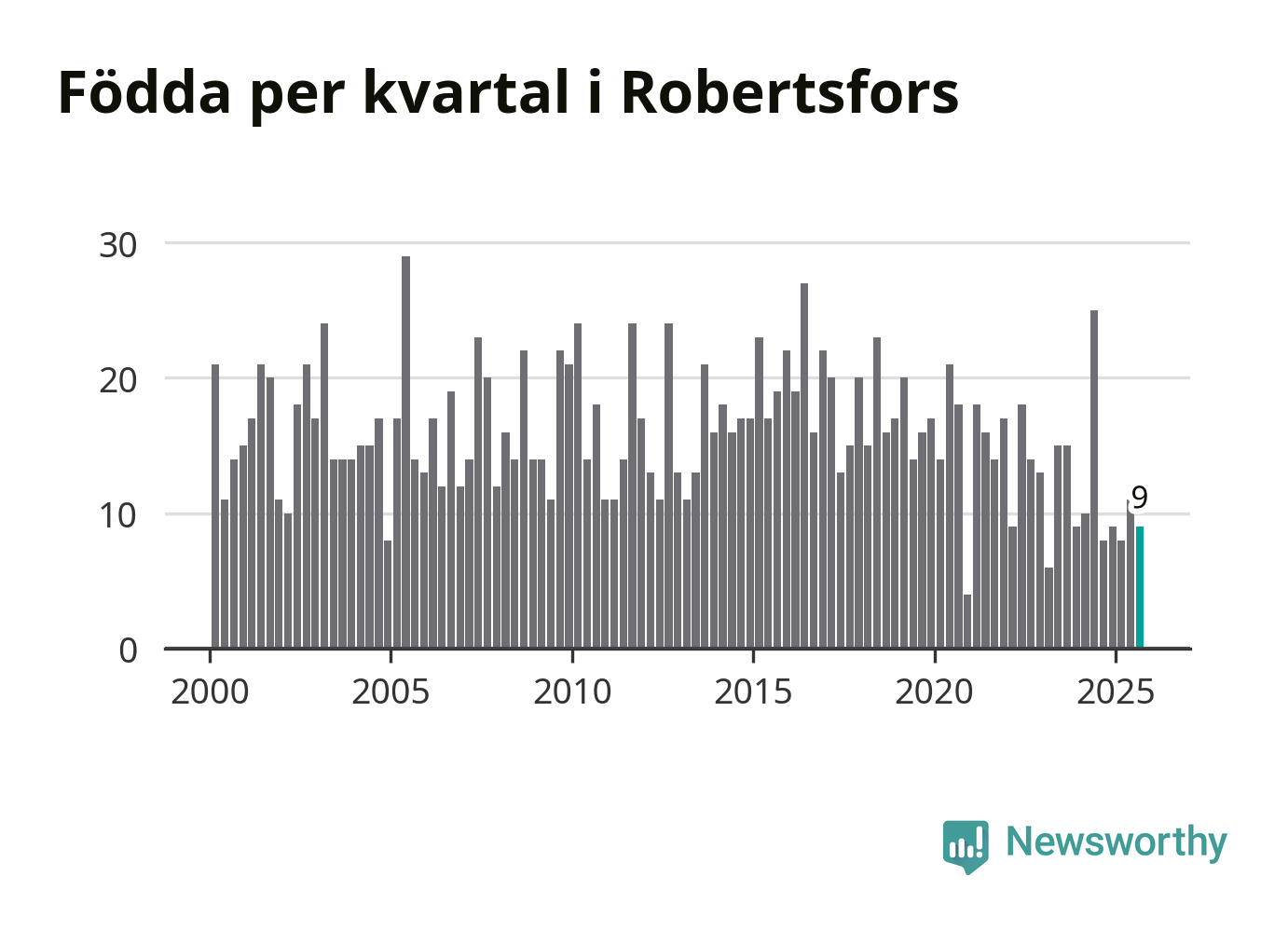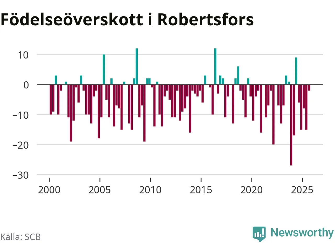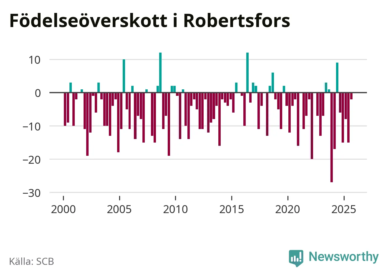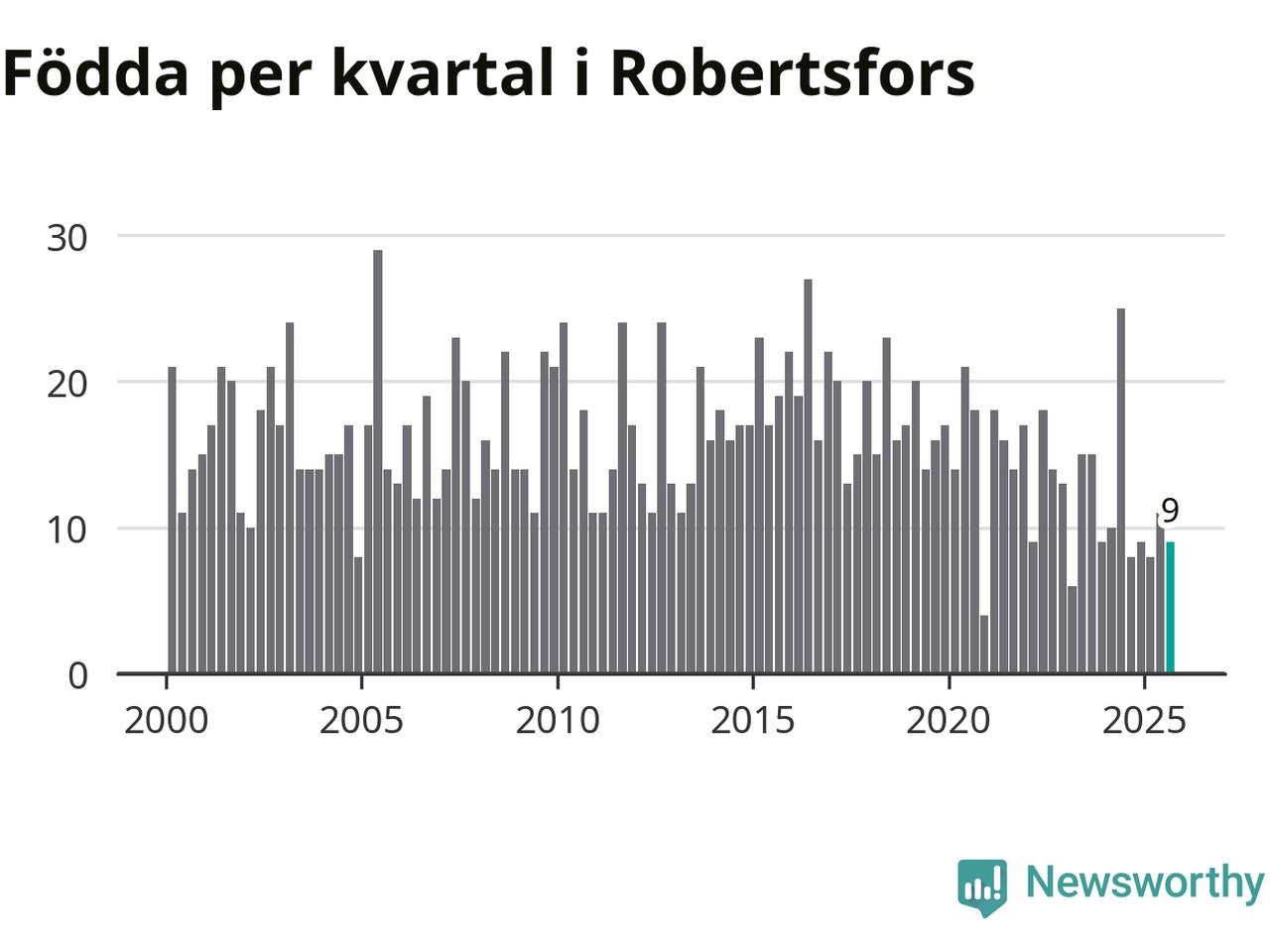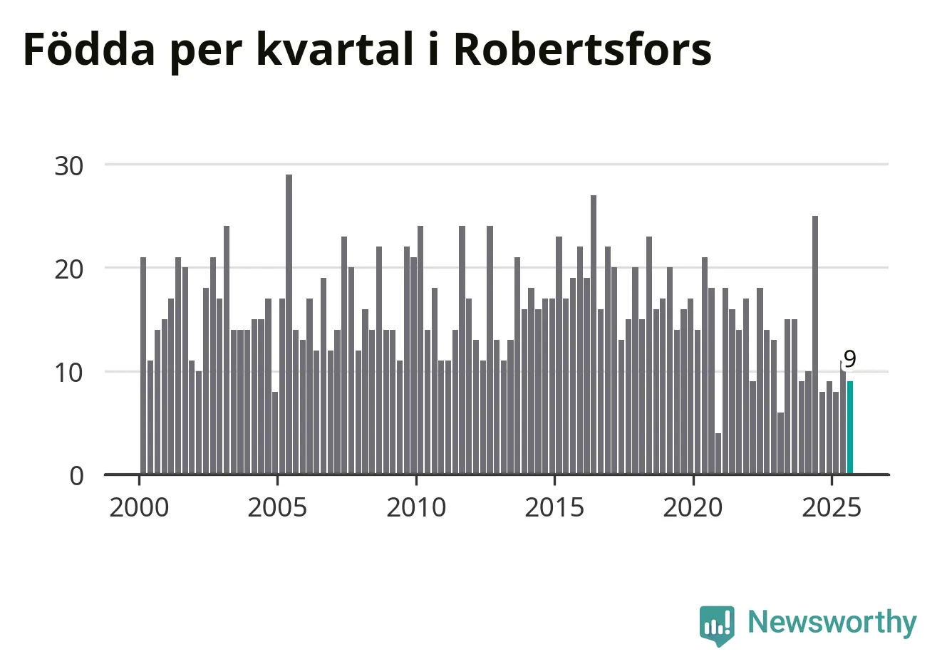 Enligt SCB:s siffror föddes nio barn i Robertsfors under det senaste kvartalet. Samtidigt avled elva personer. Skillnaden mellan antal födda och döda är så liten att det inte går att säga om det beror på något annat än SCB:s röjandeskydd. Kommunen har oftast haft negativt födelsenetto tidigare.