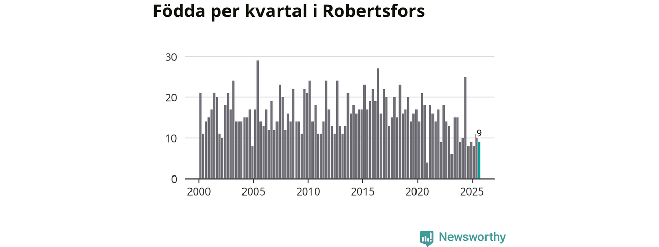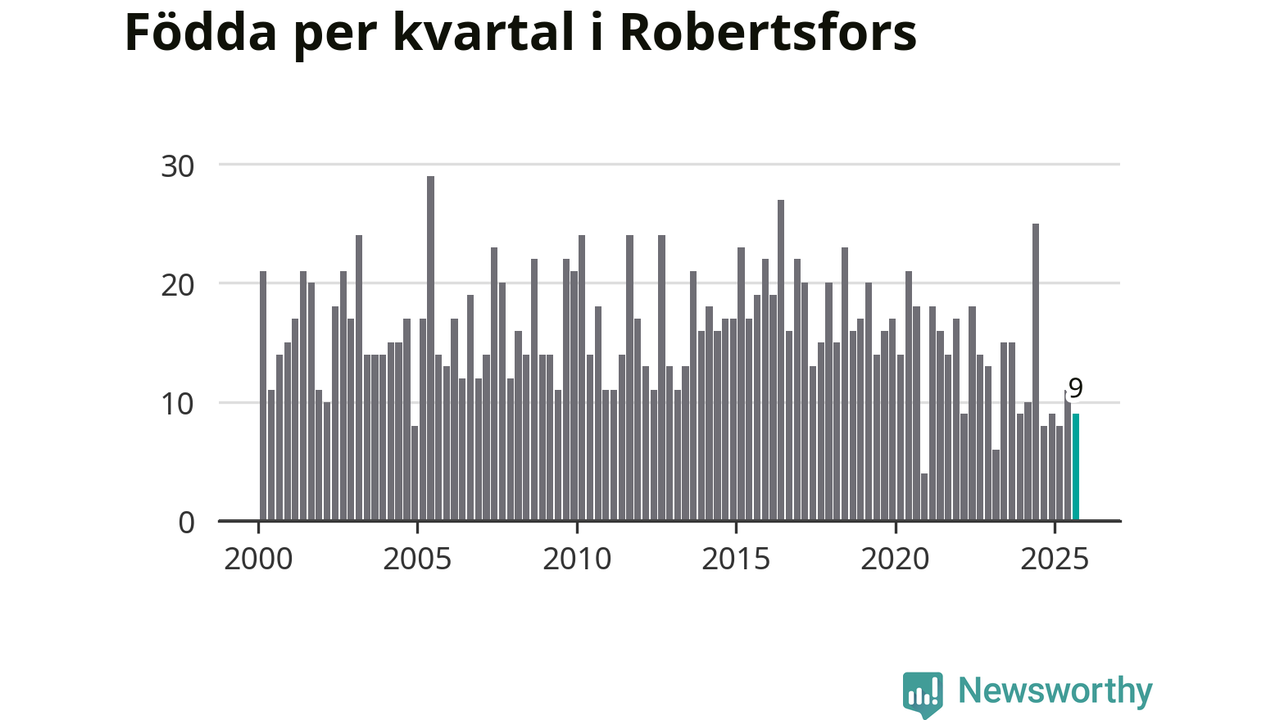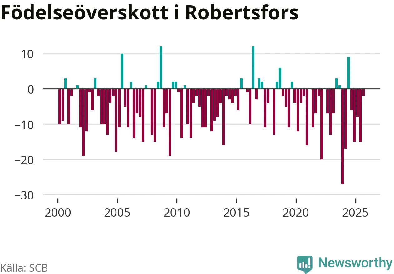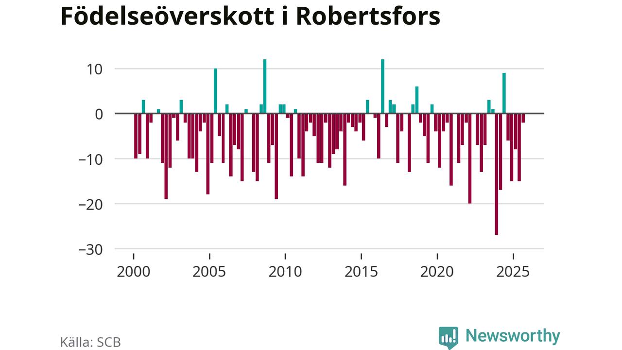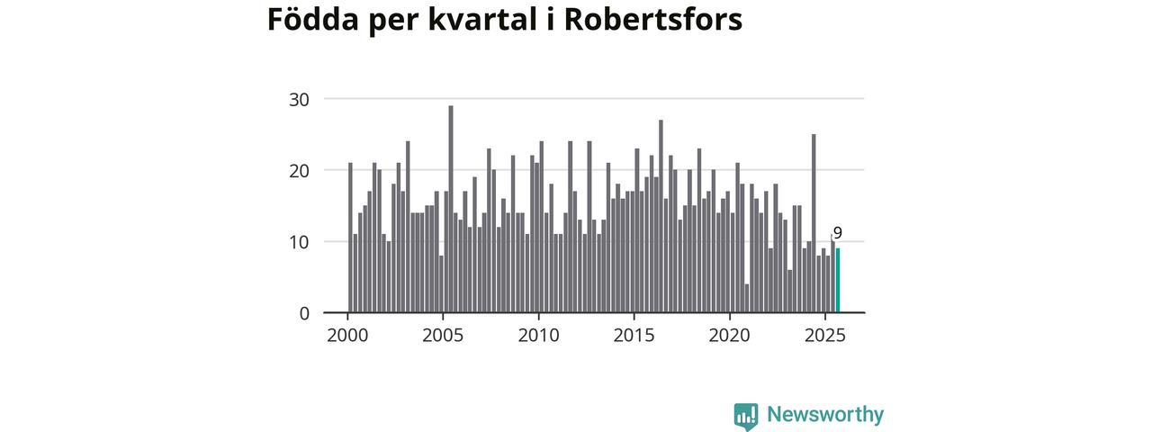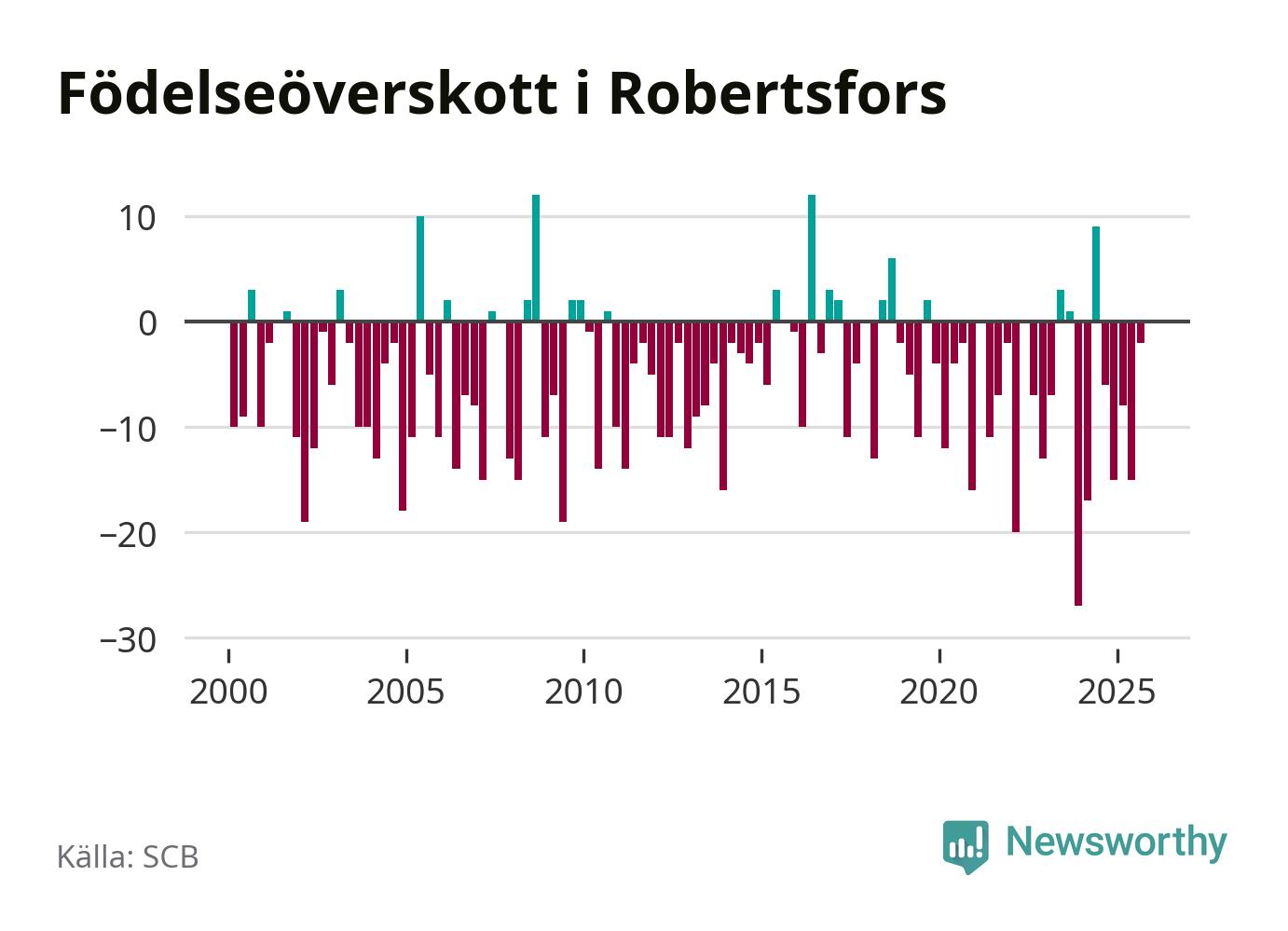 Enligt SCB:s siffror föddes nio barn i Robertsfors under det senaste kvartalet. Samtidigt avled elva personer. Skillnaden mellan antal födda och döda är så liten att det inte går att säga om det beror på något annat än SCB:s röjandeskydd. Kommunen har oftast haft negativt födelsenetto tidigare.