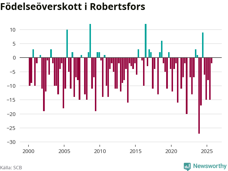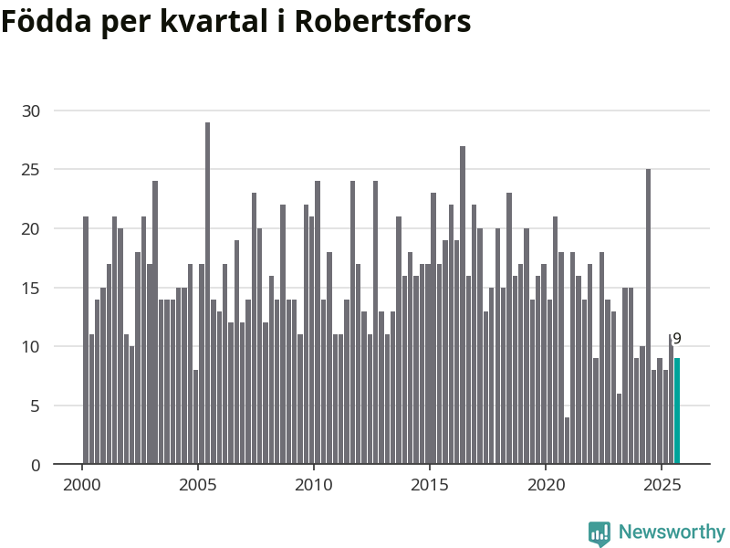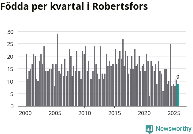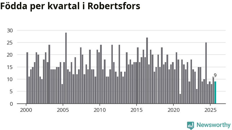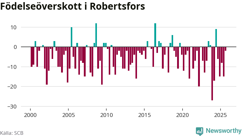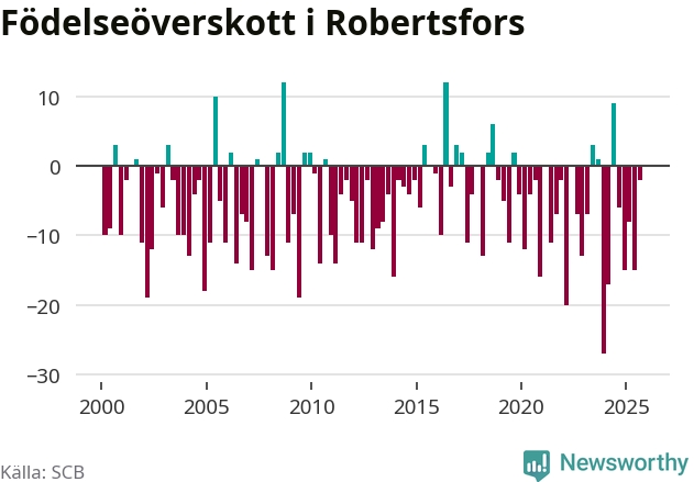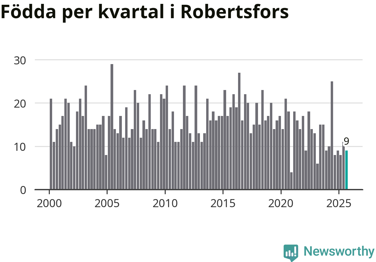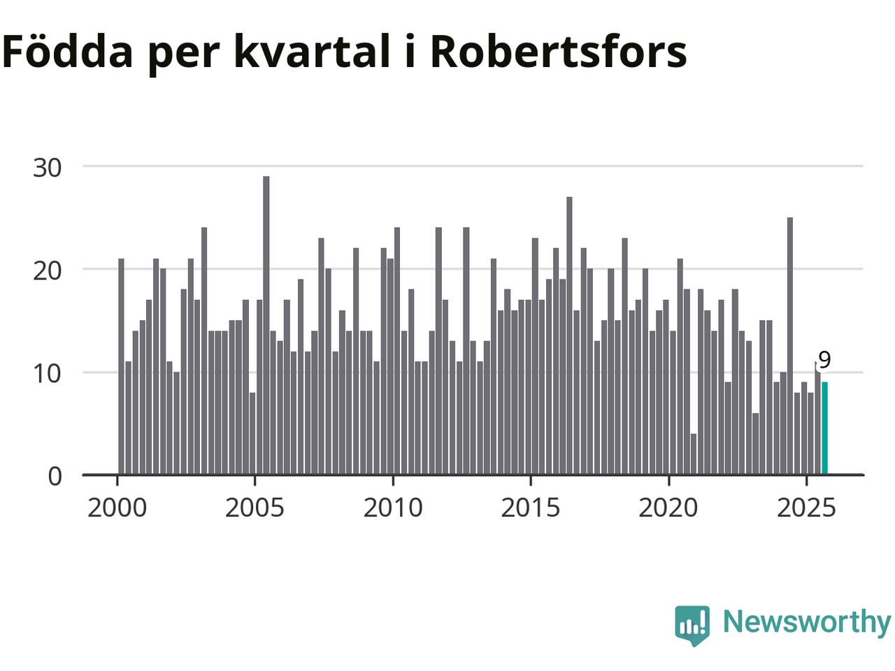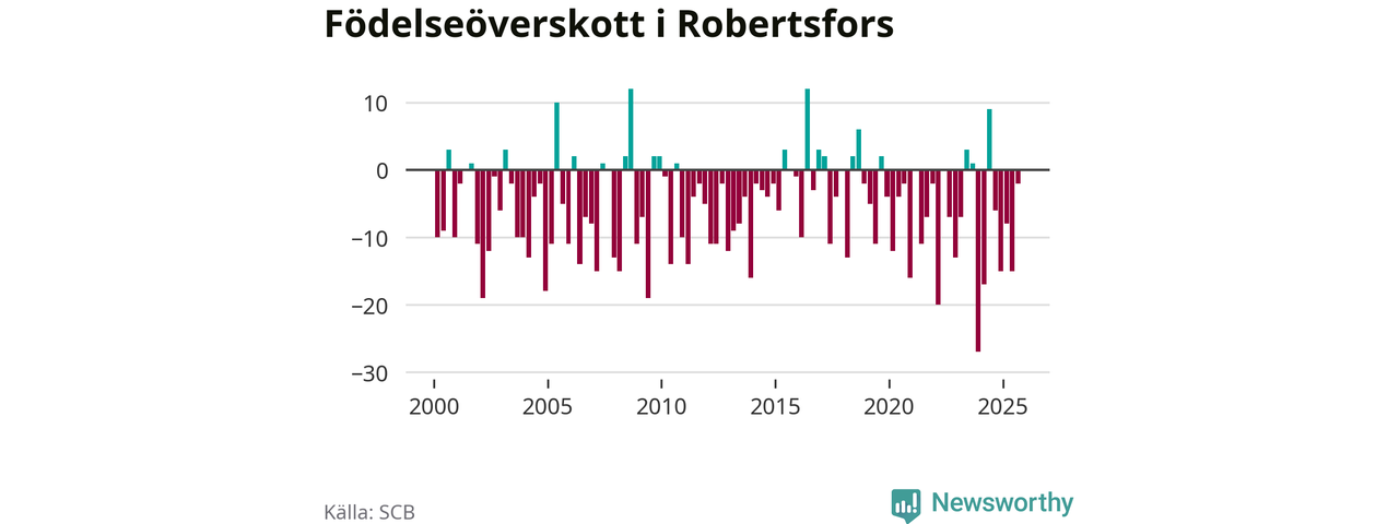 Enligt SCB:s siffror föddes nio barn i Robertsfors under det senaste kvartalet. Samtidigt avled elva personer. Skillnaden mellan antal födda och döda är så liten att det inte går att säga om det beror på något annat än SCB:s röjandeskydd. Kommunen har oftast haft negativt födelsenetto tidigare.