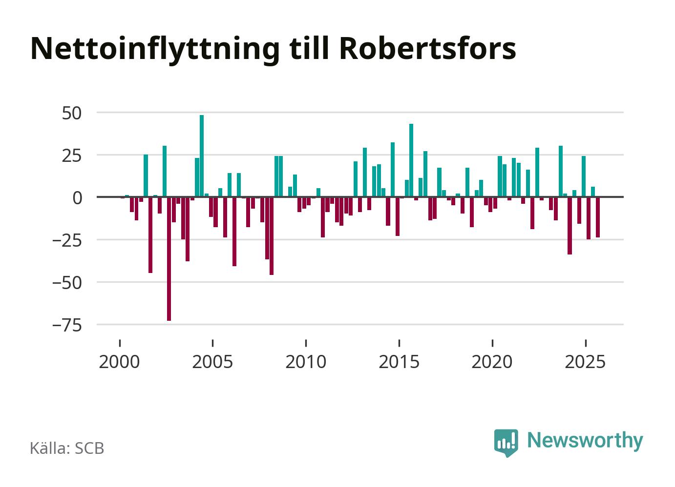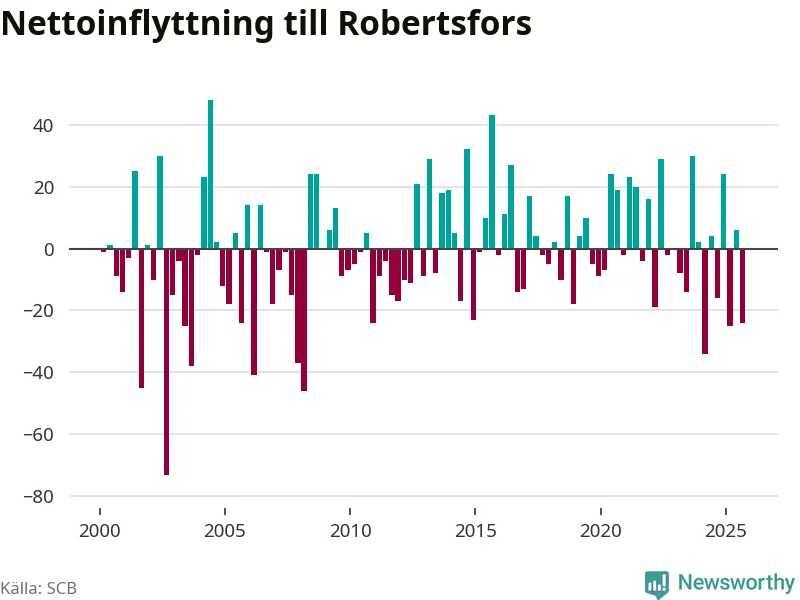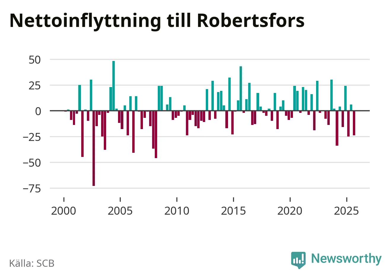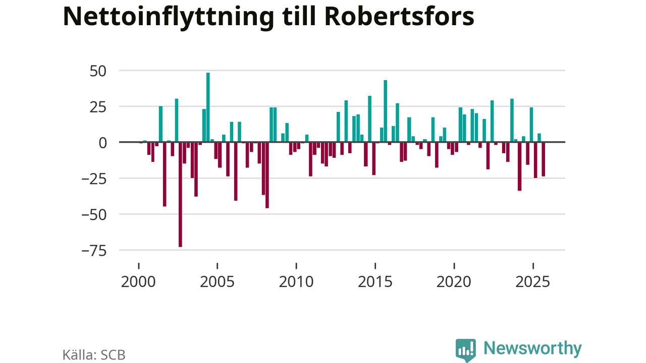 Under tredje kvartalet 2025 flyttade 107 personer till kommunen medan 131 personer flyttade därifrån. Det är historiskt sett en stor utflyttning under ett kvartal. Sedan seklets början har Robertsfors haft ungefär lika många kvartal med positivt flyttnetto som negativt.