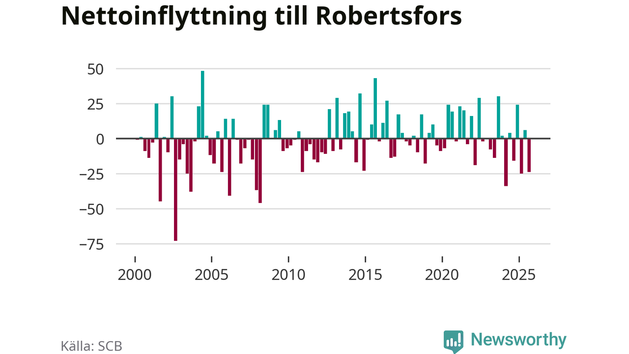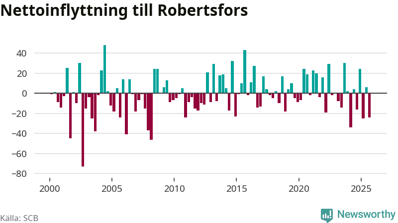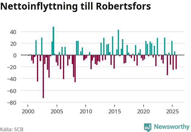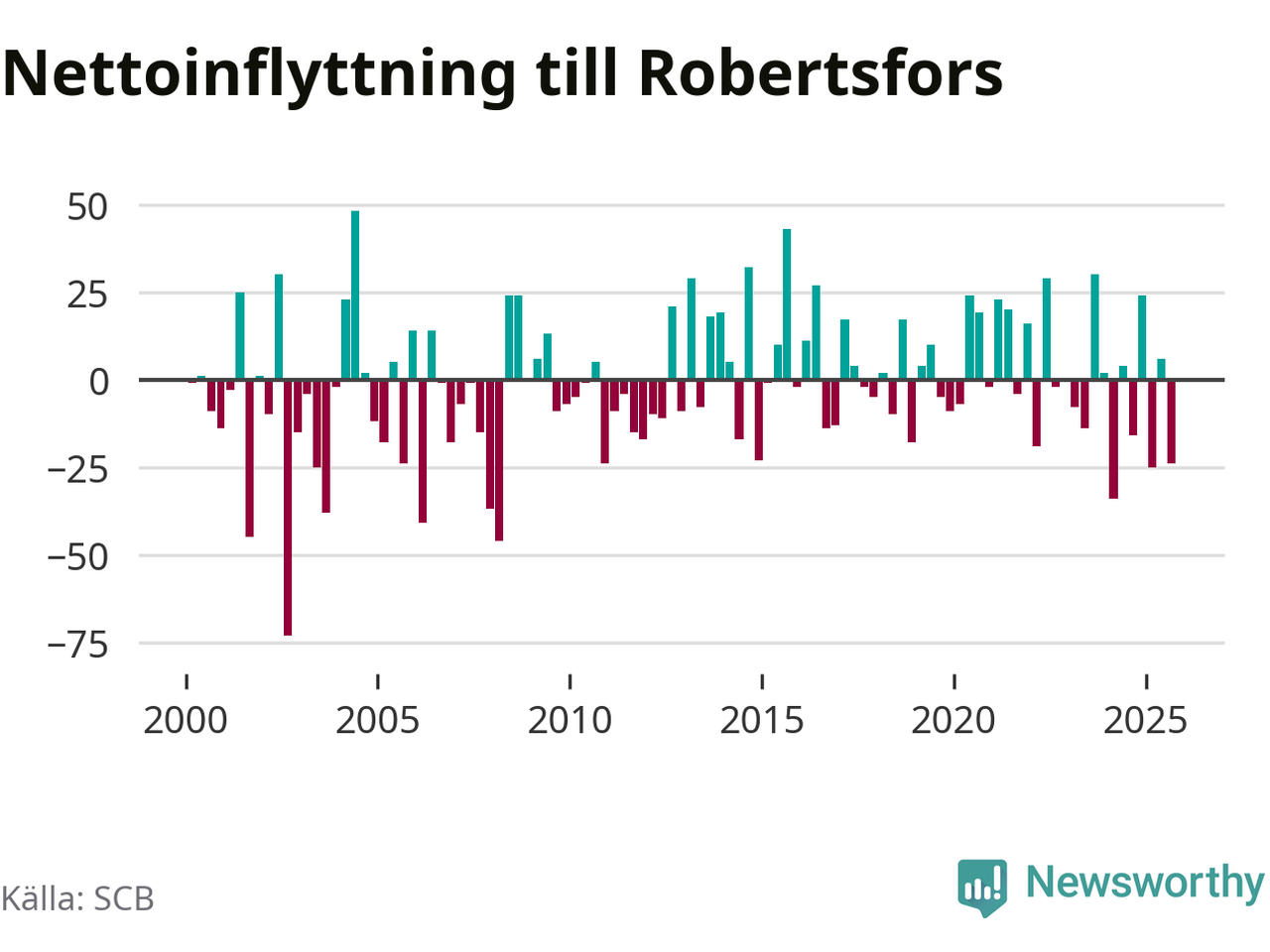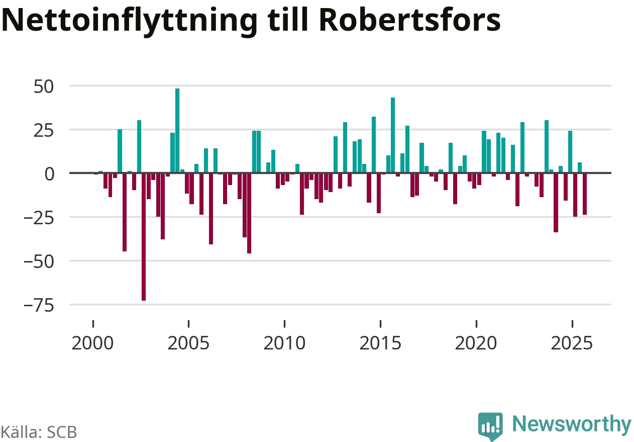 Under tredje kvartalet 2025 flyttade 107 personer till kommunen medan 131 personer flyttade därifrån. Det är historiskt sett en stor utflyttning under ett kvartal. Sedan seklets början har Robertsfors haft ungefär lika många kvartal med positivt flyttnetto som negativt.
