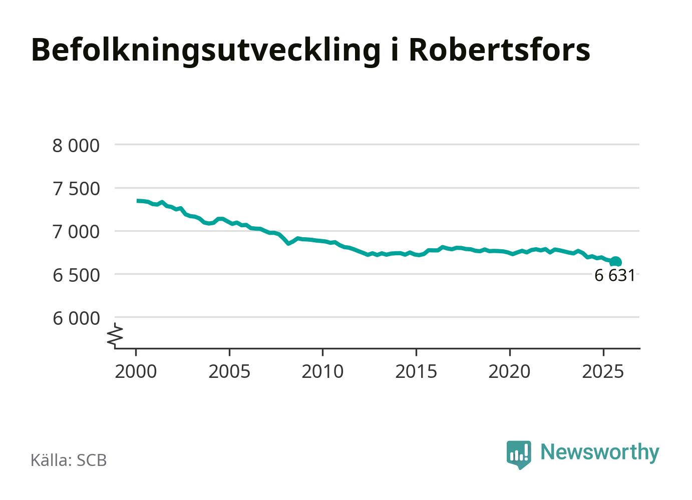 Jämfört med för ett år sedan har befolkningen i Robertsfors minskat med ungefär 50 personer – vilket motsvarar en nedgång på 0,7 procent. Sedan millennieskiftet har folkmängden minskat med runt 710 personer, eller 10 procent.