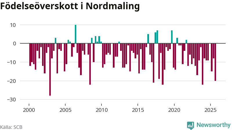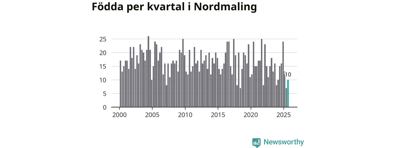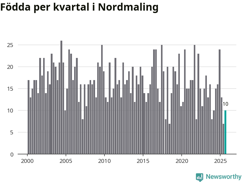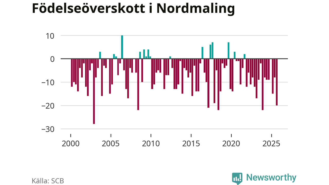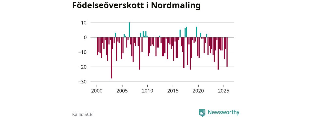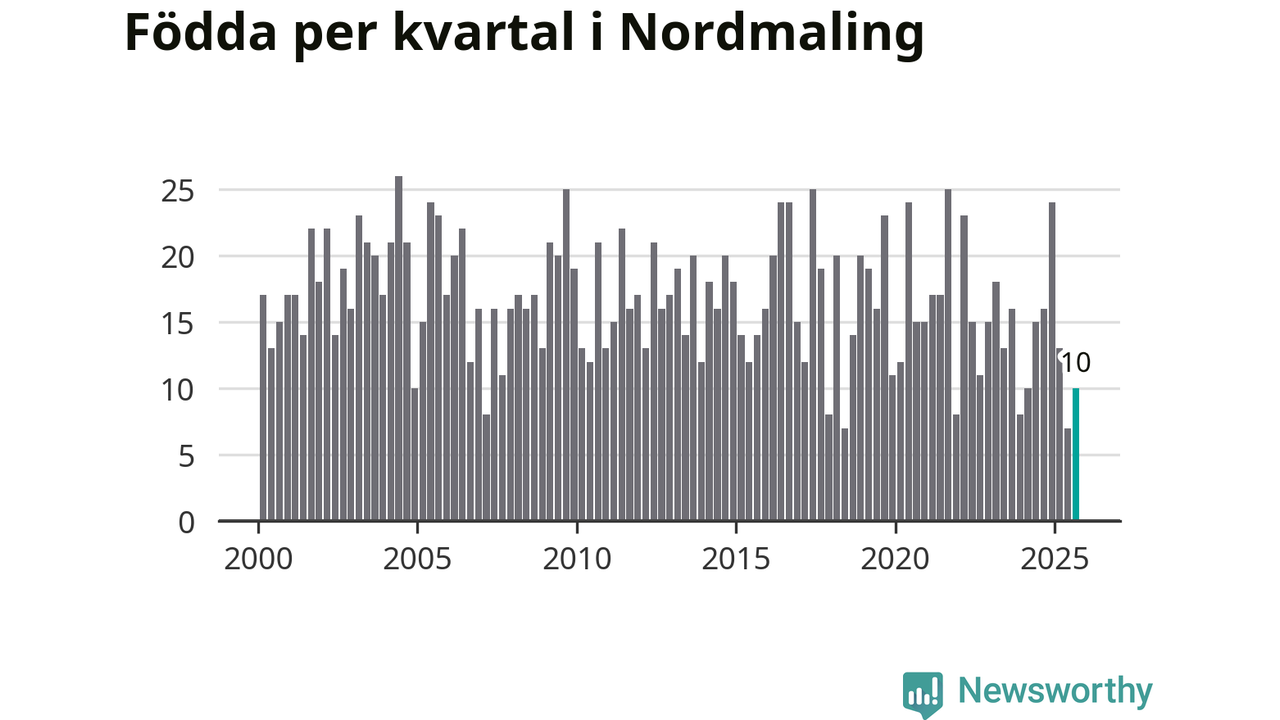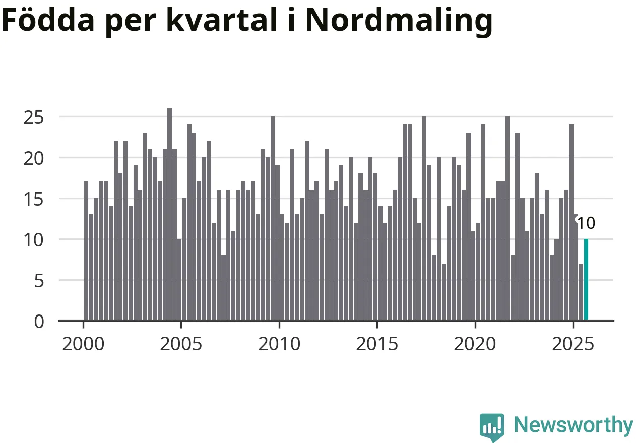 Enligt SCB:s siffror föddes tio barn i Nordmaling under det senaste kvartalet. Samtidigt avled relativt många – 30 personer. Nordmaling hade alltså ett negativt födelsenetto, vilket kommunen historiskt sett nästan alltid har haft.
