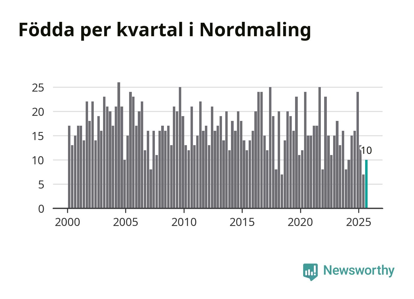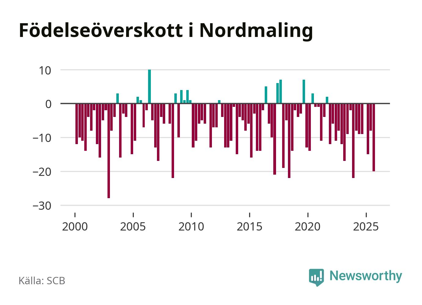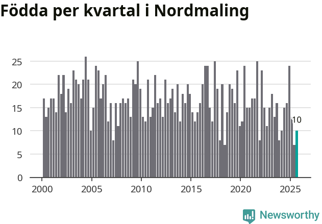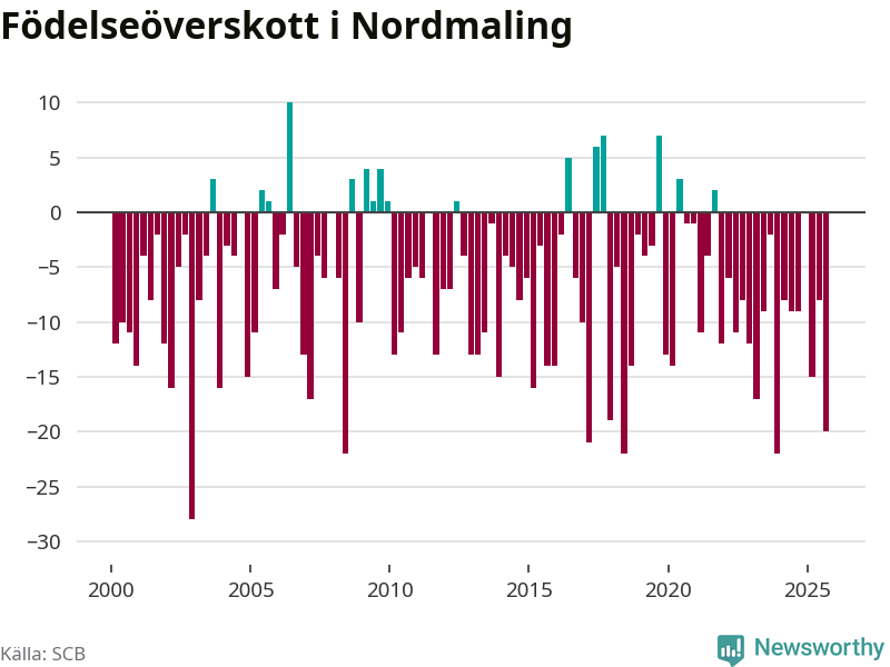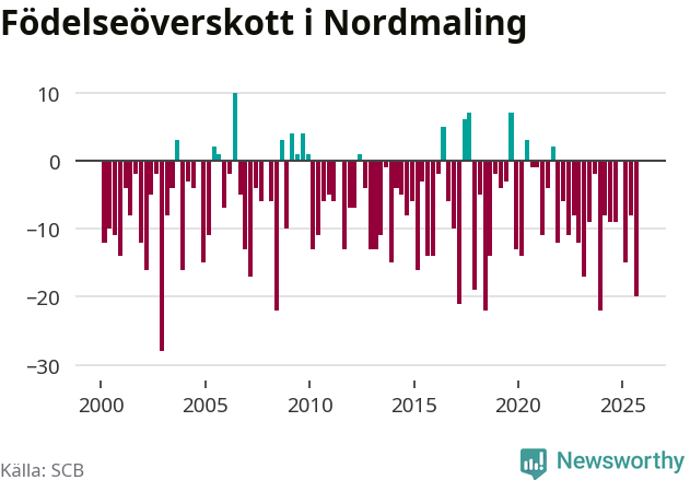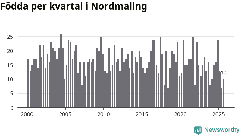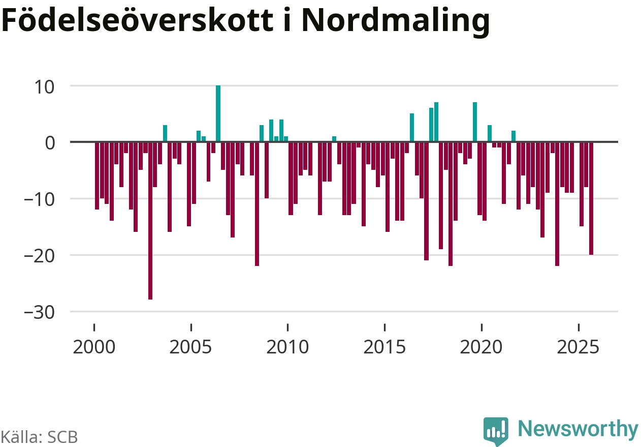 Enligt SCB:s siffror föddes tio barn i Nordmaling under det senaste kvartalet. Samtidigt avled relativt många – 30 personer. Nordmaling hade alltså ett negativt födelsenetto, vilket kommunen historiskt sett nästan alltid har haft.