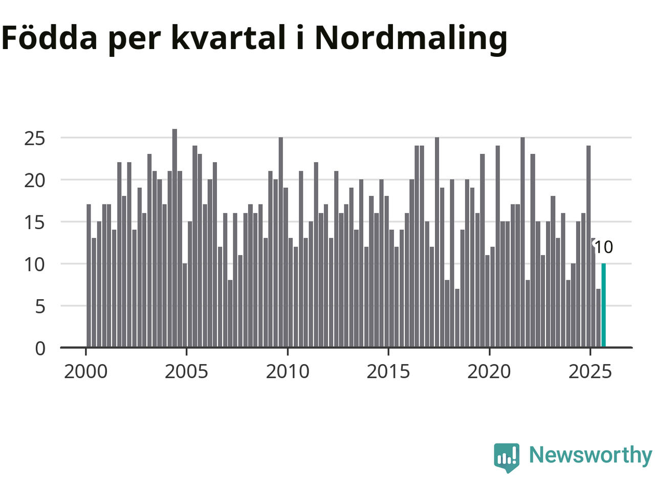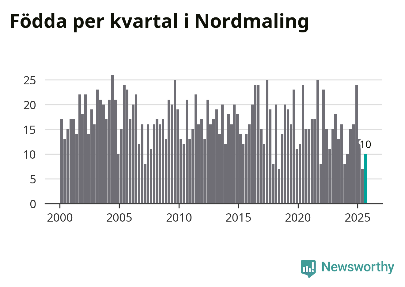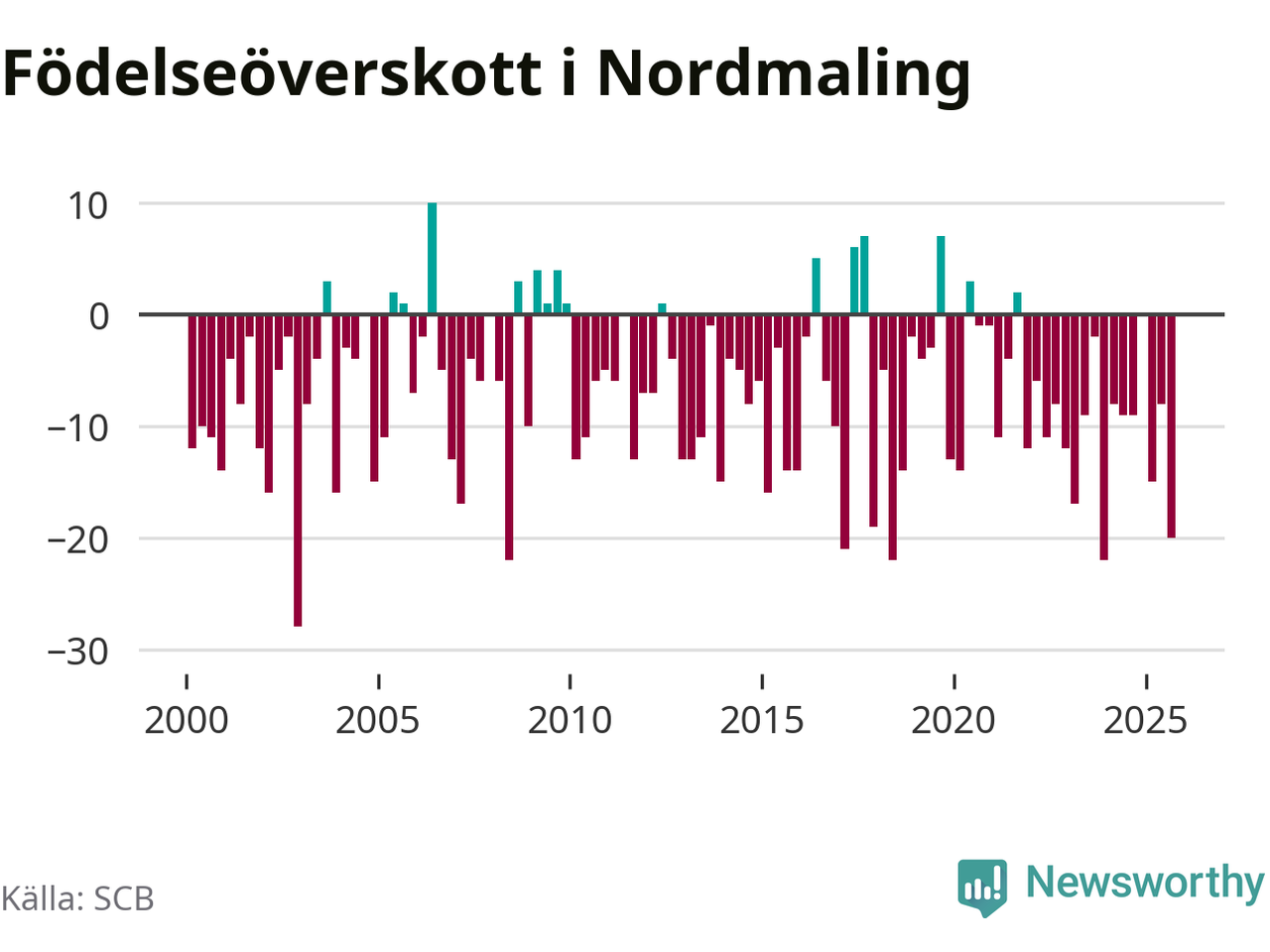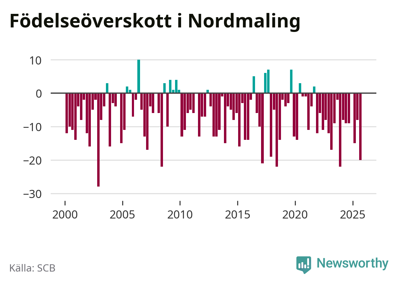 Enligt SCB:s siffror föddes tio barn i Nordmaling under det senaste kvartalet. Samtidigt avled relativt många – 30 personer. Nordmaling hade alltså ett negativt födelsenetto, vilket kommunen historiskt sett nästan alltid har haft.