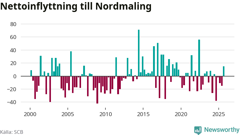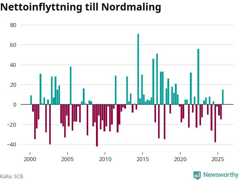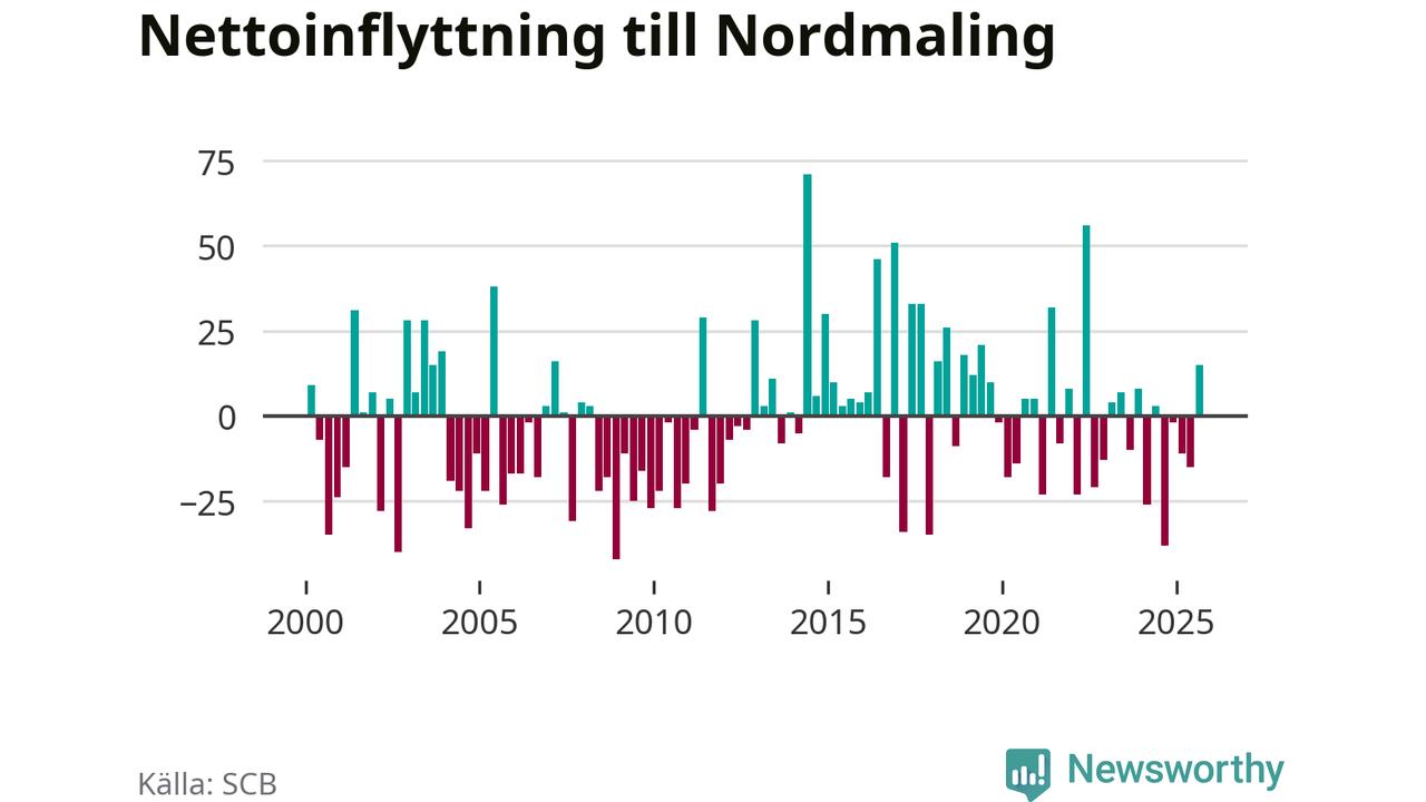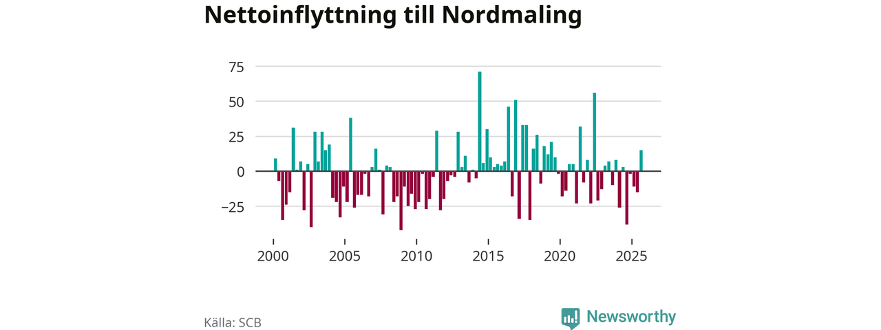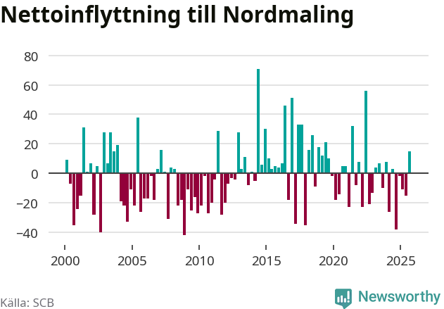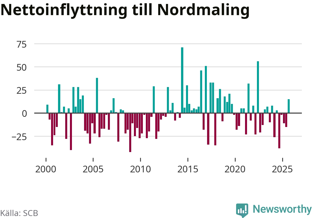 Under tredje kvartalet 2025 flyttade 93 personer till kommunen medan 78 personer flyttade därifrån. Sedan seklets början har Nordmaling oftast haft ett positivt flyttnetto, inklusive det senaste kvartalet.