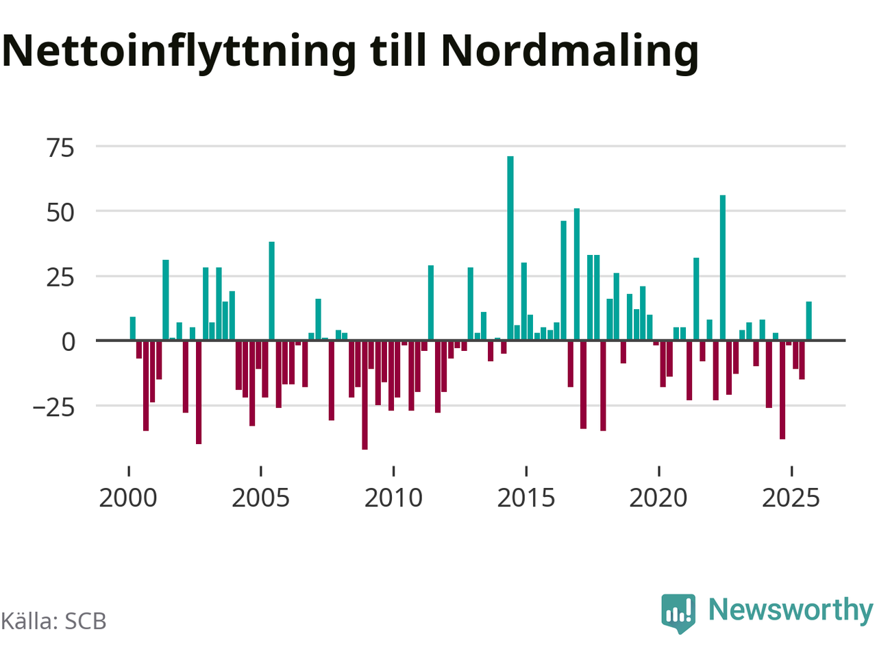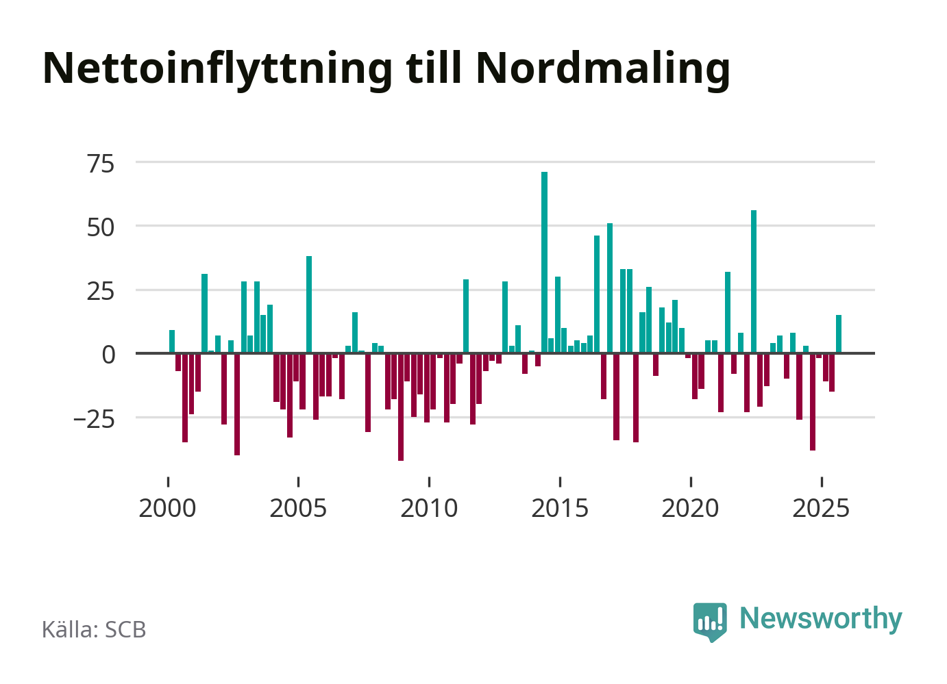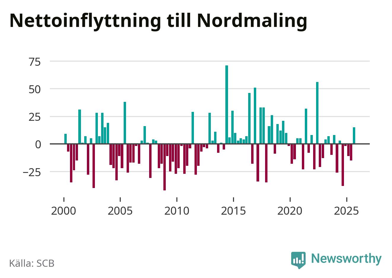 Under tredje kvartalet 2025 flyttade 93 personer till kommunen medan 78 personer flyttade därifrån. Sedan seklets början har Nordmaling oftast haft ett positivt flyttnetto, inklusive det senaste kvartalet.
