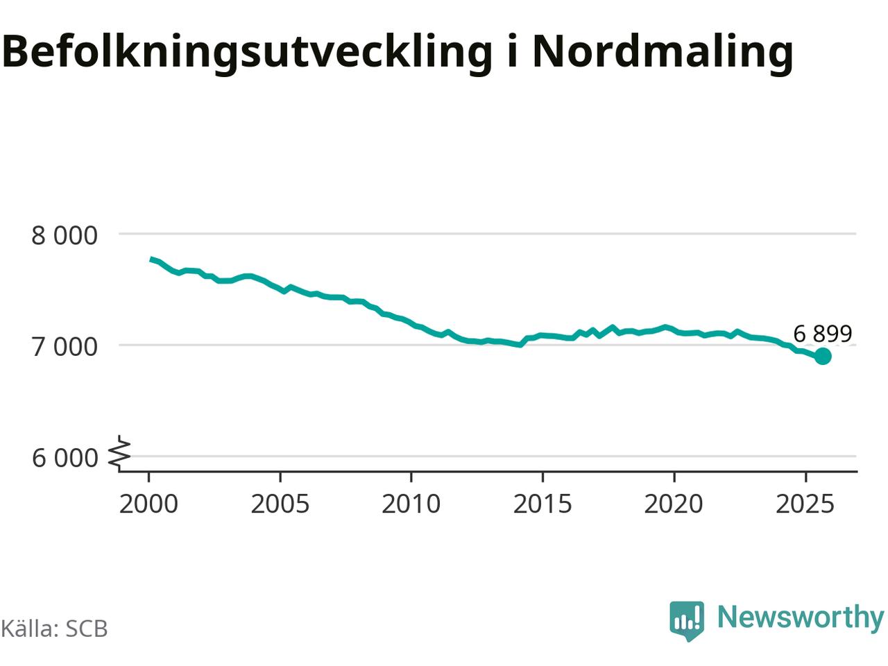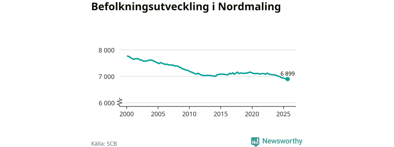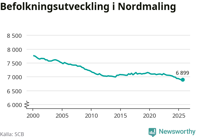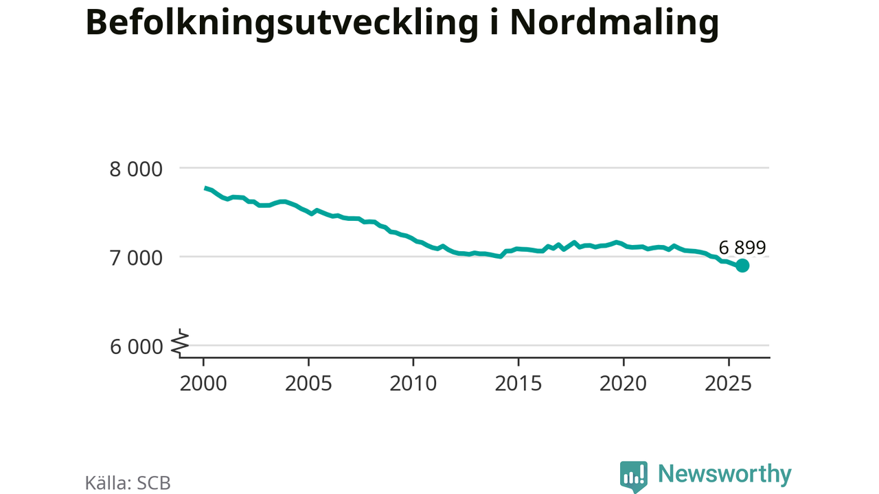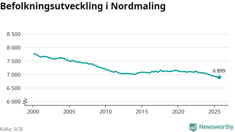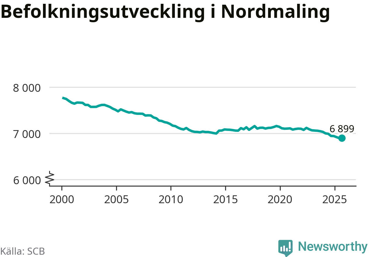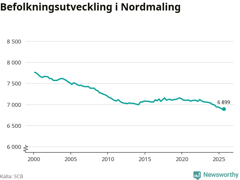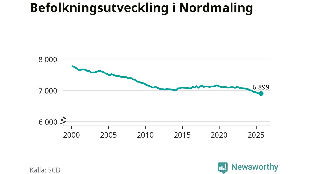 Jämfört med för ett år sedan har befolkningen i Nordmaling minskat med knappt 50 personer – vilket motsvarar en nedgång på 0,6 procent. Sedan millennieskiftet har folkmängden minskat med runt 860 personer, eller 11 procent.