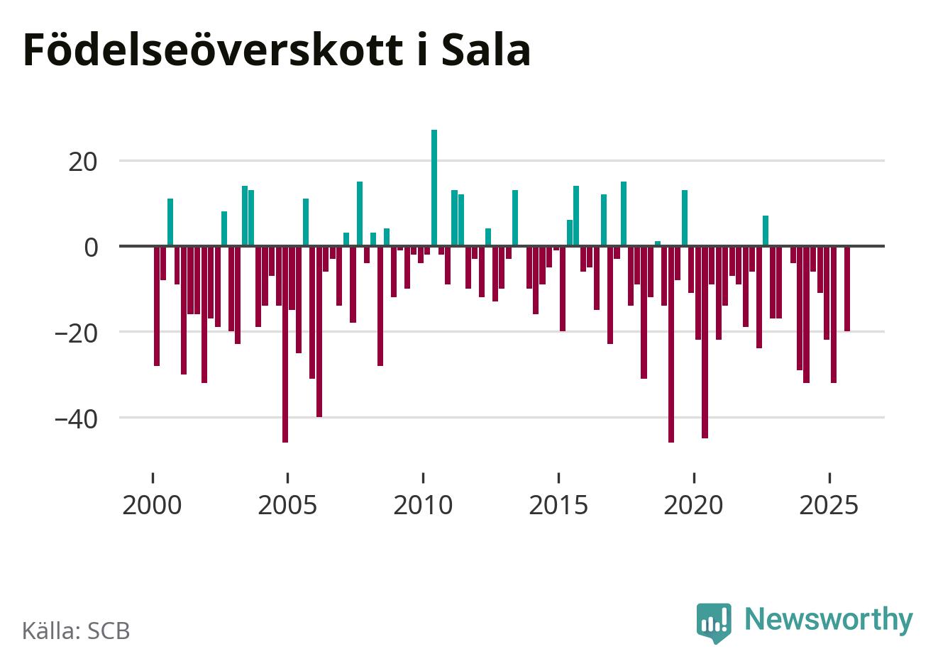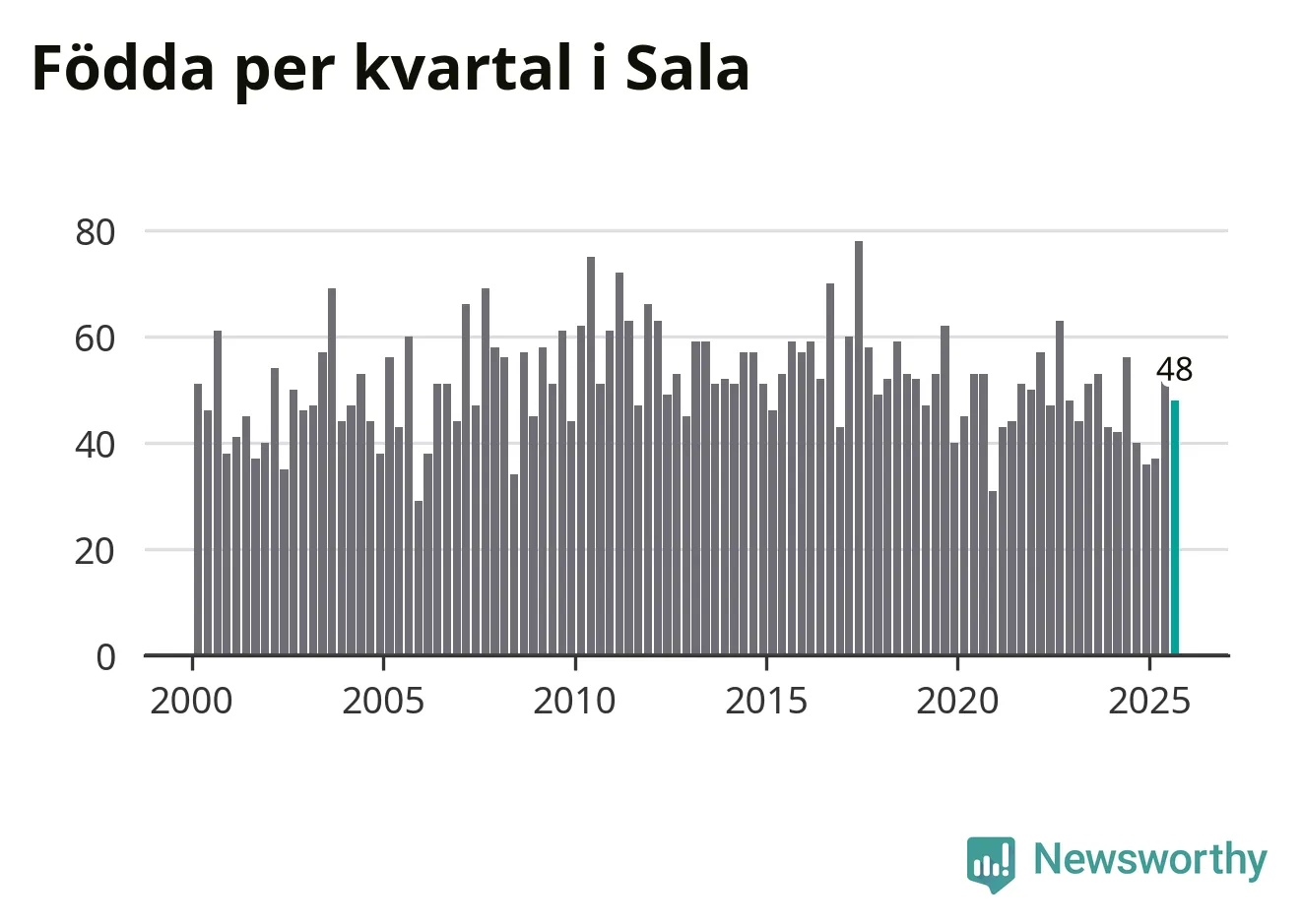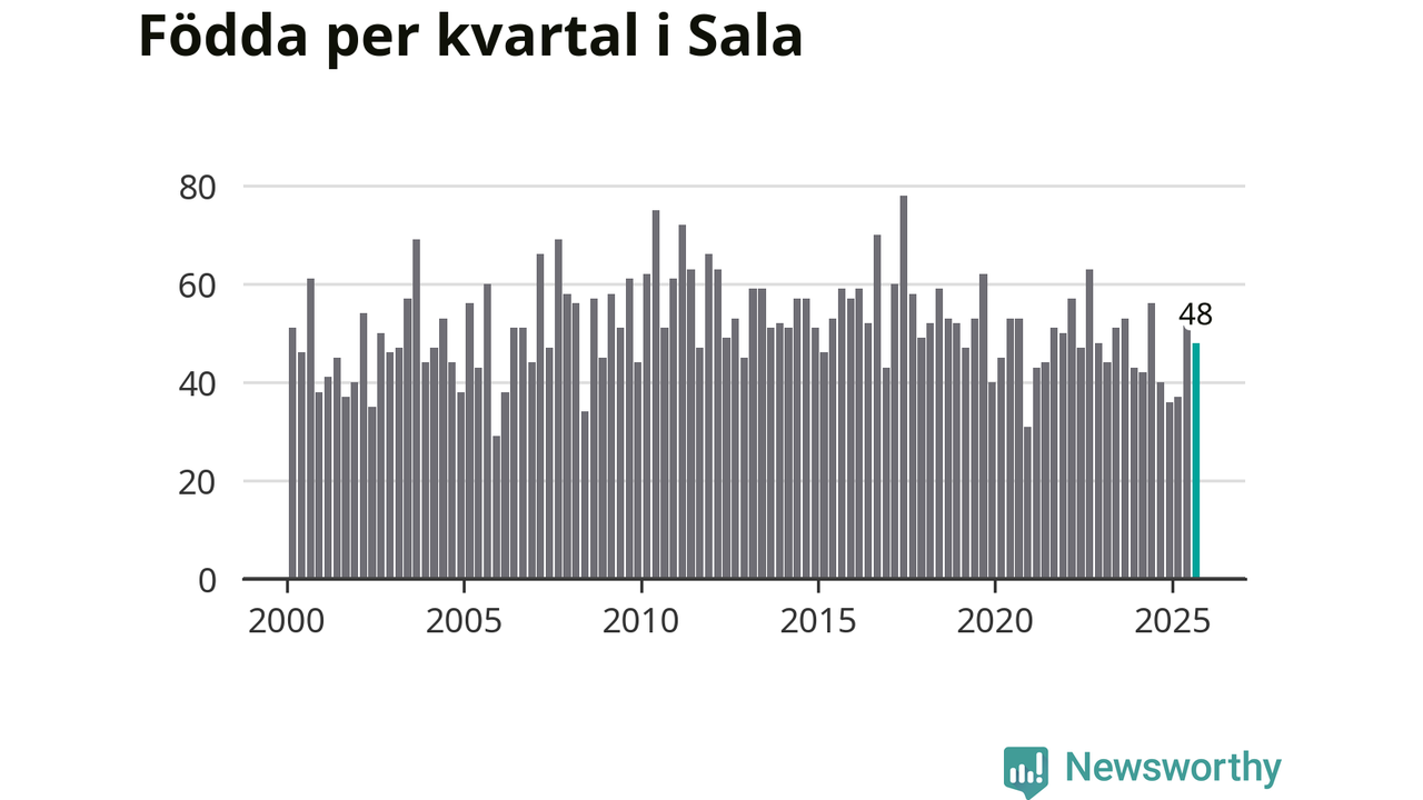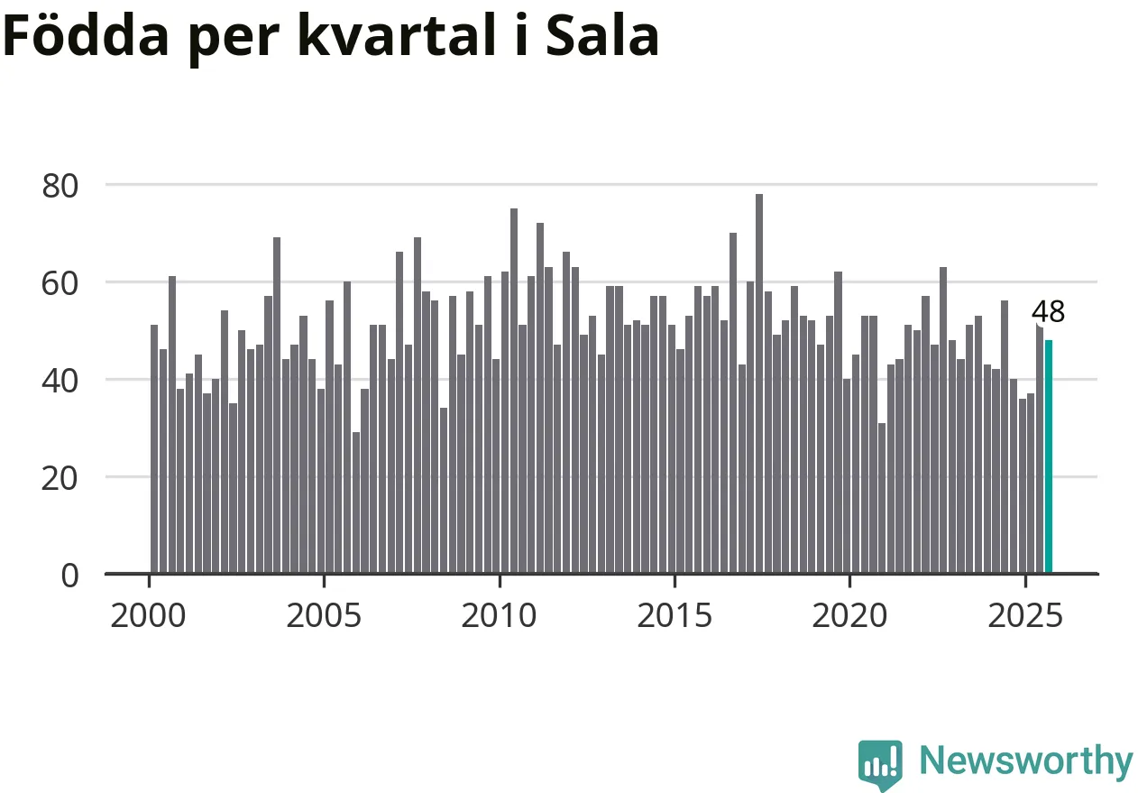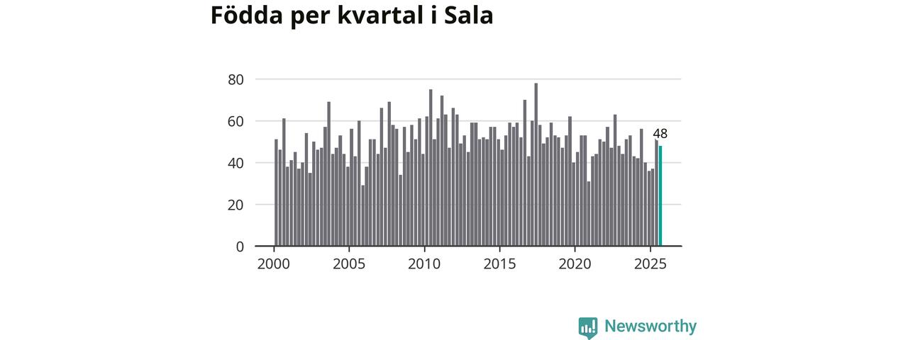 Enligt SCB:s siffror föddes 48 barn i Sala under det senaste kvartalet. Samtidigt avled 68 personer. Sala hade alltså ett negativt födelsenetto, vilket kommunen historiskt sett nästan alltid har haft.