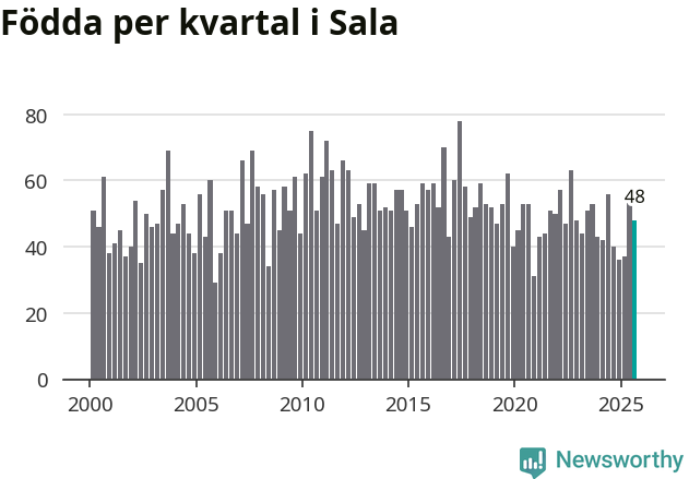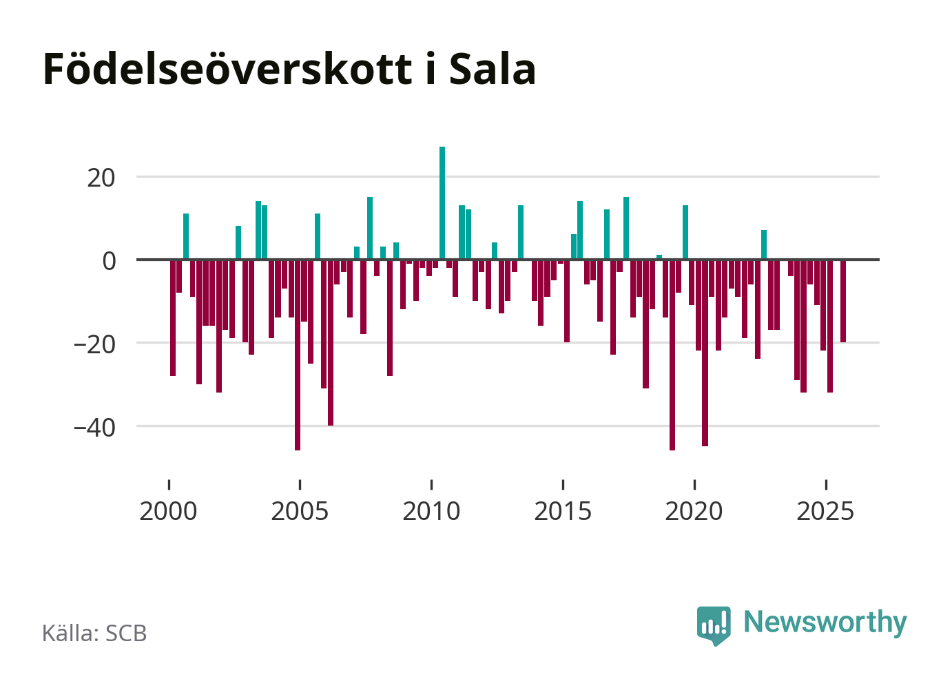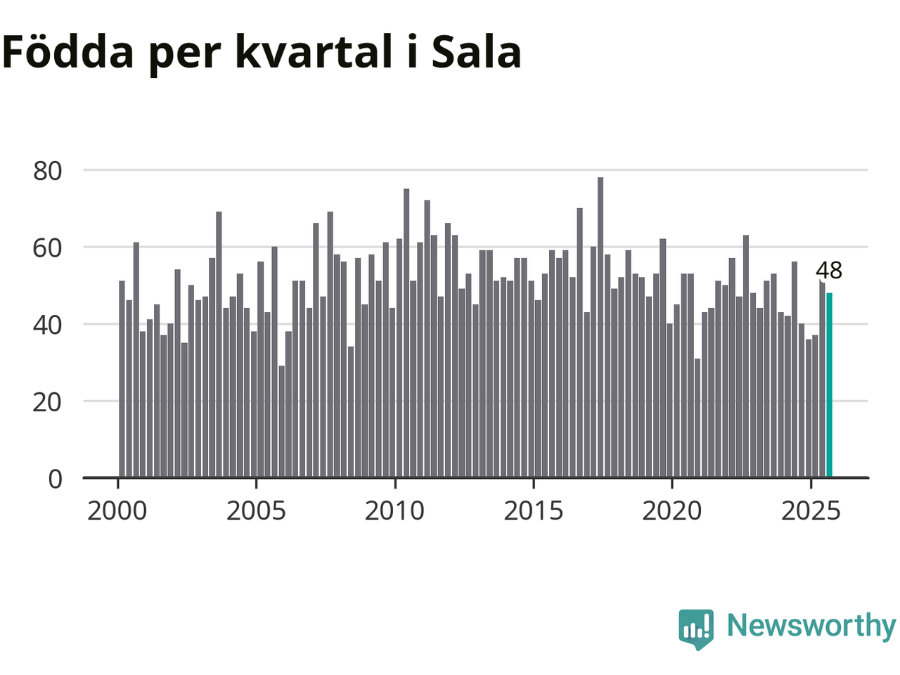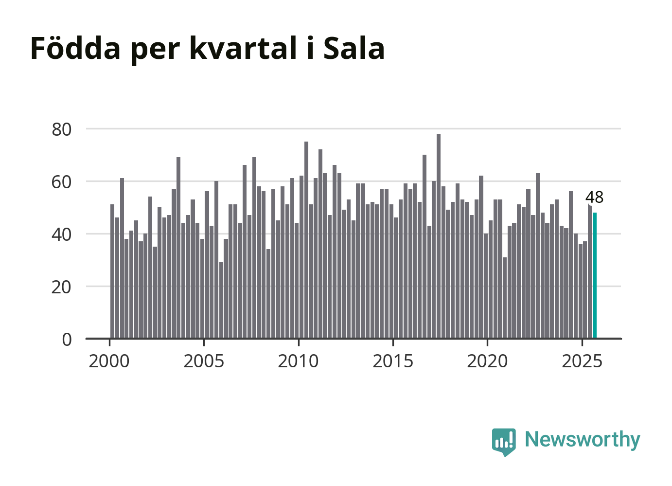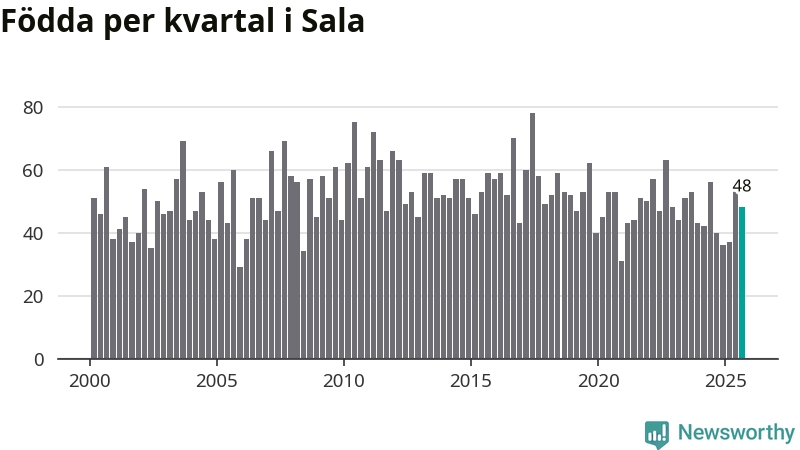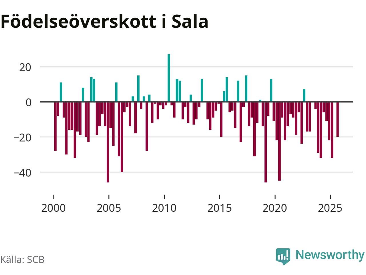 Enligt SCB:s siffror föddes 48 barn i Sala under det senaste kvartalet. Samtidigt avled 68 personer. Sala hade alltså ett negativt födelsenetto, vilket kommunen historiskt sett nästan alltid har haft.