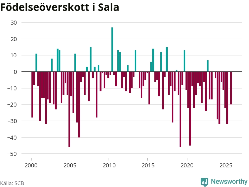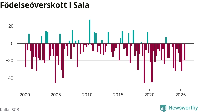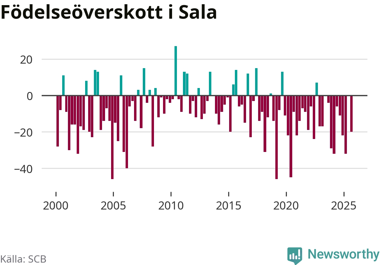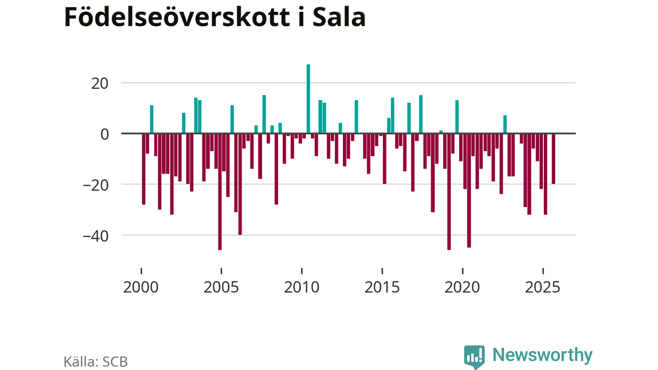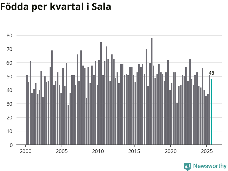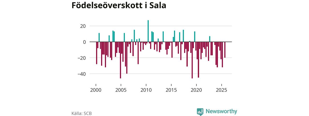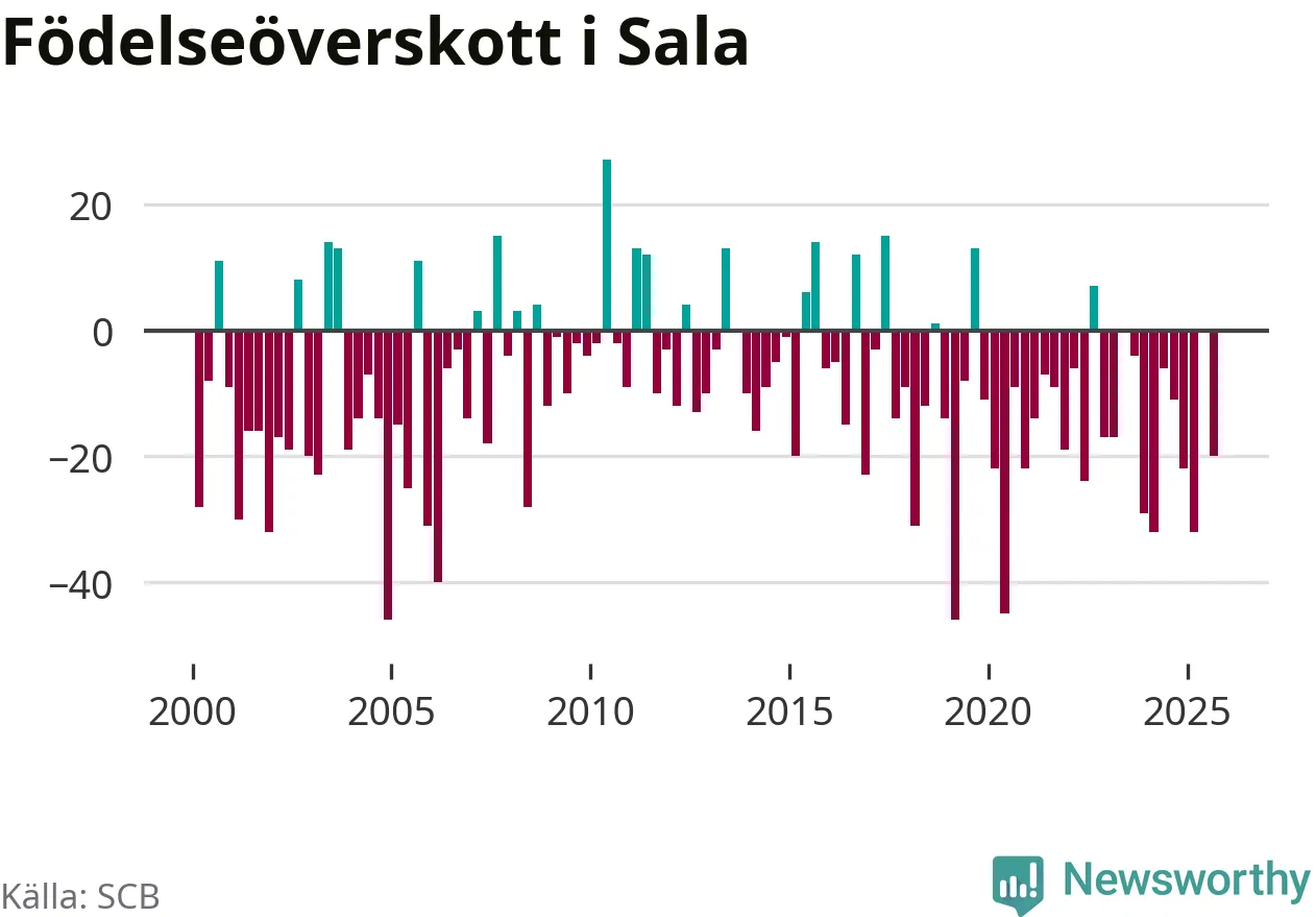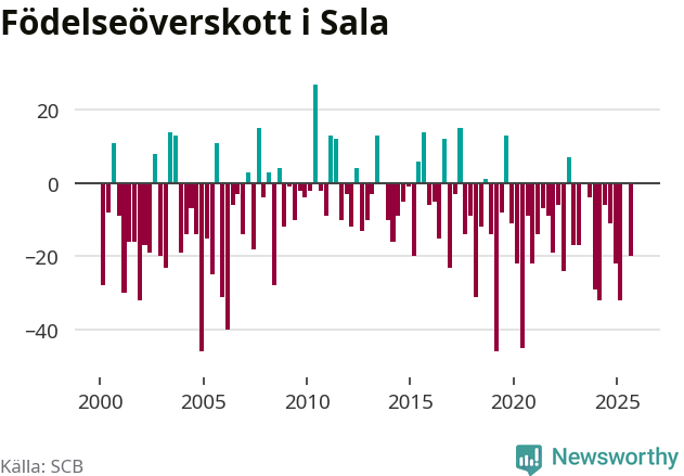 Enligt SCB:s siffror föddes 48 barn i Sala under det senaste kvartalet. Samtidigt avled 68 personer. Sala hade alltså ett negativt födelsenetto, vilket kommunen historiskt sett nästan alltid har haft.