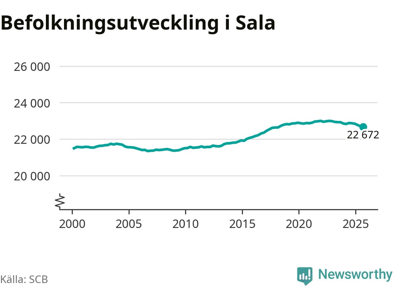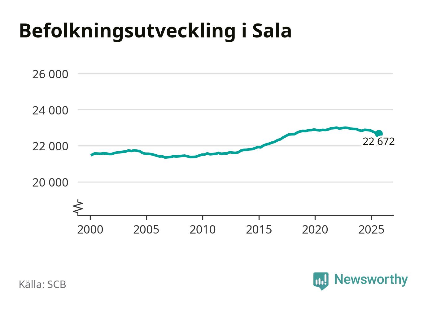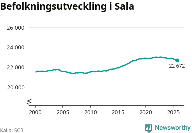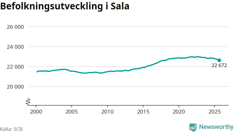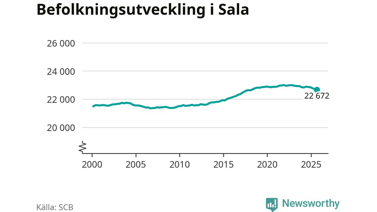 Befolkningen minskade i Sala kommun under det tredje kvartalet 2025. Den 30 september bodde enligt SCB:s senaste siffror 22 672 personer i kommunen, vilket är 33 färre än i slutet av andra kvartalet.
