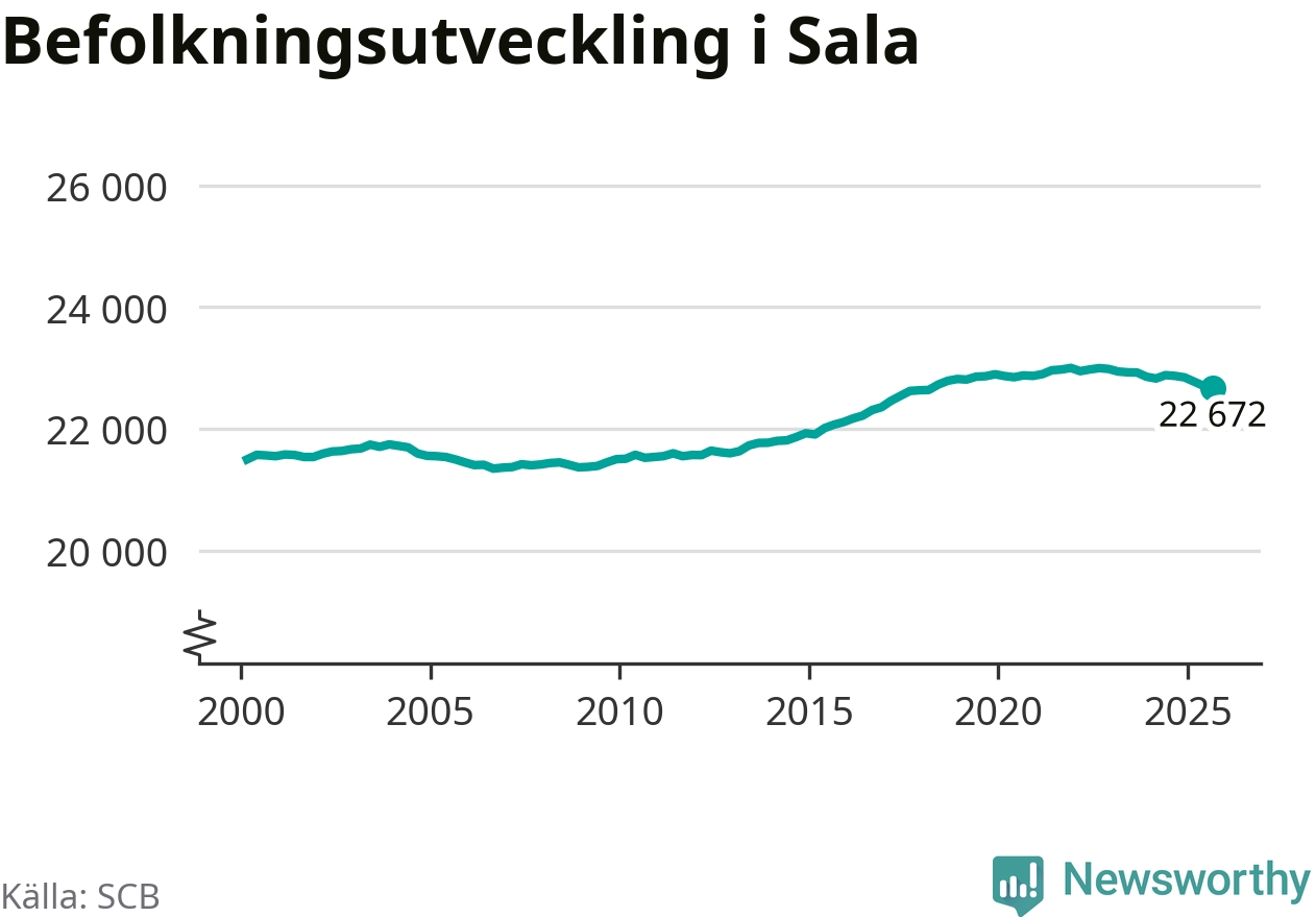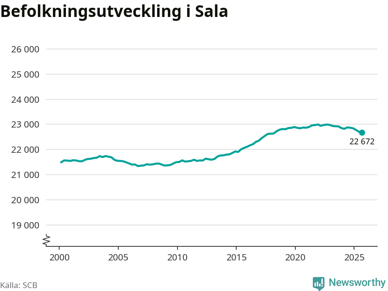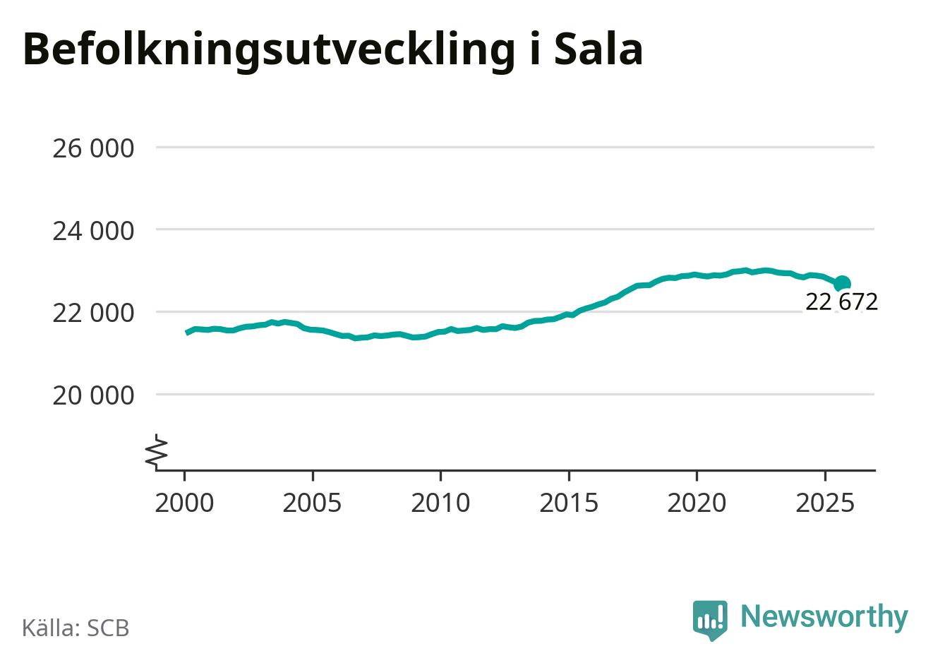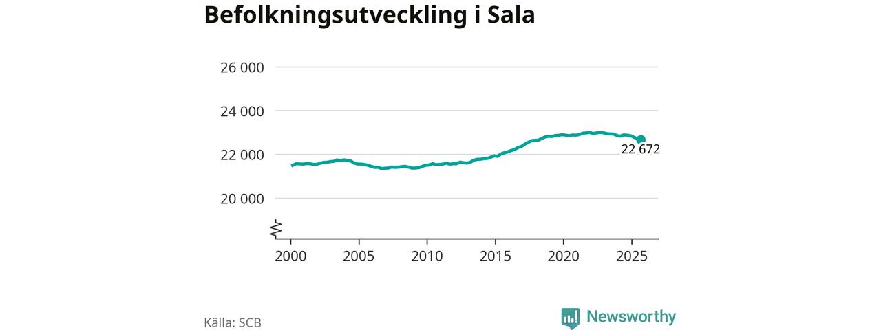 Befolkningen minskade i Sala kommun under det tredje kvartalet 2025. Den 30 september bodde enligt SCB:s senaste siffror 22 672 personer i kommunen, vilket är 33 färre än i slutet av andra kvartalet.