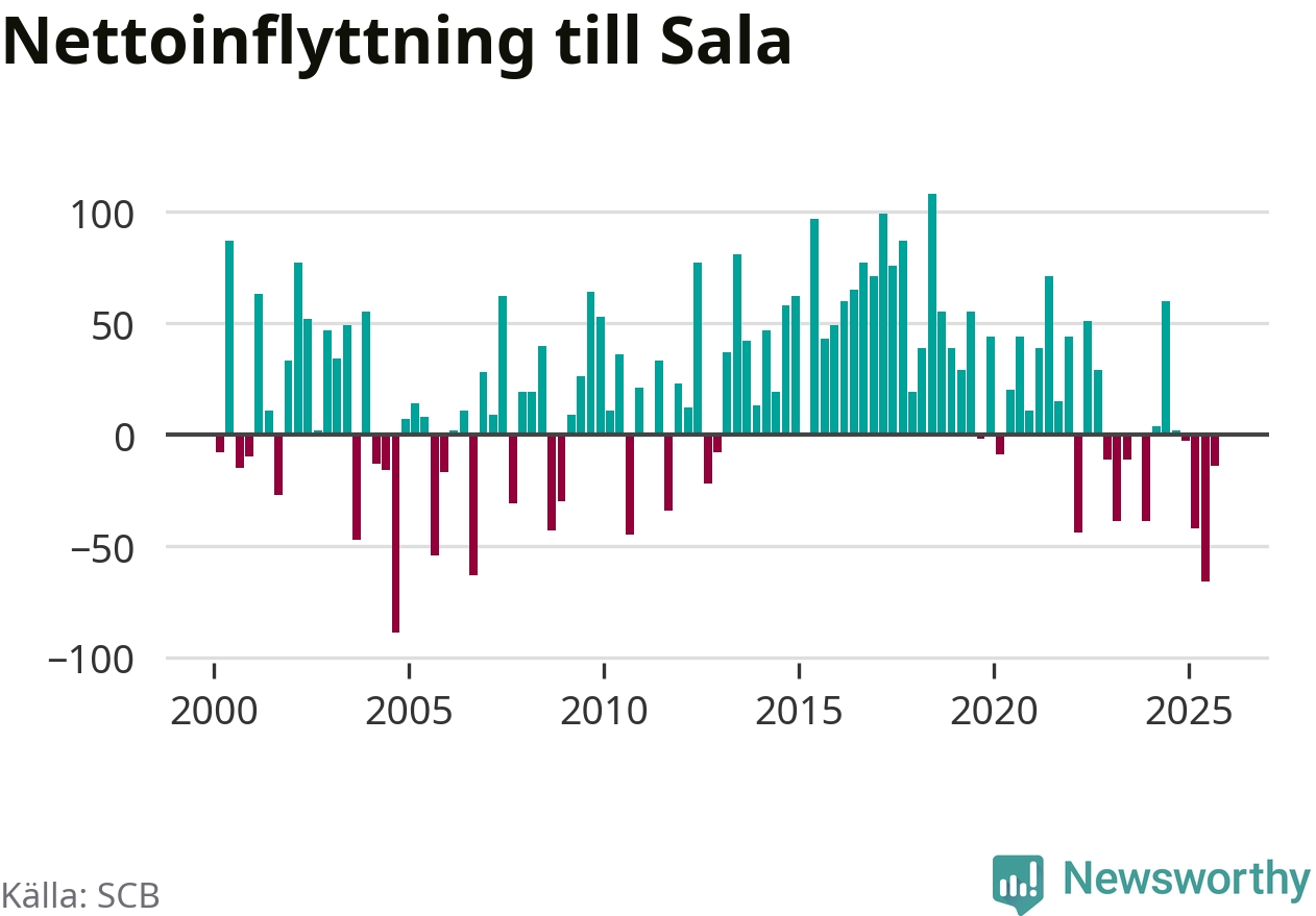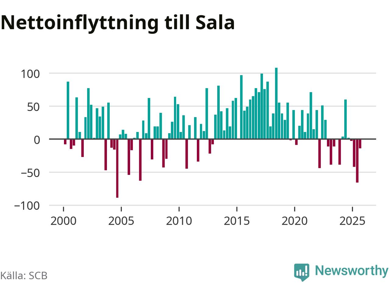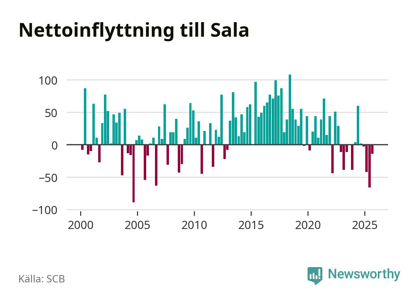 Under tredje kvartalet 2025 flyttade 297 personer till kommunen medan 311 personer flyttade därifrån. Det är historiskt sett en stor utflyttning under ett kvartal. Sedan seklets början har Sala oftast haft ett positivt flyttnetto.