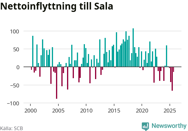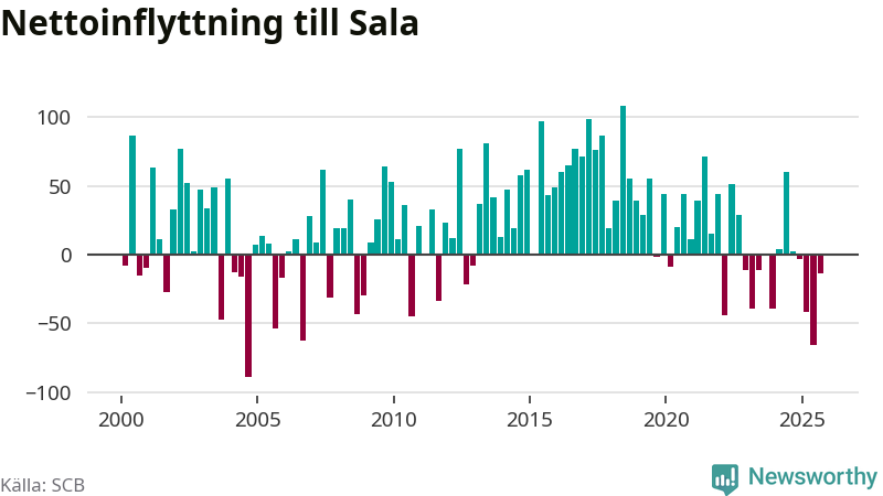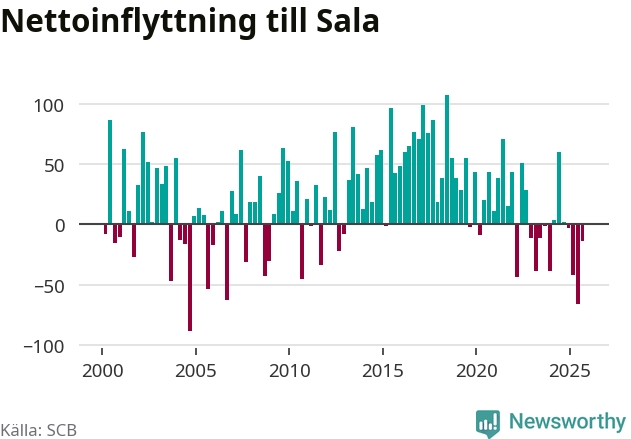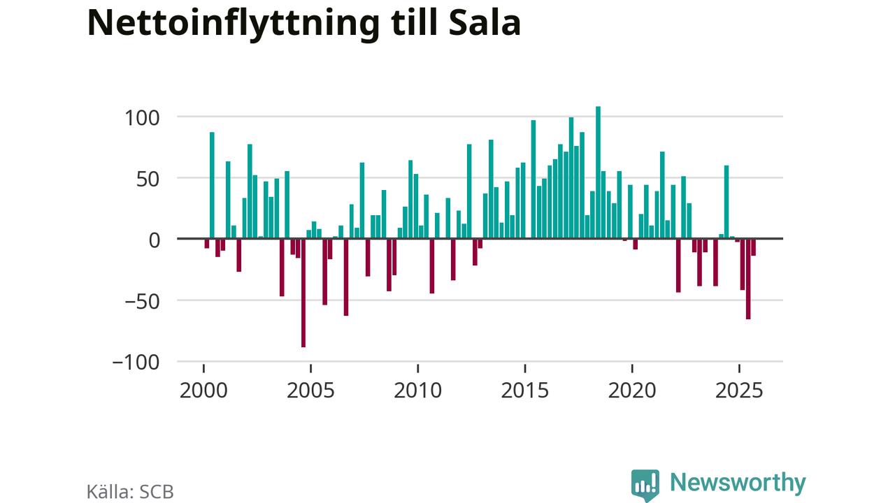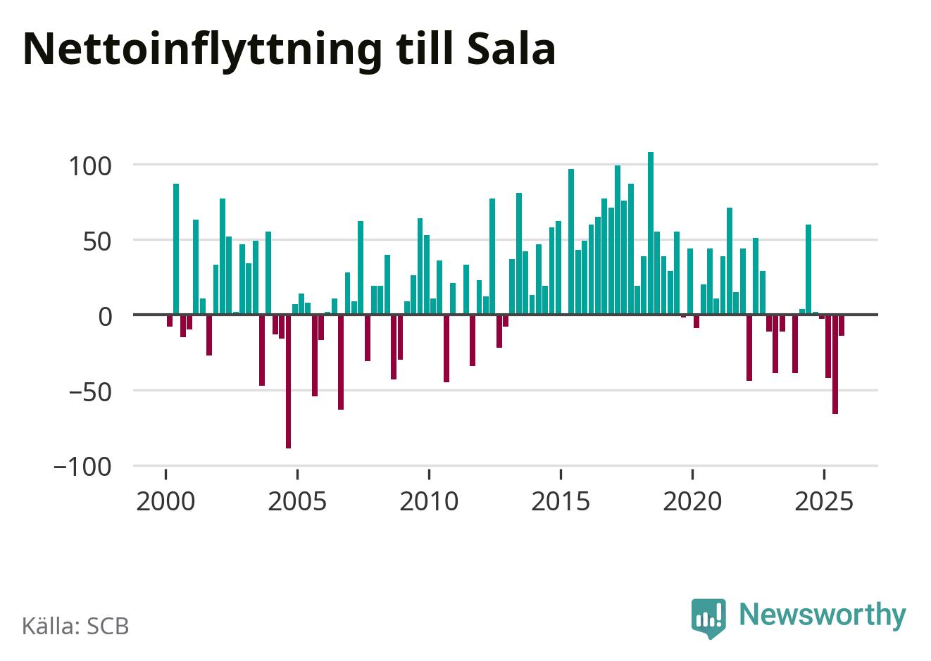 Under tredje kvartalet 2025 flyttade 297 personer till kommunen medan 311 personer flyttade därifrån. Det är historiskt sett en stor utflyttning under ett kvartal. Sedan seklets början har Sala oftast haft ett positivt flyttnetto.