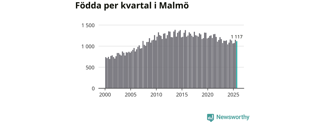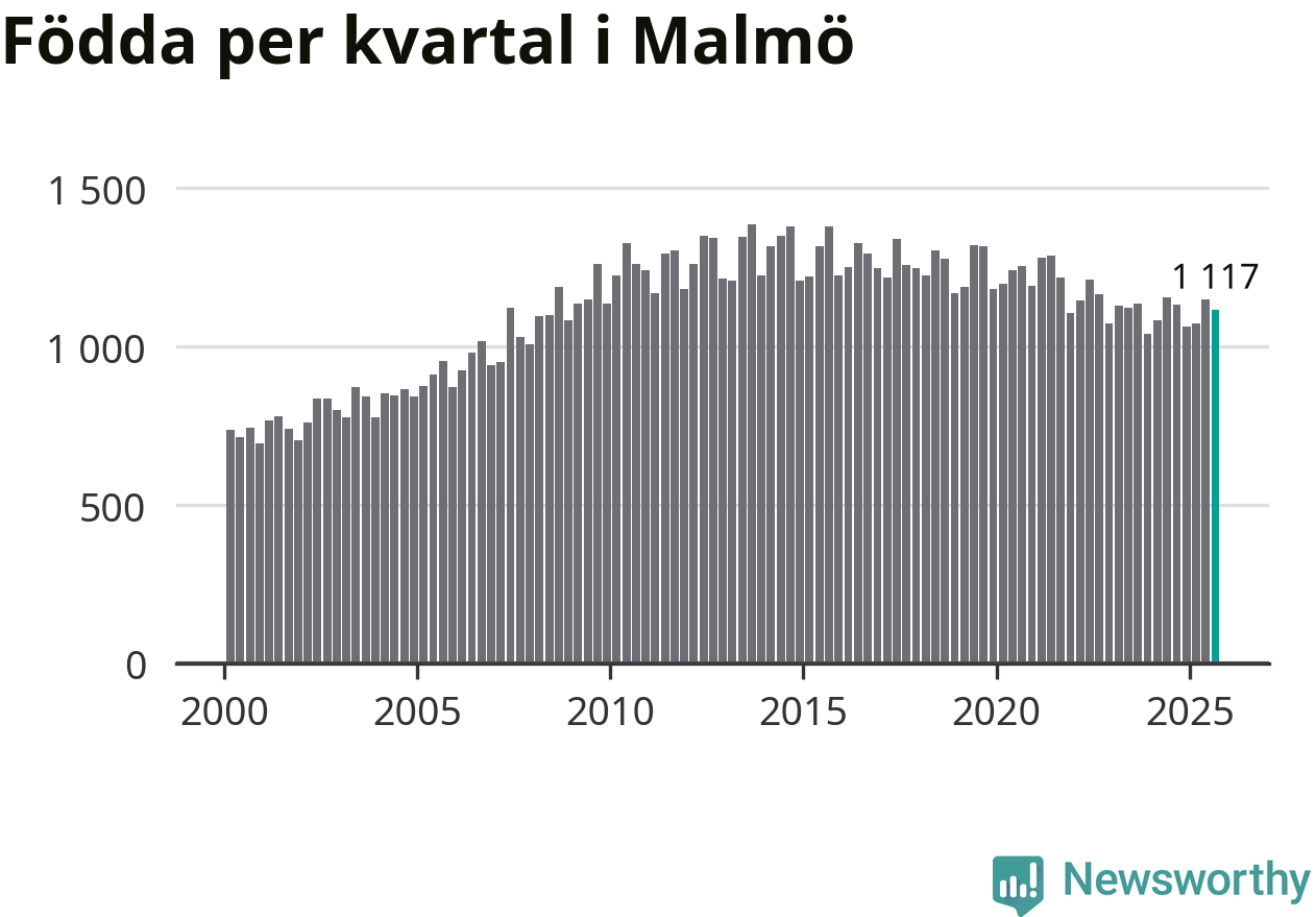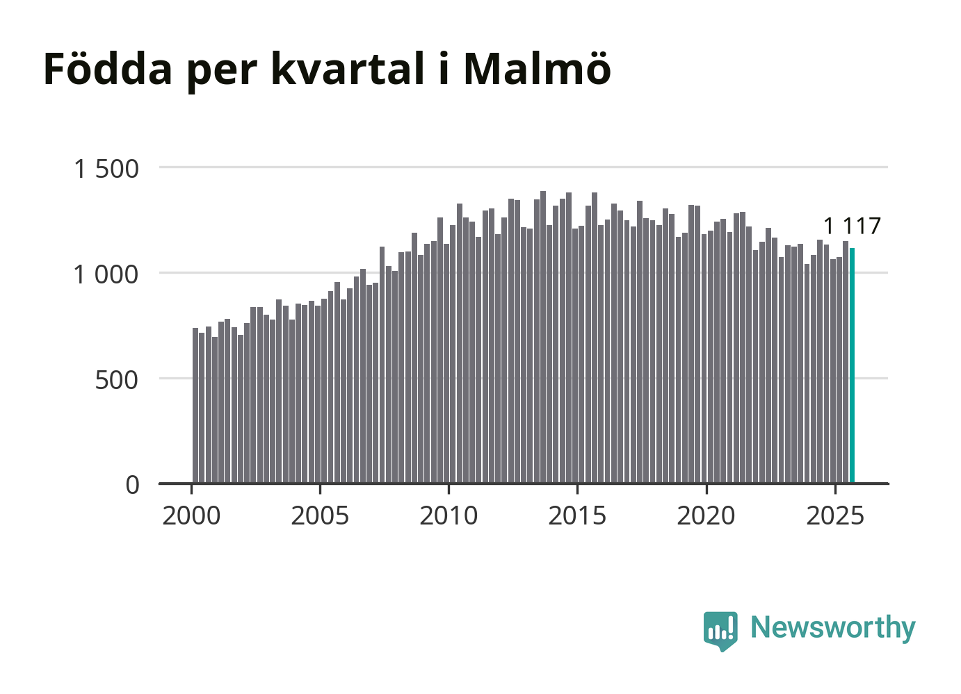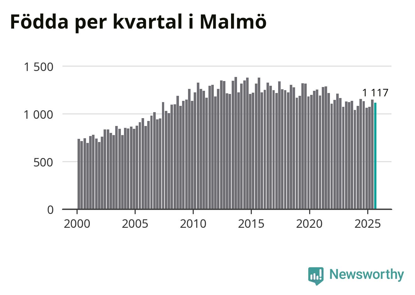 Enligt SCB:s siffror föddes 1 117 barn i Malmö under det senaste kvartalet. Samtidigt avled relativt få – 590 personer. Malmö hade alltså ett positivt födelsenetto, vilket kommunen historiskt sett i princip alltid har haft.
