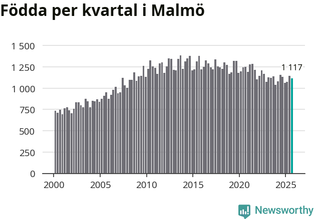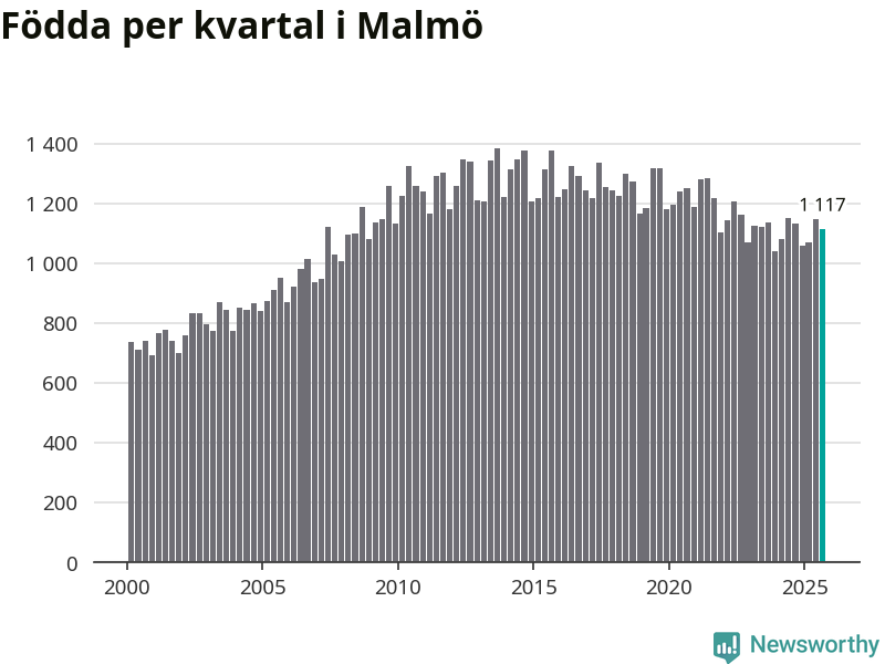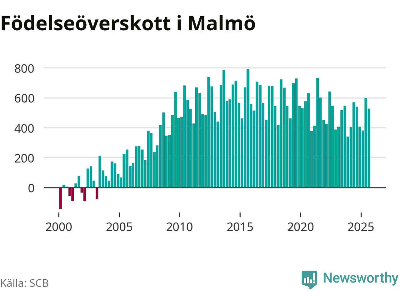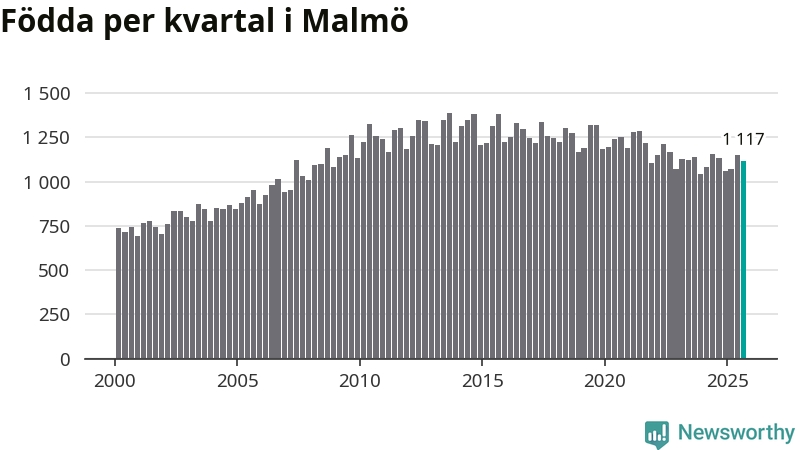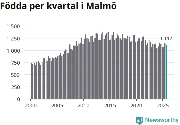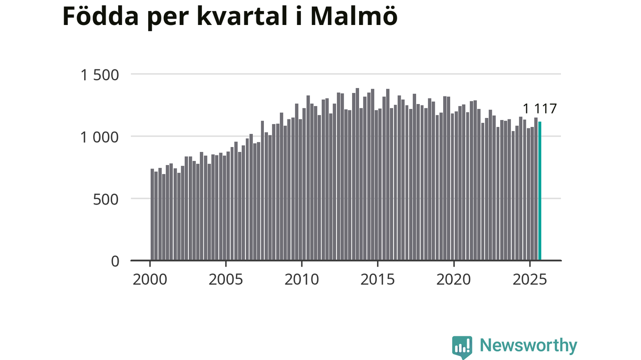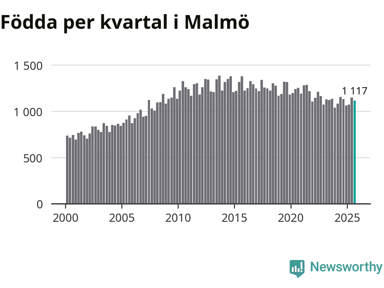 Enligt SCB:s siffror föddes 1 117 barn i Malmö under det senaste kvartalet. Samtidigt avled relativt få – 590 personer. Malmö hade alltså ett positivt födelsenetto, vilket kommunen historiskt sett i princip alltid har haft.