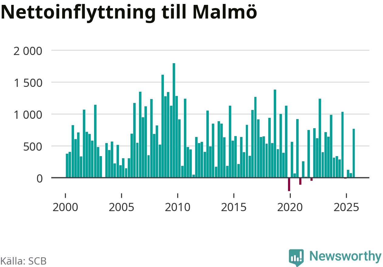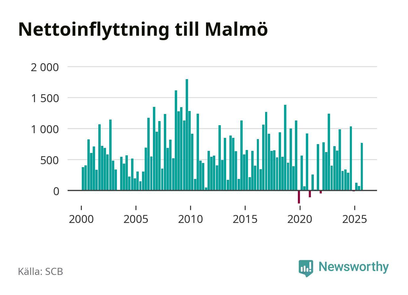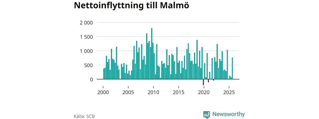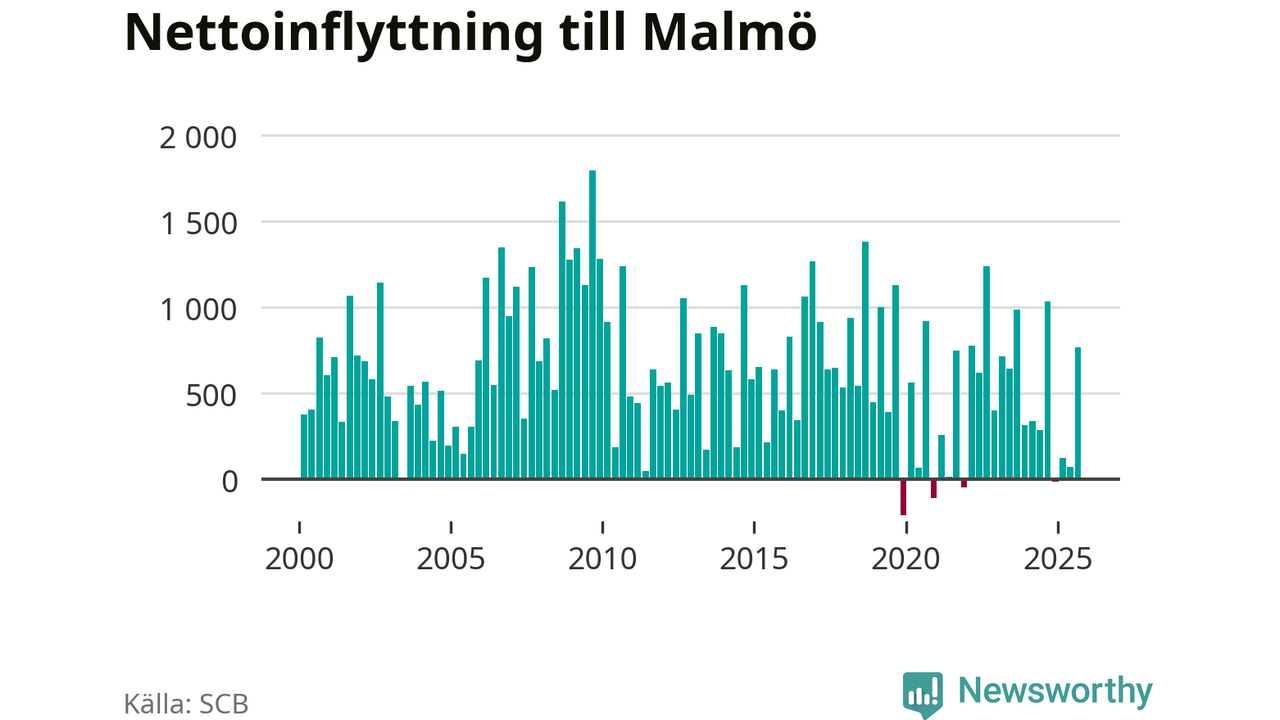 Under tredje kvartalet 2025 flyttade 7 133 personer till kommunen medan 6 367 personer flyttade därifrån. Det är historiskt sett en stor inflyttning under ett kvartal – men samtidigt var utflyttningen relativt stor. Sedan seklets början har Malmö haft ett positivt flyttnetto under nästan alla kvartal, inklusive det senaste kvartalet.