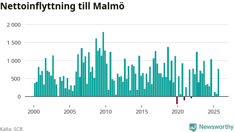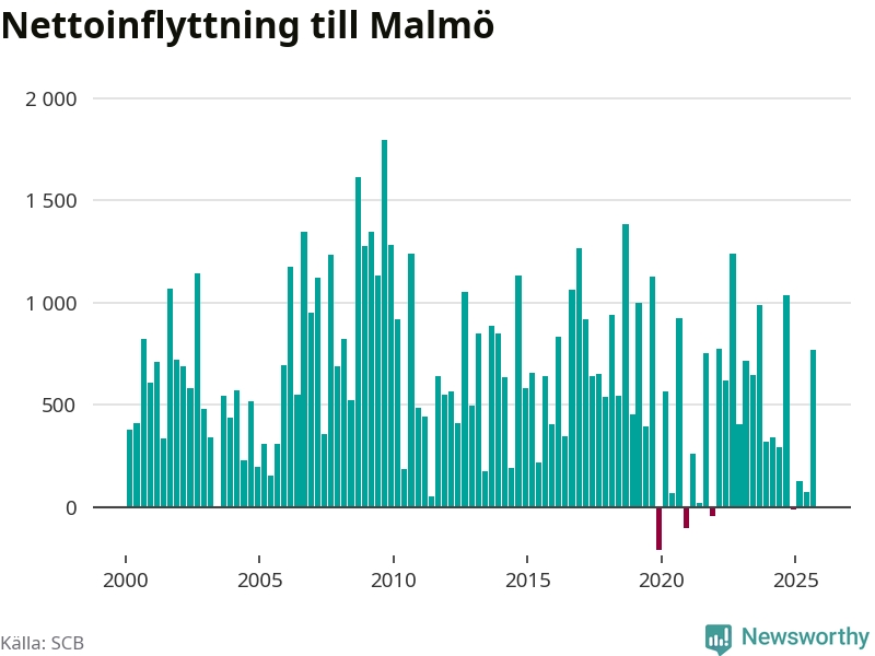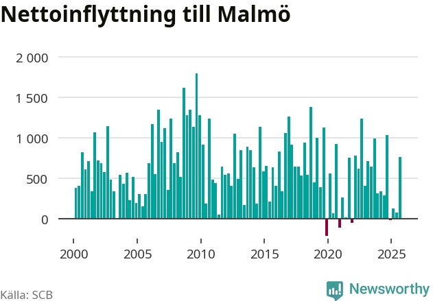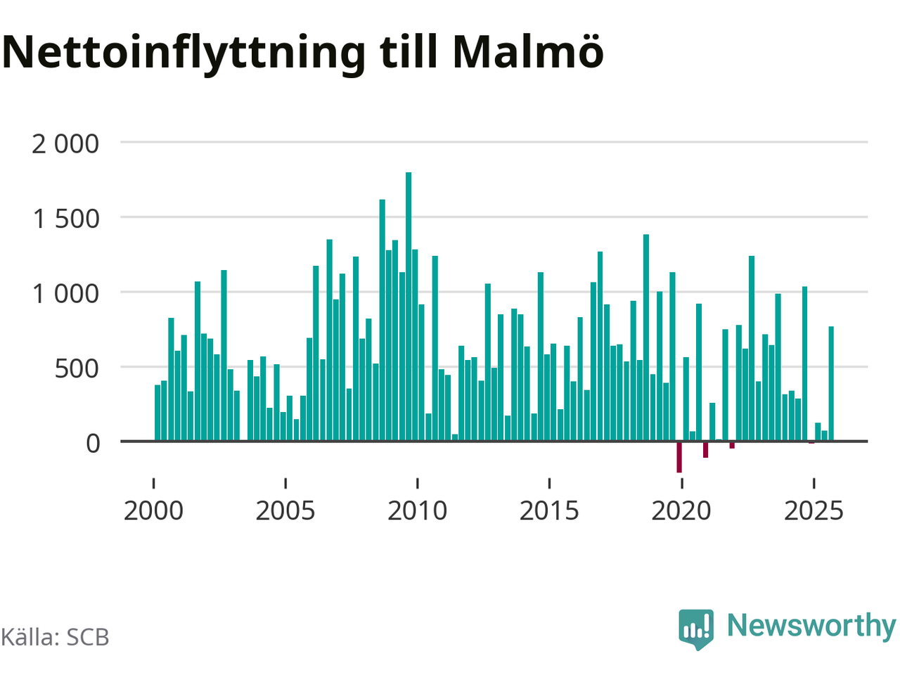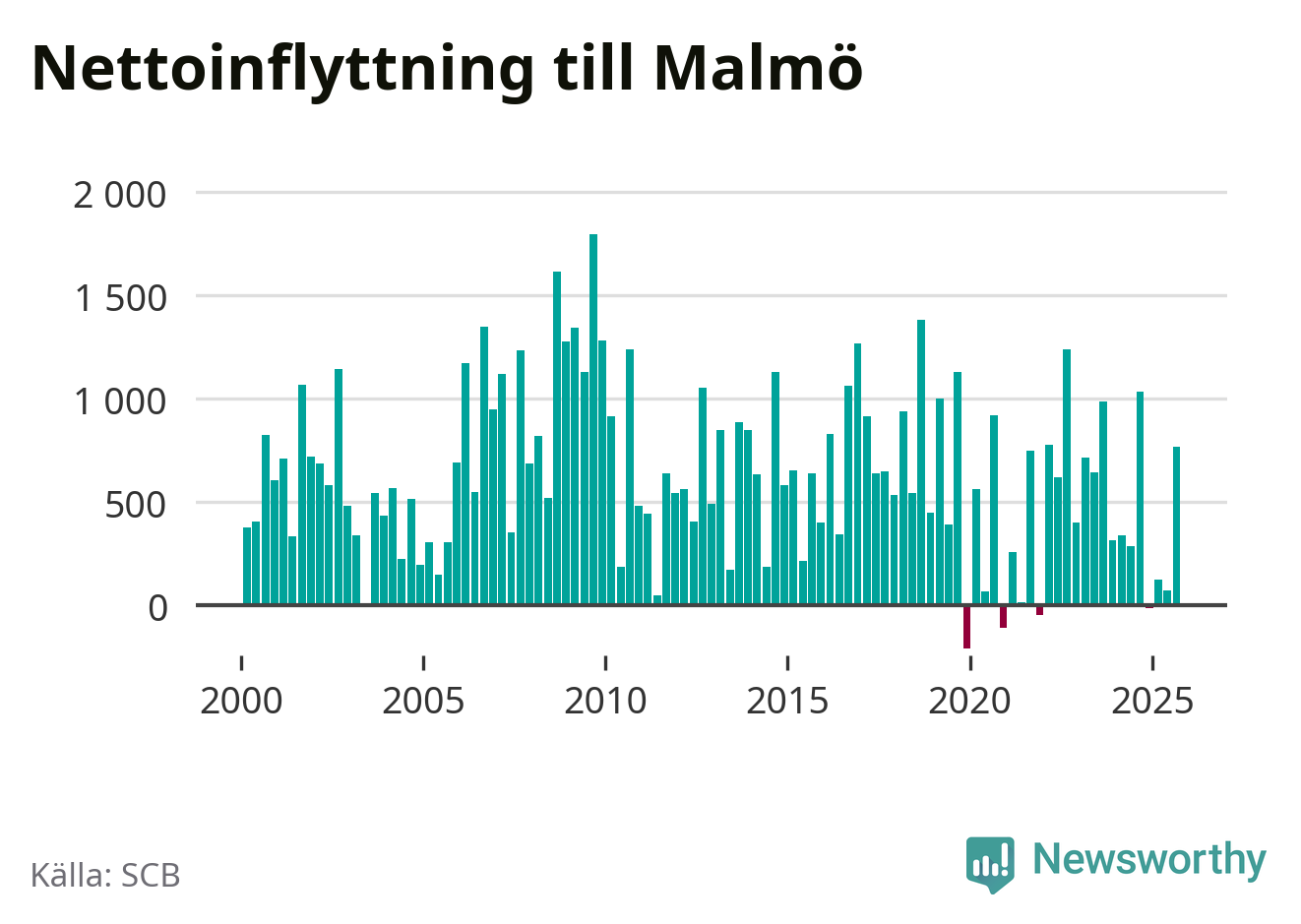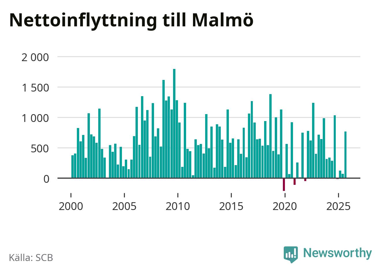 Under tredje kvartalet 2025 flyttade 7 133 personer till kommunen medan 6 367 personer flyttade därifrån. Det är historiskt sett en stor inflyttning under ett kvartal – men samtidigt var utflyttningen relativt stor. Sedan seklets början har Malmö haft ett positivt flyttnetto under nästan alla kvartal, inklusive det senaste kvartalet.