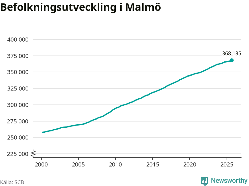 Jämfört med för ett år sedan har befolkningen i Malmö ökat med ungefär 2 880 personer – vilket motsvarar en ökning på 0,8 procent. Sedan millennieskiftet har folkmängden ökat med runt 110 300 personer, eller 43 procent. Det är den största ökningen i Skåne under den perioden.