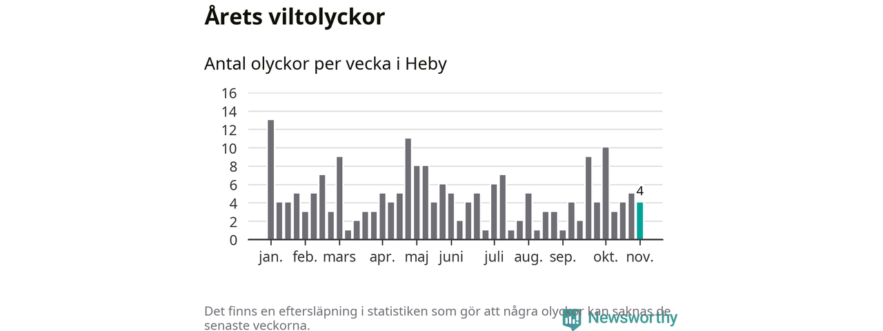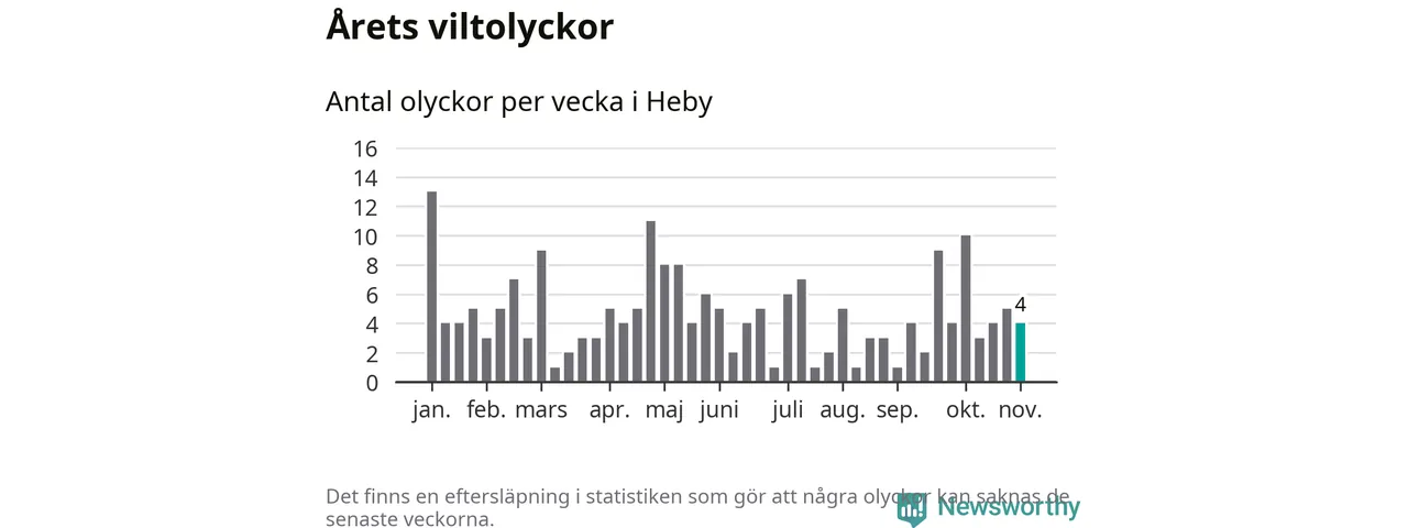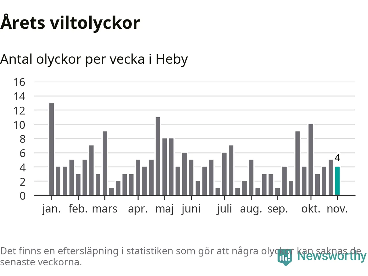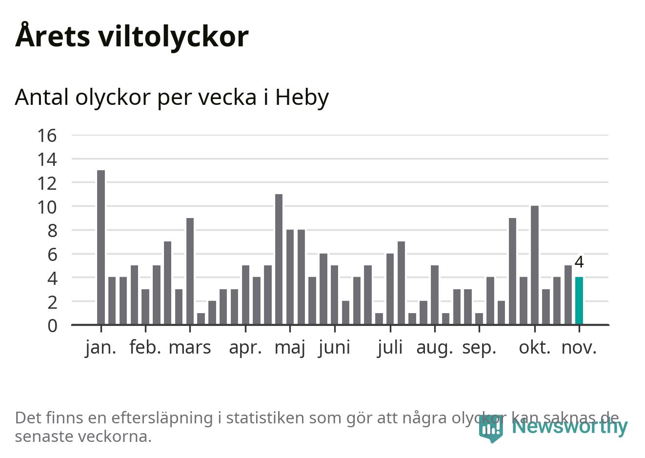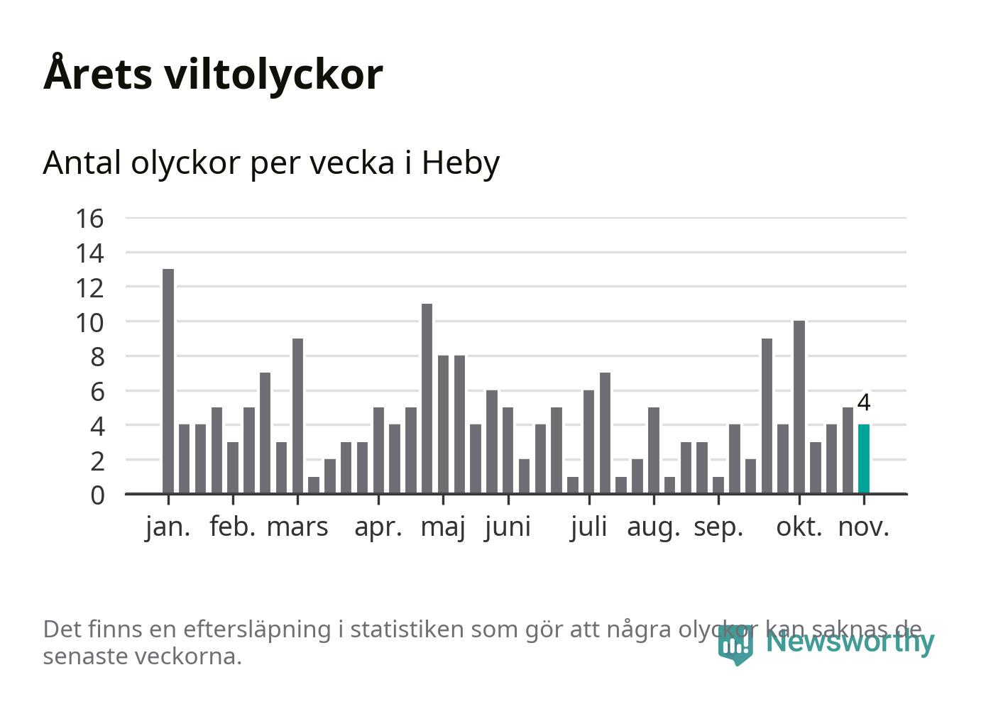 Hittills har fyra viltolyckor rapporterats in i Heby kommun från vecka 45. Se listan här.