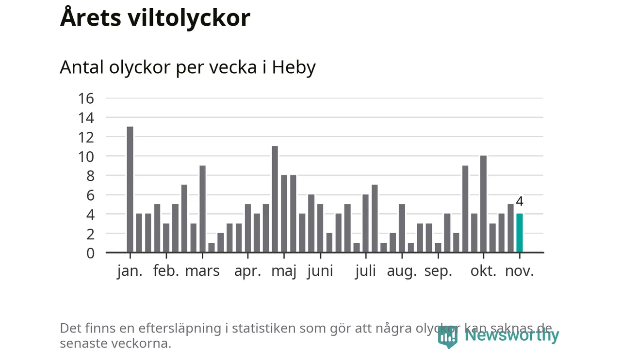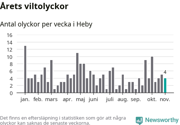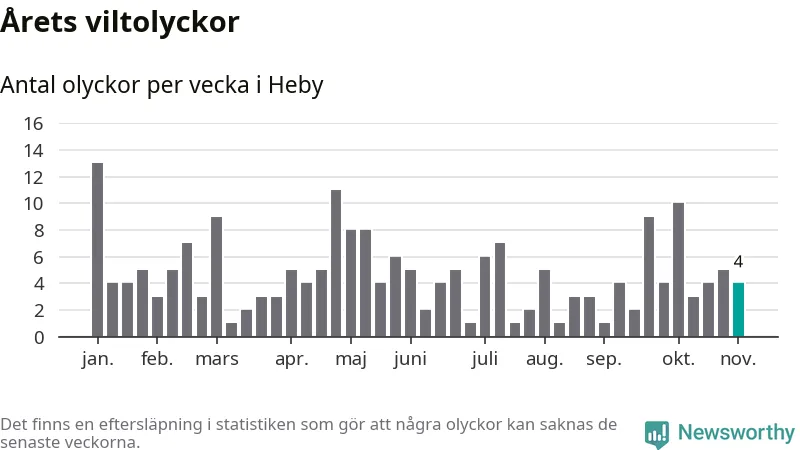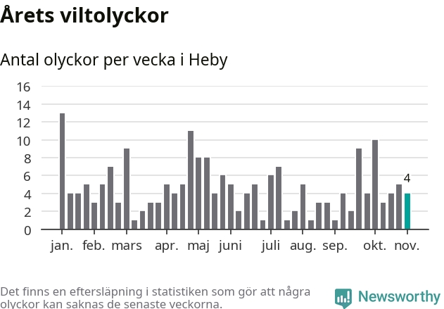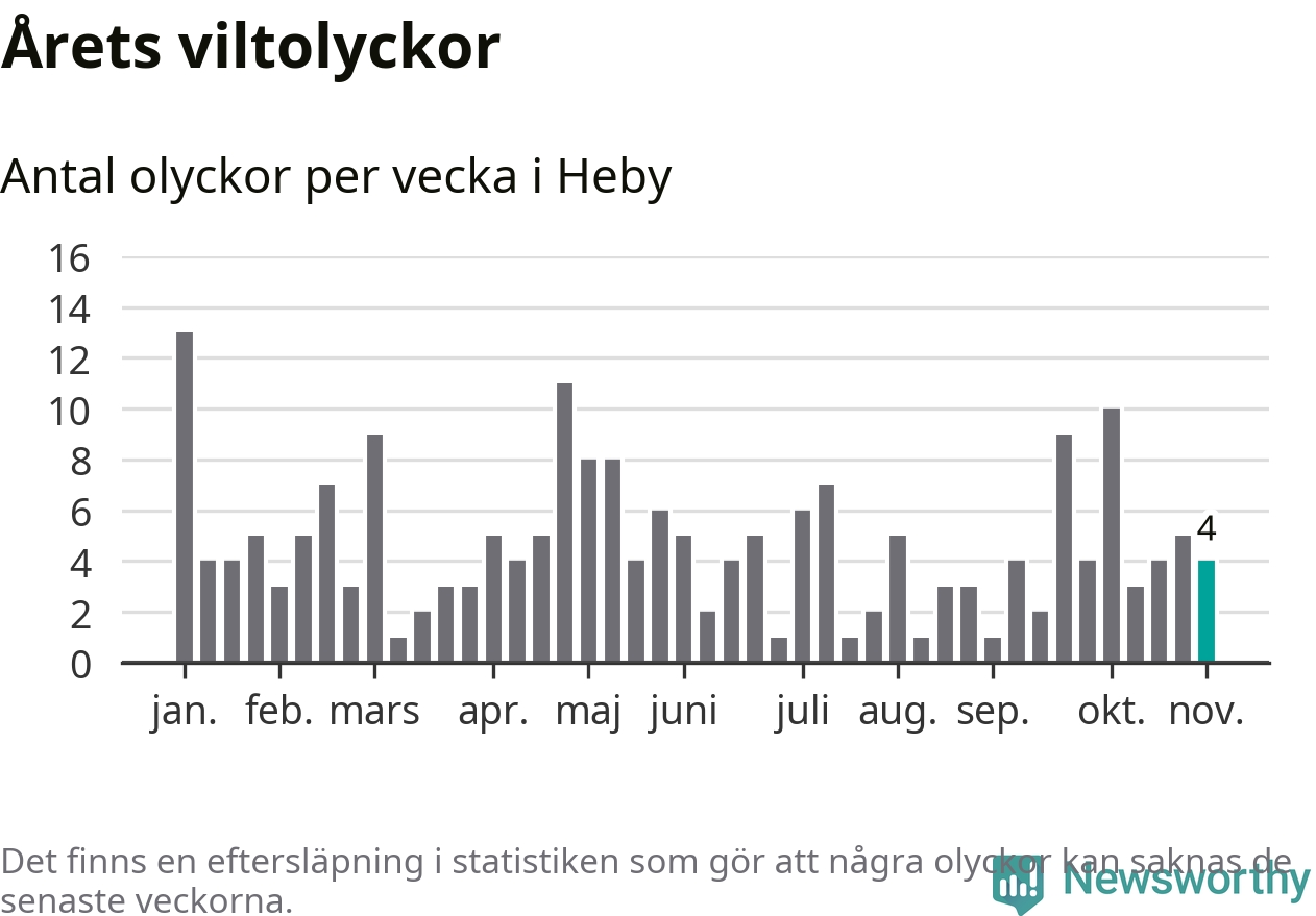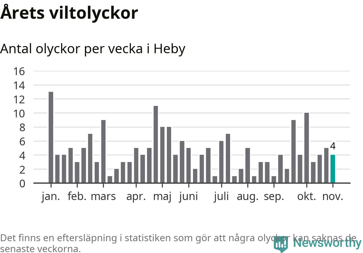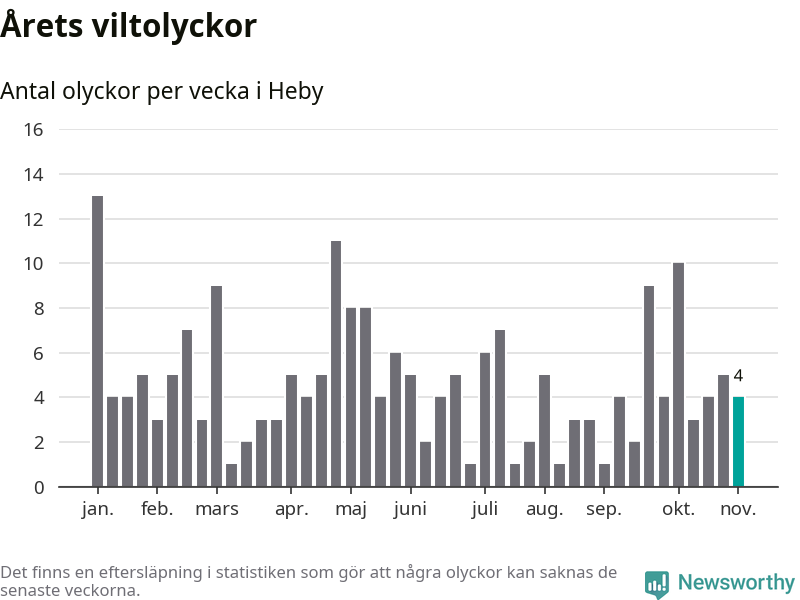 Hittills har fyra viltolyckor rapporterats in i Heby kommun från vecka 45. Se listan här.