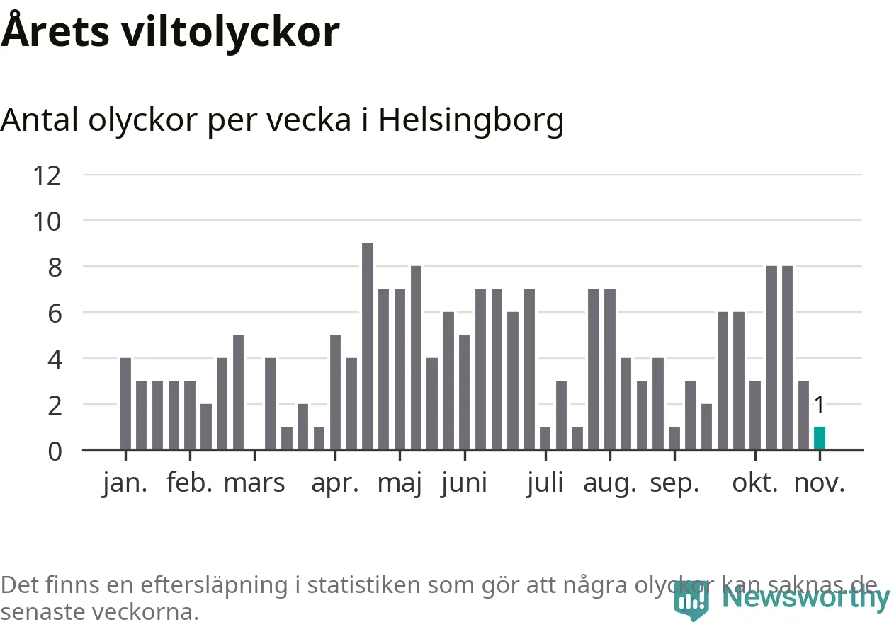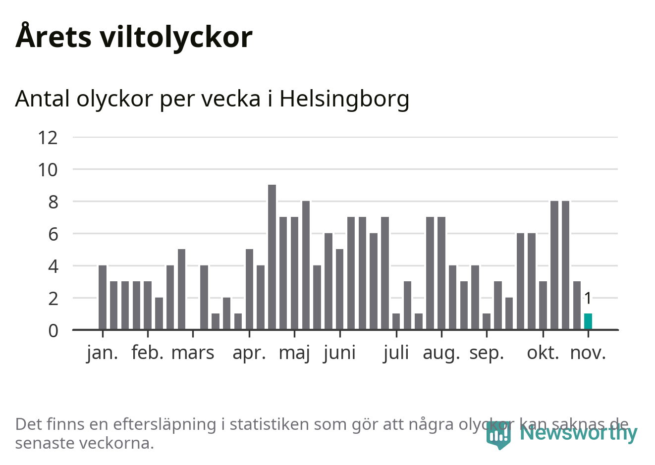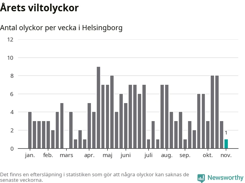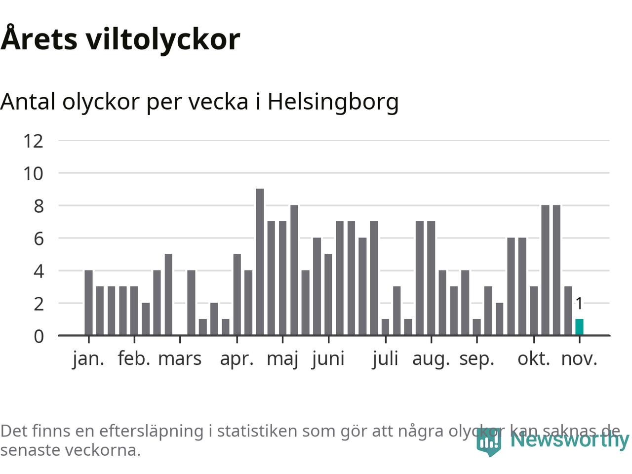 Från förra veckan (vecka 45) har hittills en viltolycka rapporterats in i Helsingborgs kommun.
