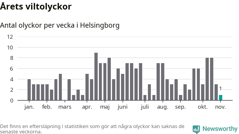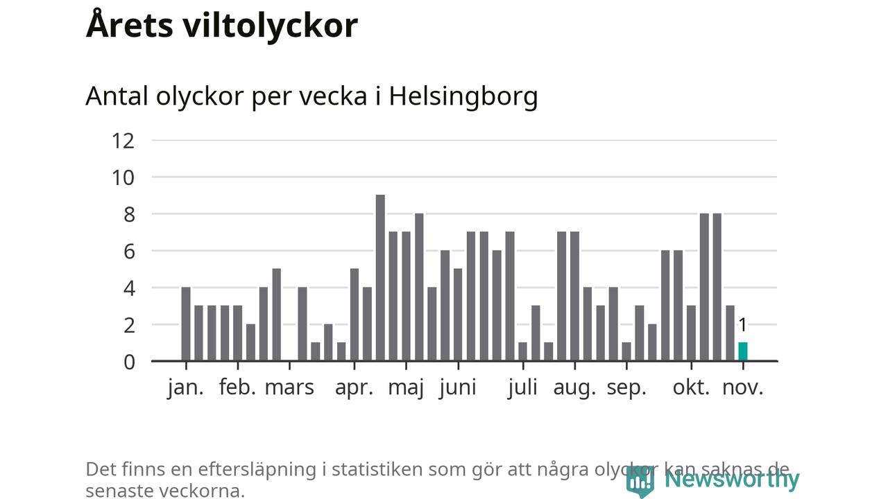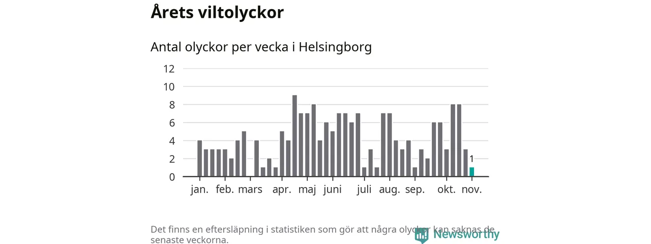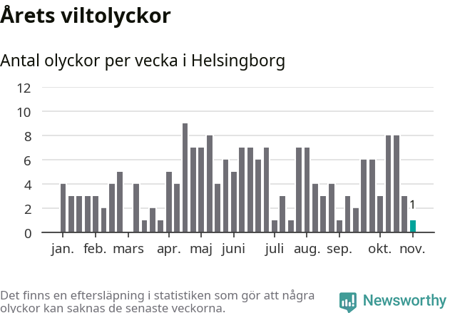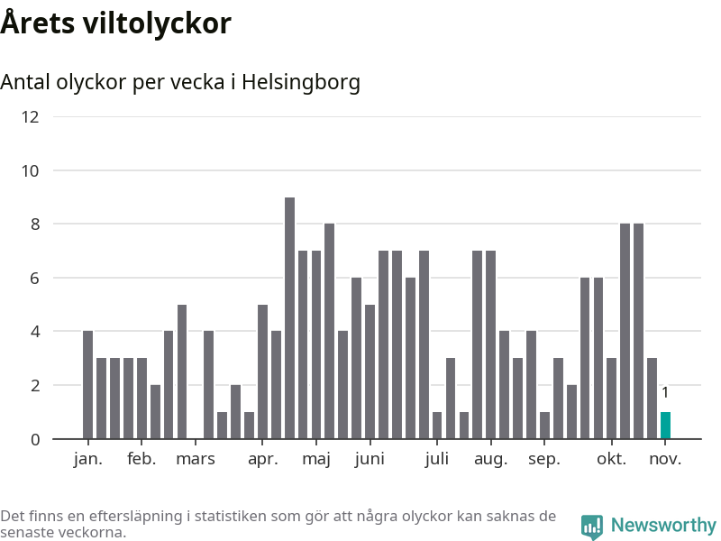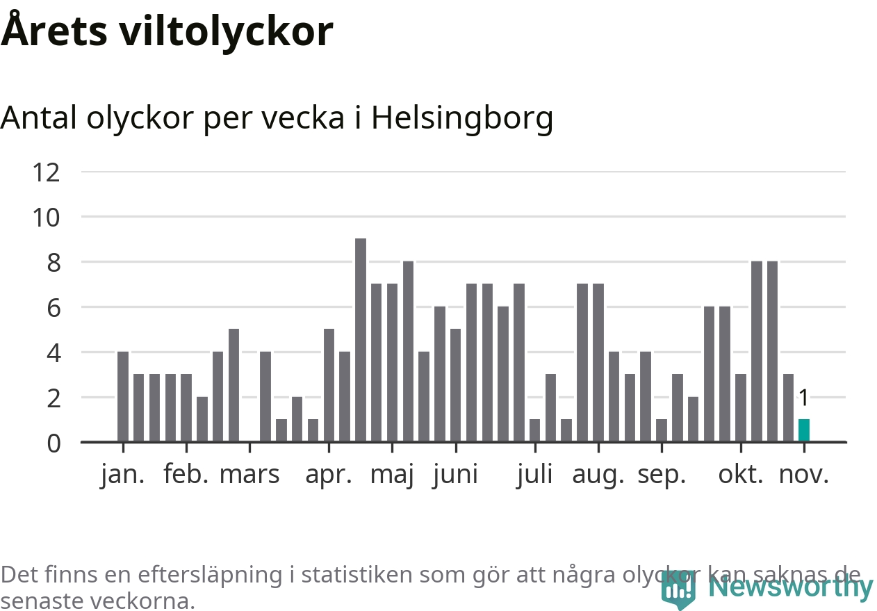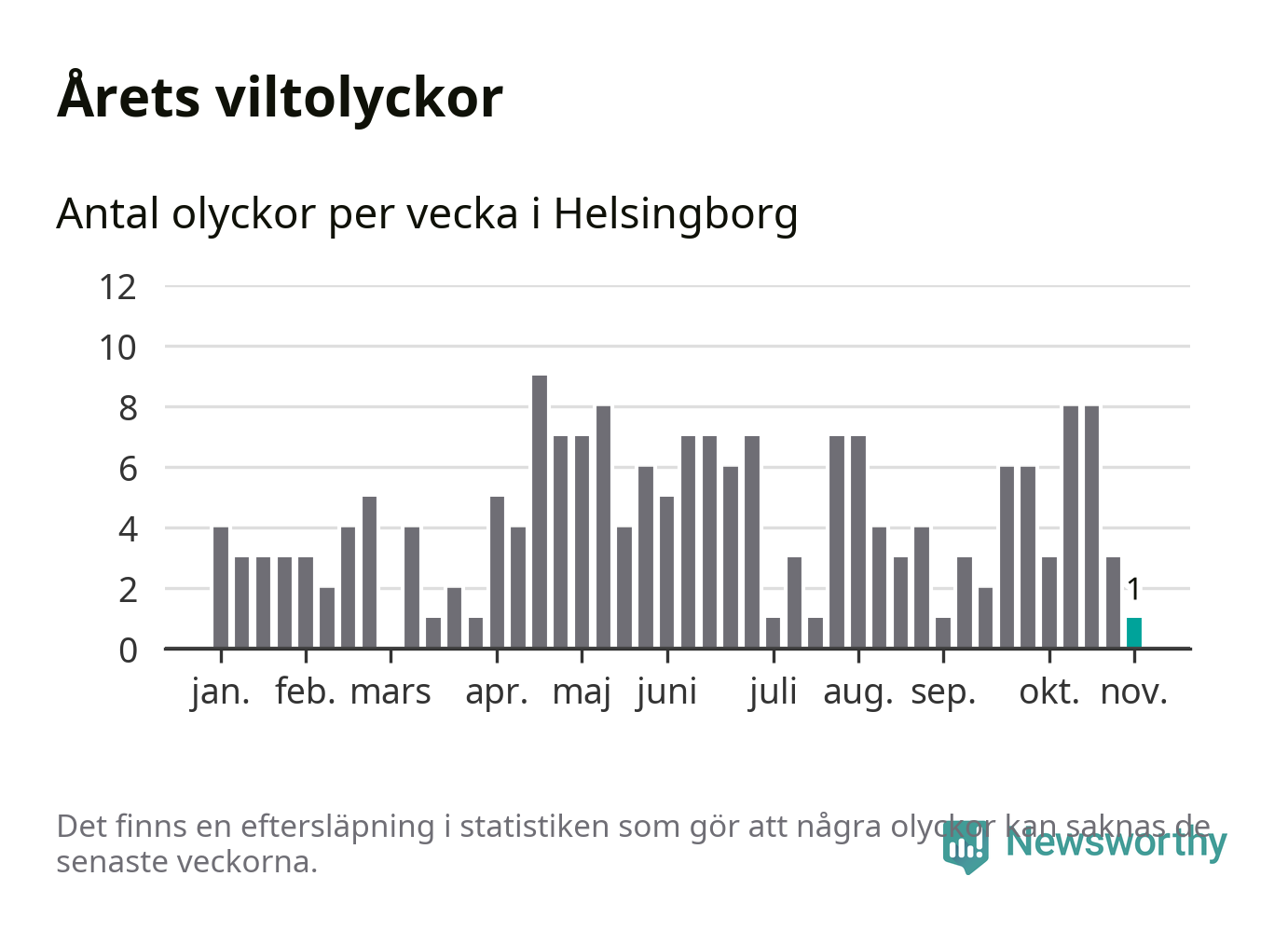 Från förra veckan (vecka 45) har hittills en viltolycka rapporterats in i Helsingborgs kommun.