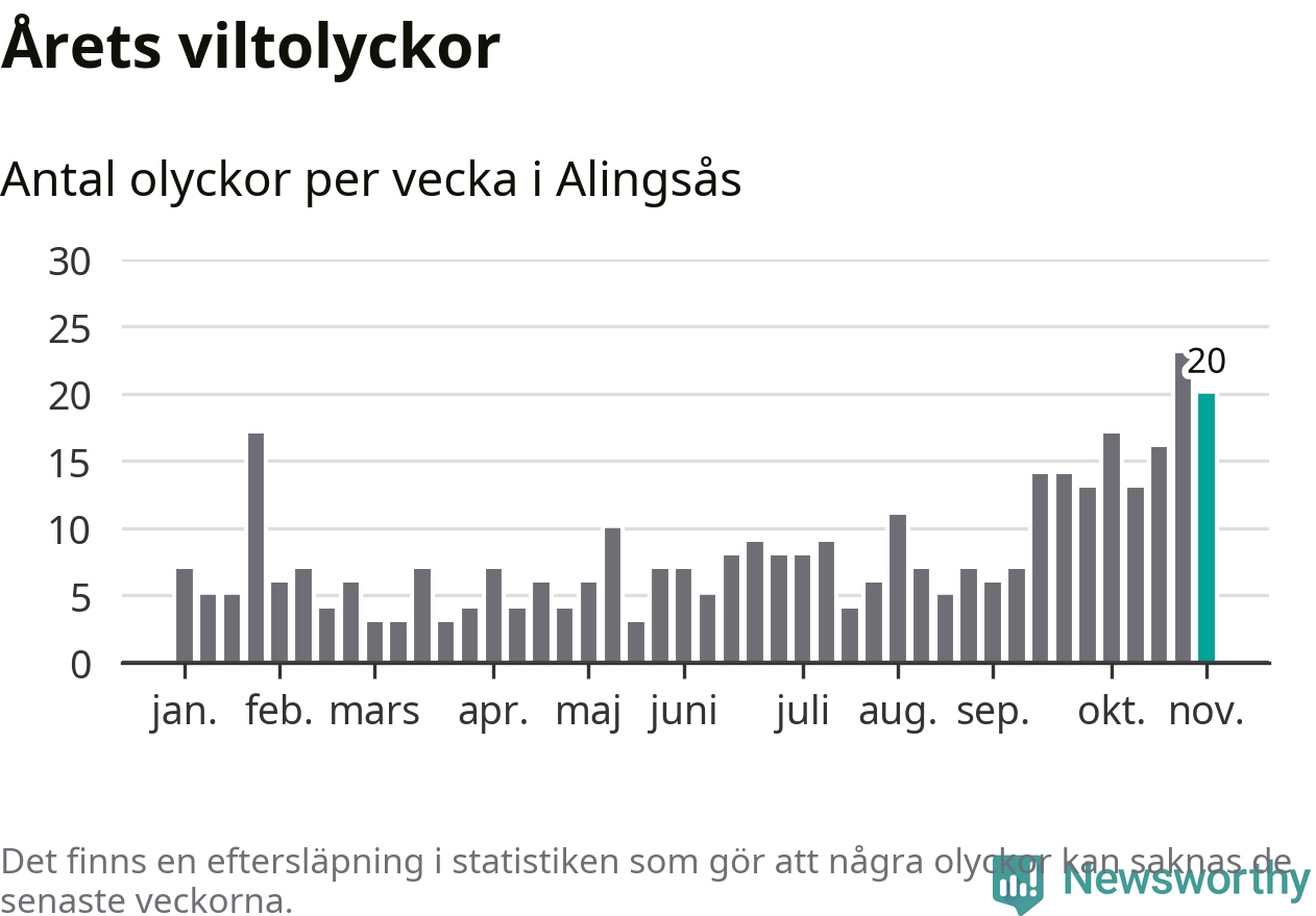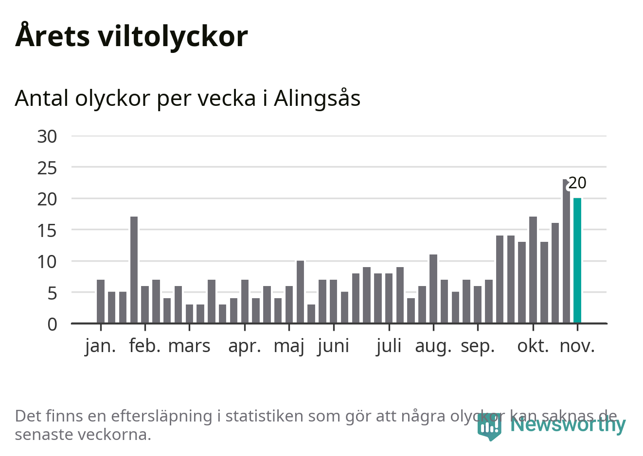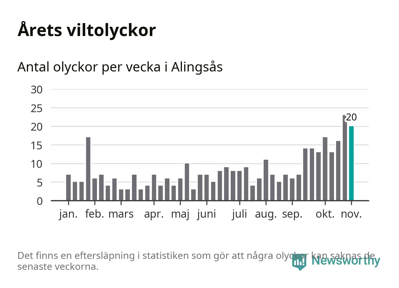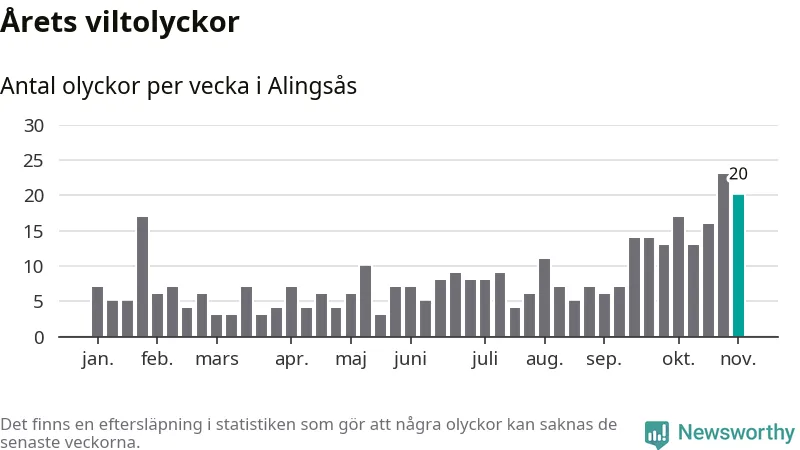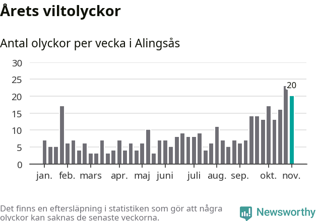 20 olyckor på en enda vecka är däremot ovanligt många. Bara 17 gånger tidigare sedan 2015 har det skett