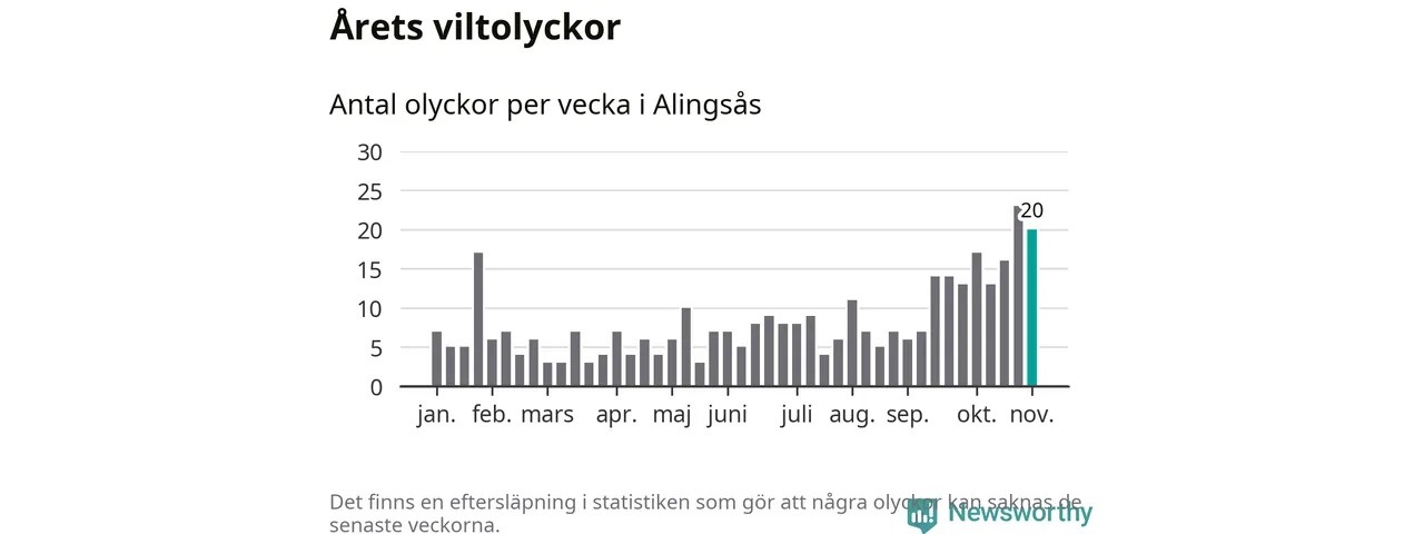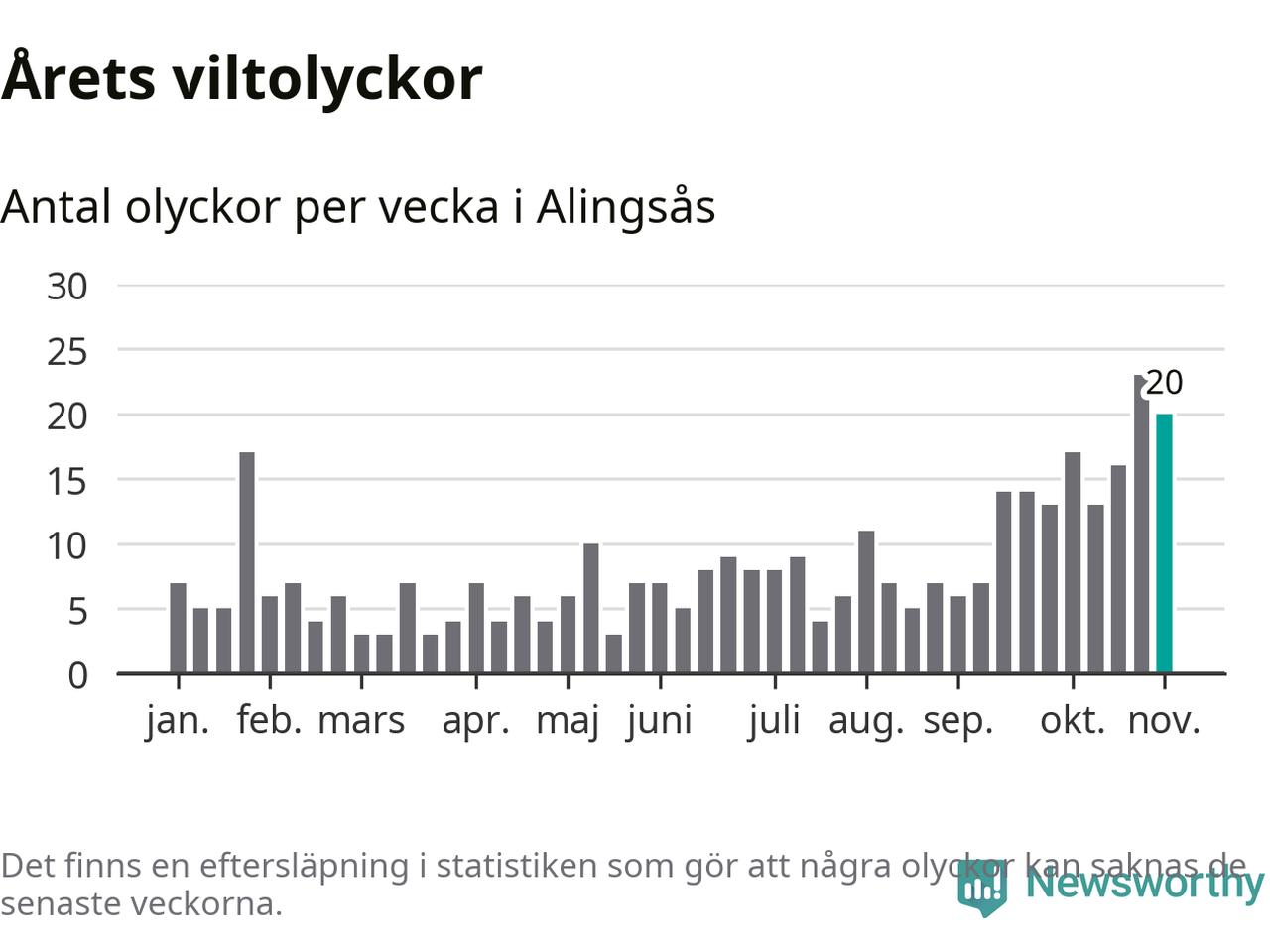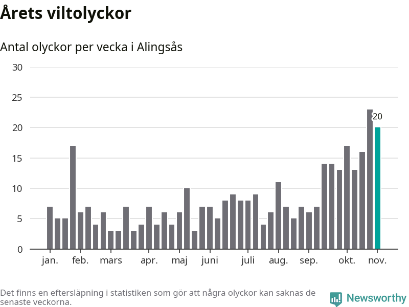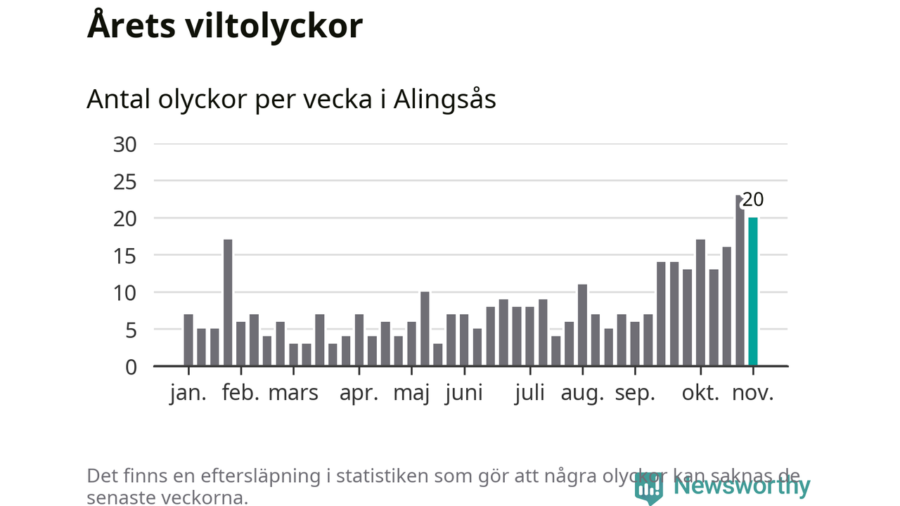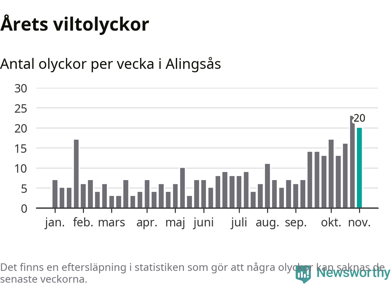 20 olyckor på en enda vecka är däremot ovanligt många. Bara 17 gånger tidigare sedan 2015 har det skett