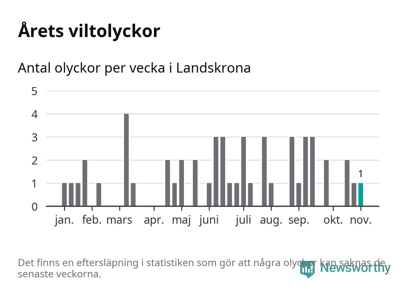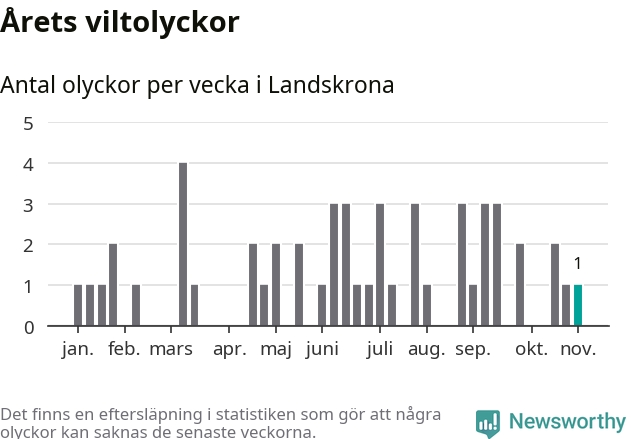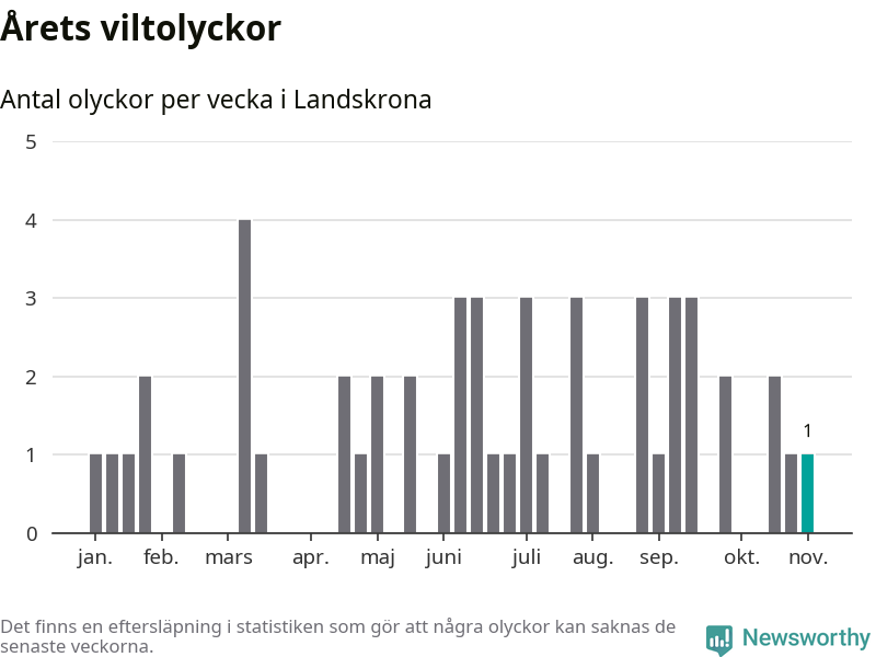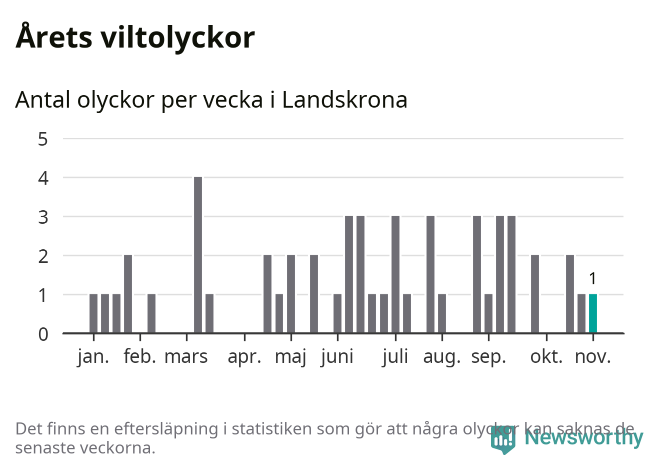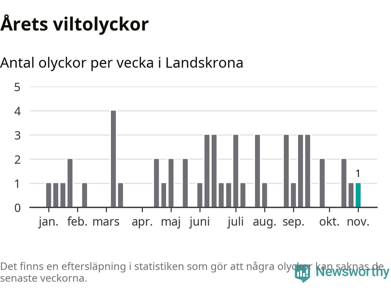 Från förra veckan (vecka 45) har hittills en viltolycka rapporterats in i Landskrona kommun.