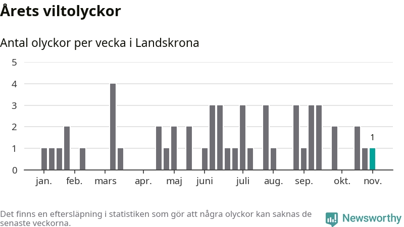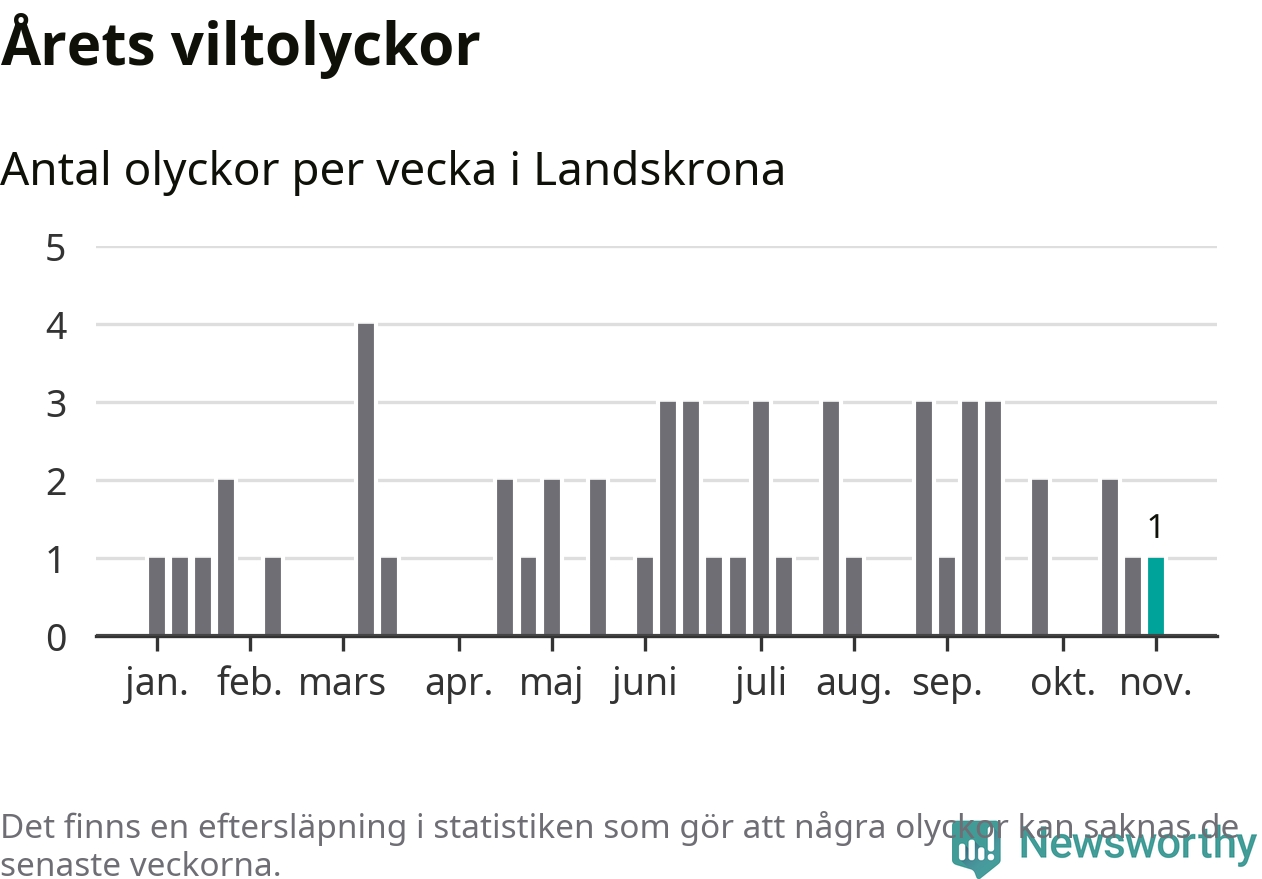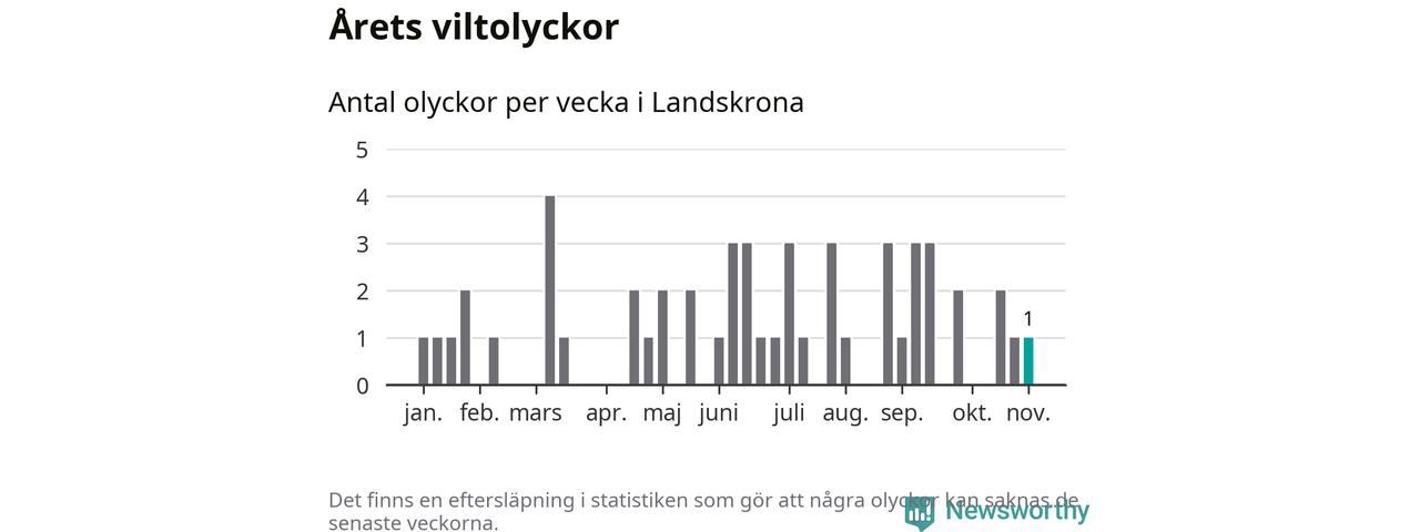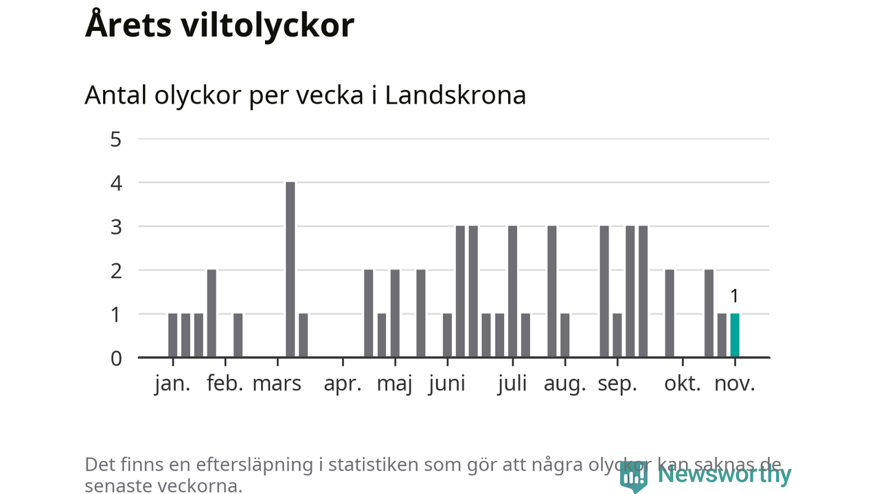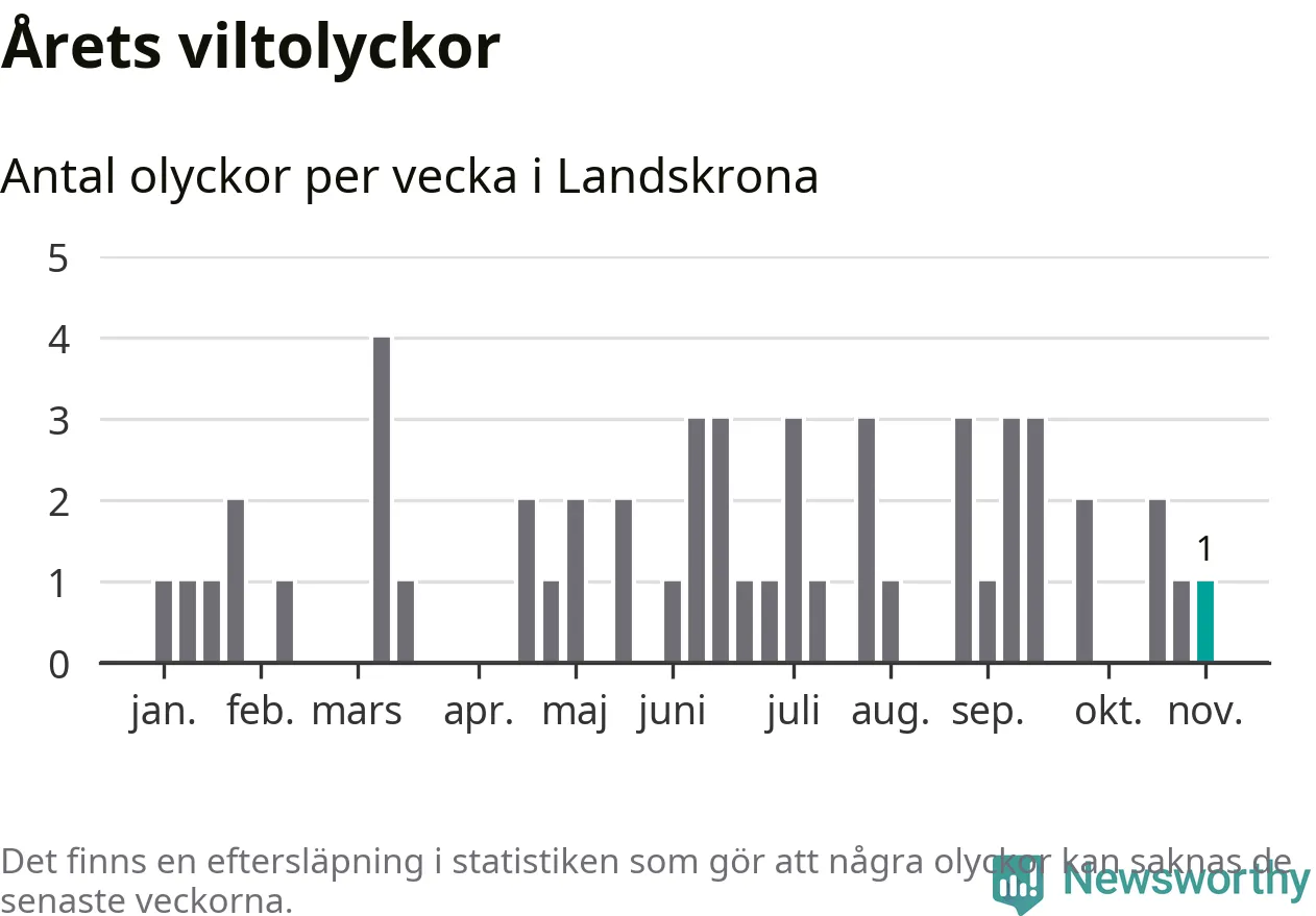 Från förra veckan (vecka 45) har hittills en viltolycka rapporterats in i Landskrona kommun.