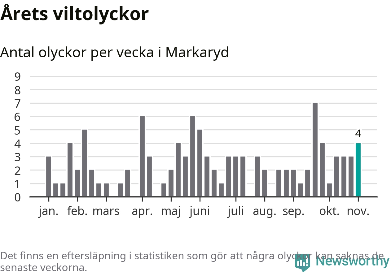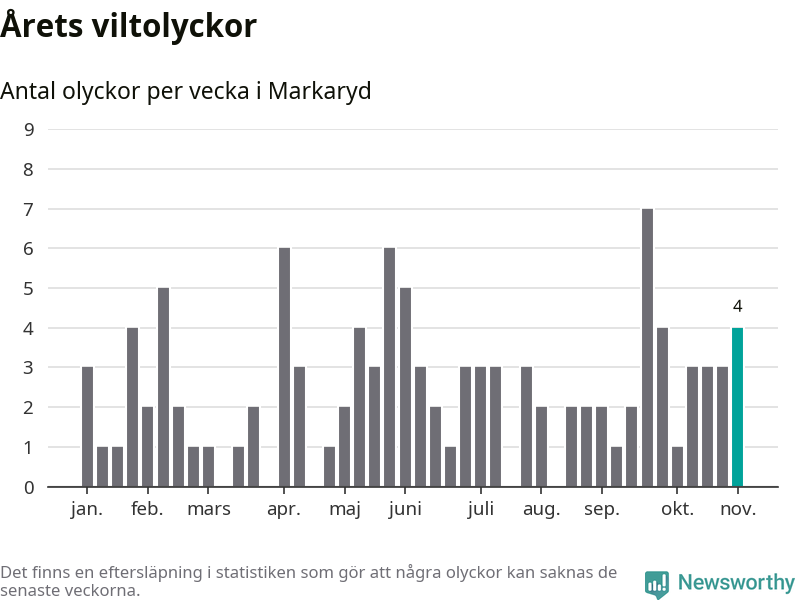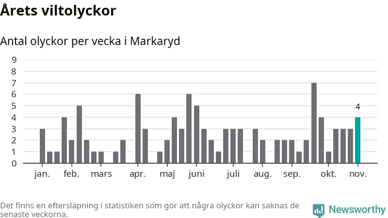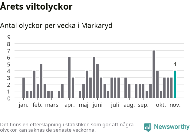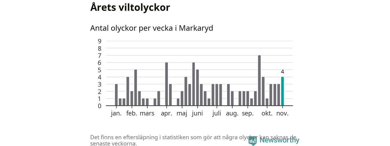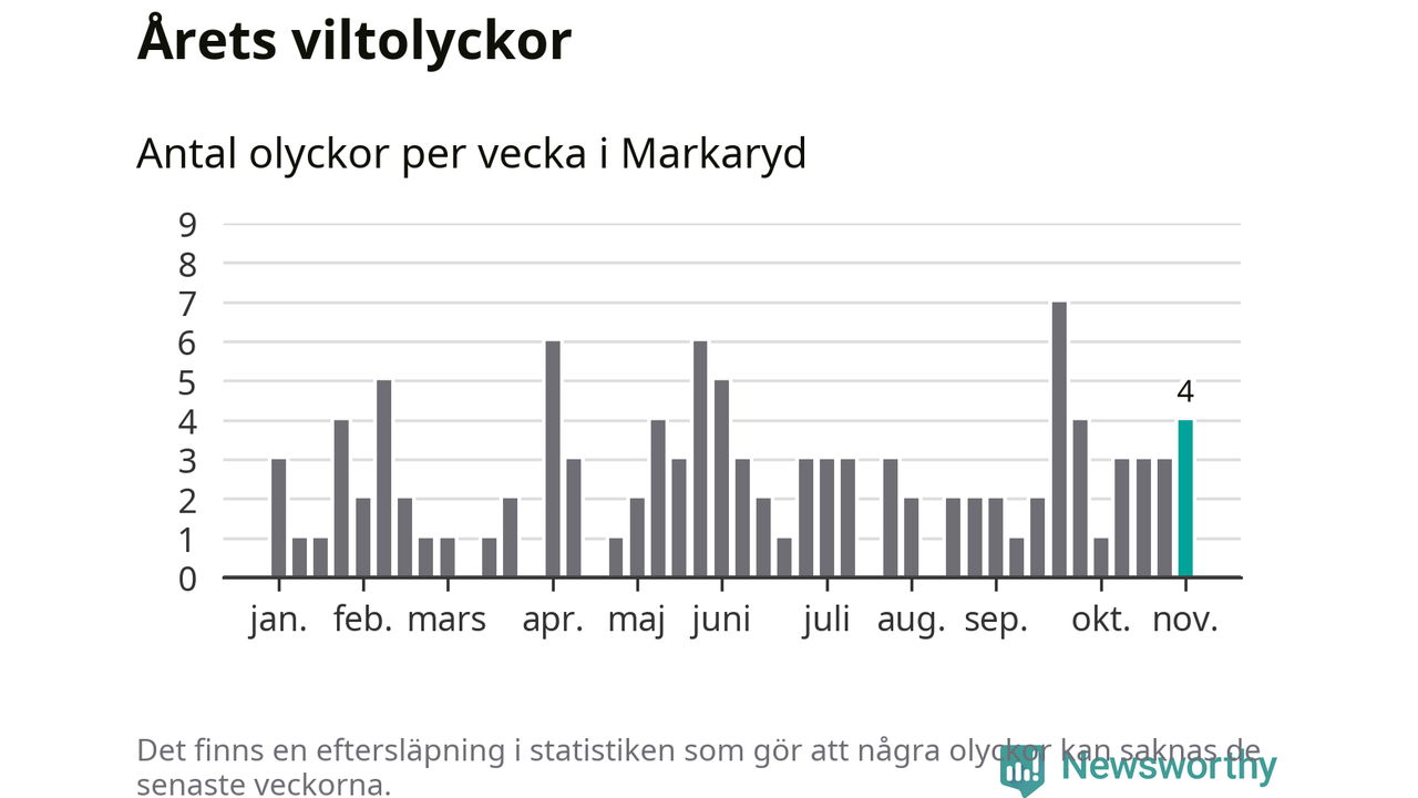 Hittills har fyra viltolyckor rapporterats in i Markaryds kommun från vecka 45. Se listan här.