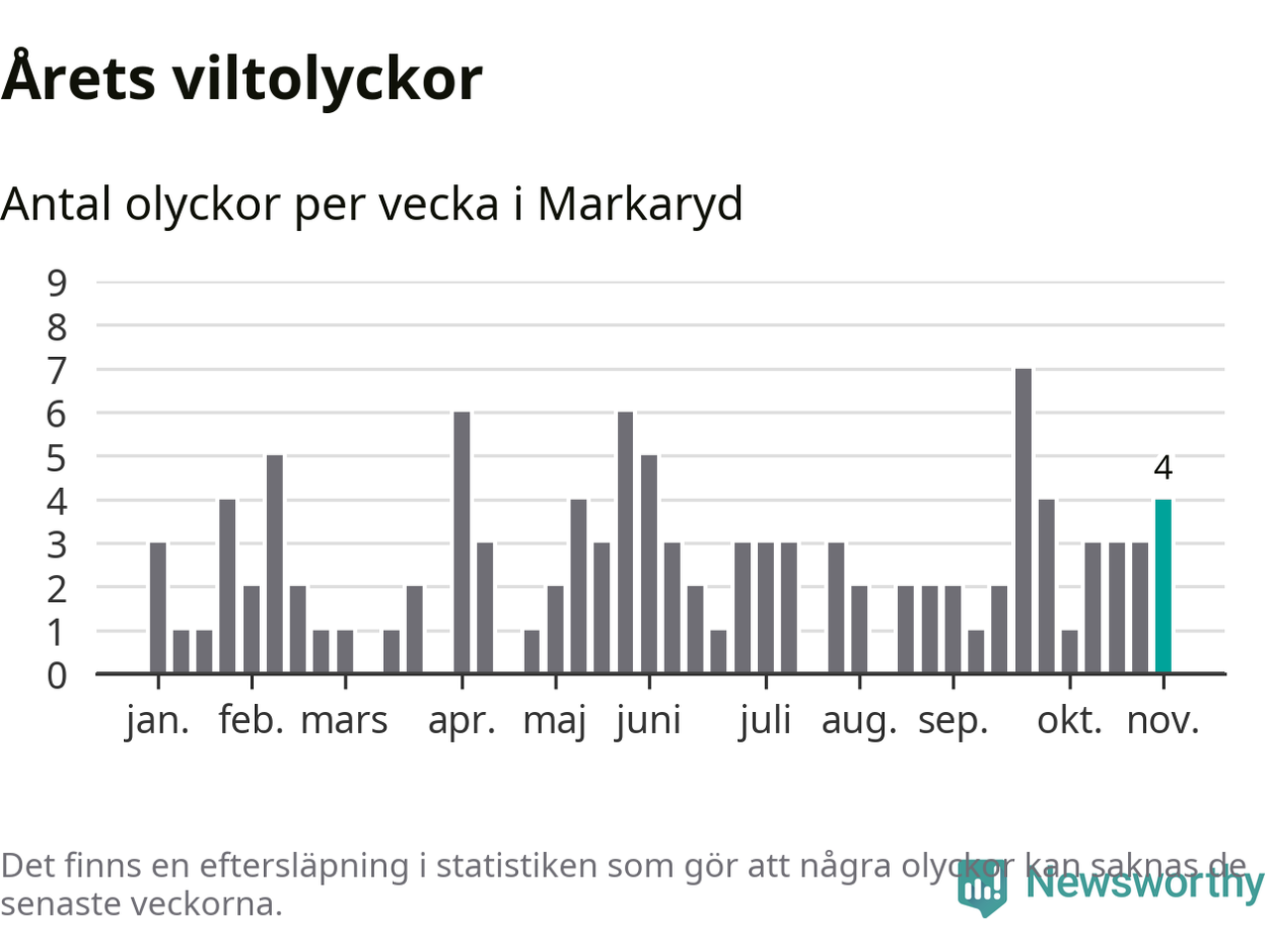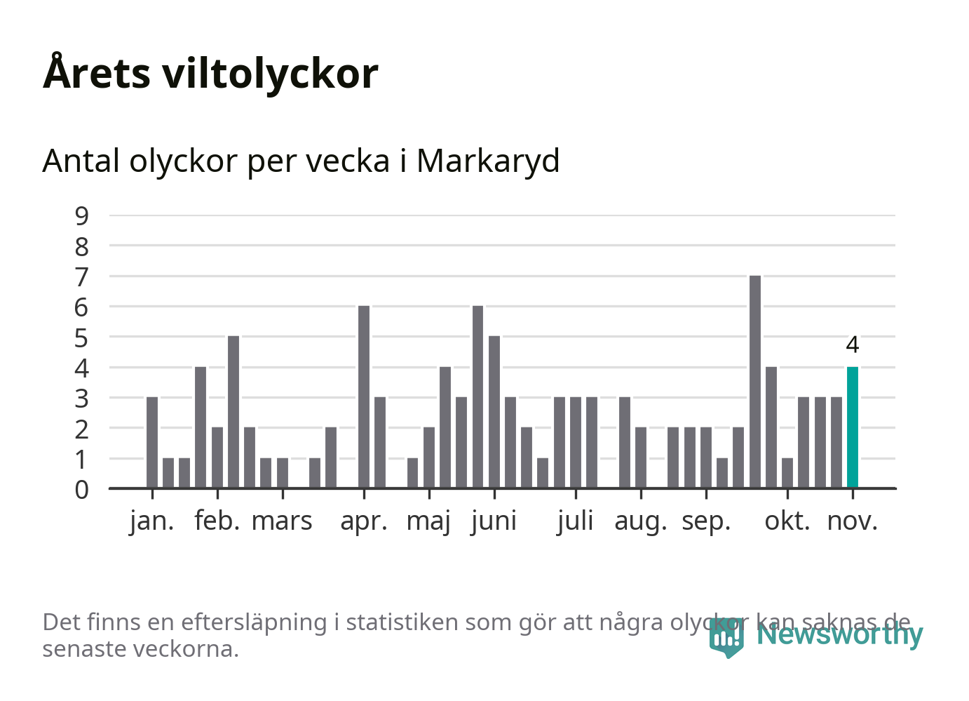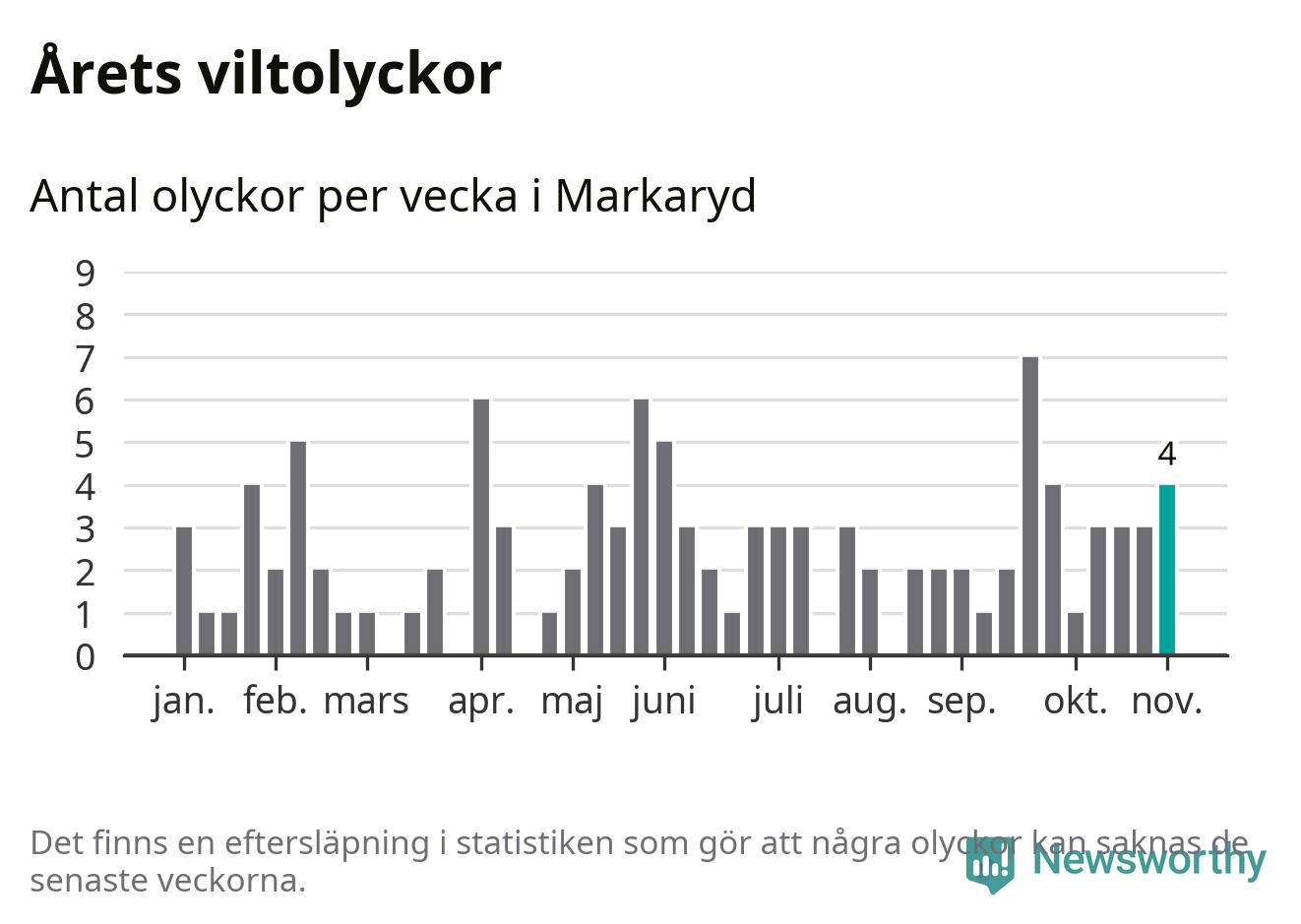 Hittills har fyra viltolyckor rapporterats in i Markaryds kommun från vecka 45. Se listan här.