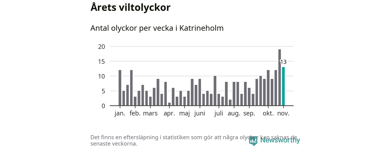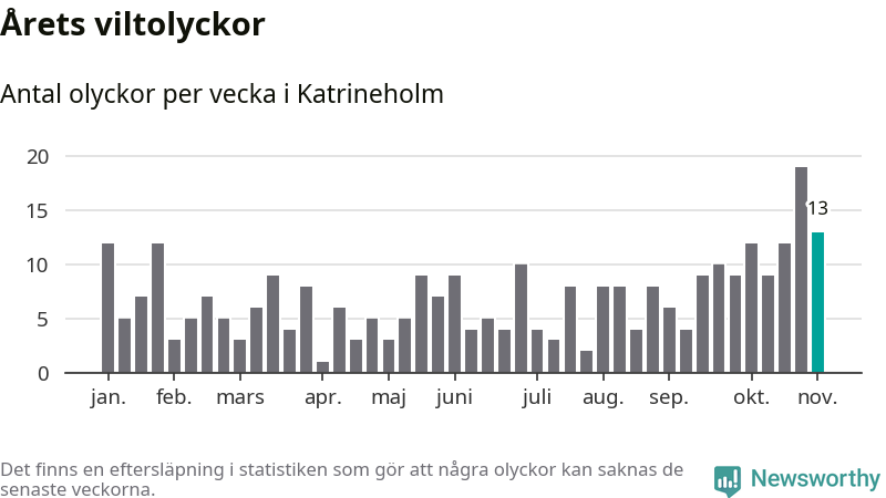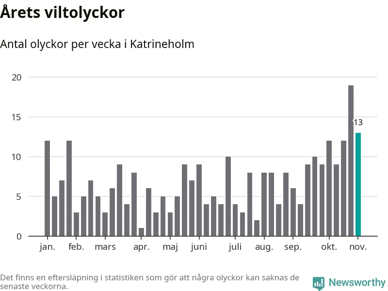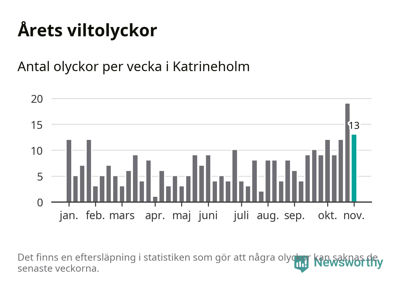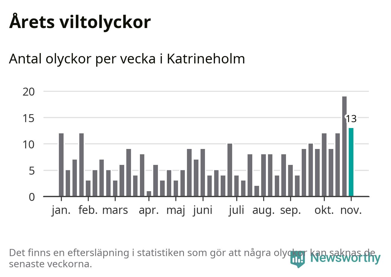 Hittills har 13 viltolyckor rapporterats in i Katrineholms kommun från vecka 45. Se listan här.
