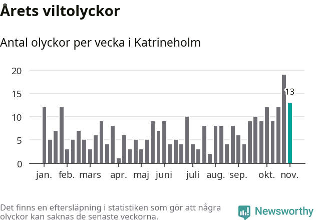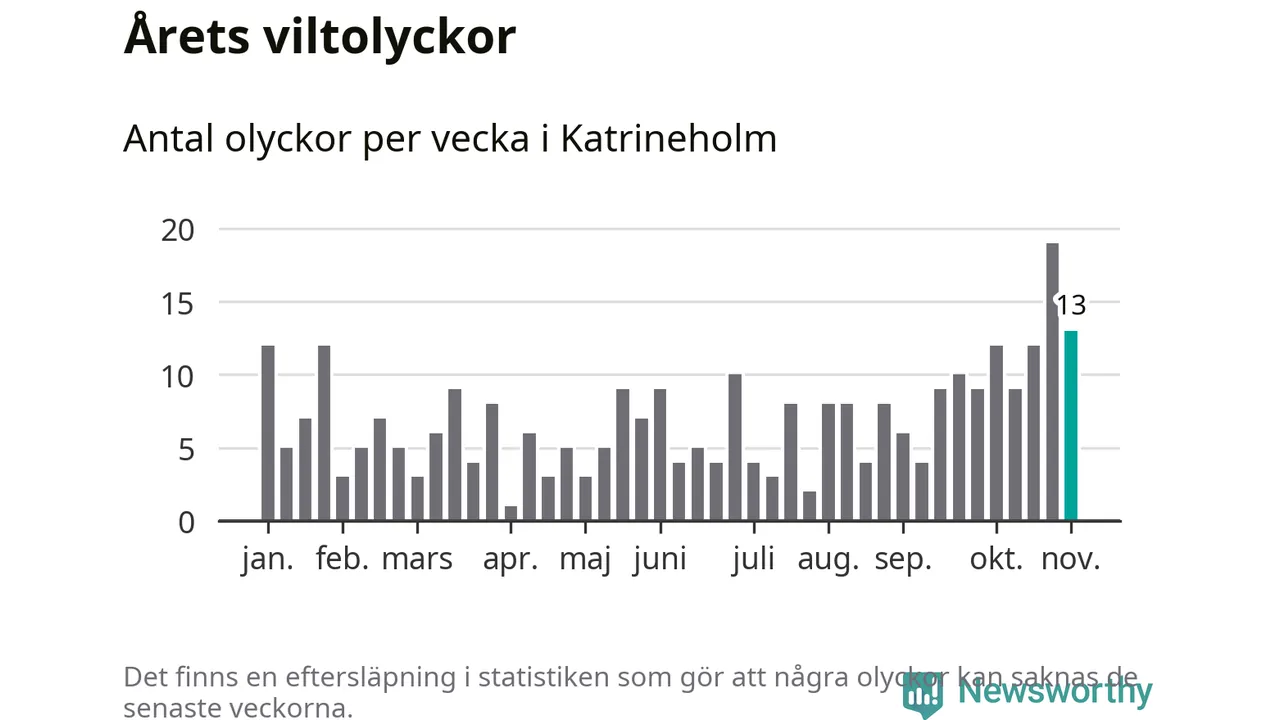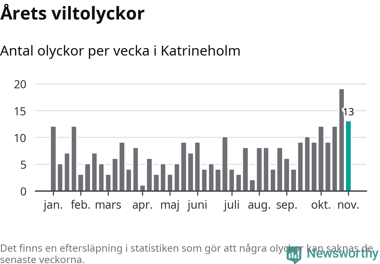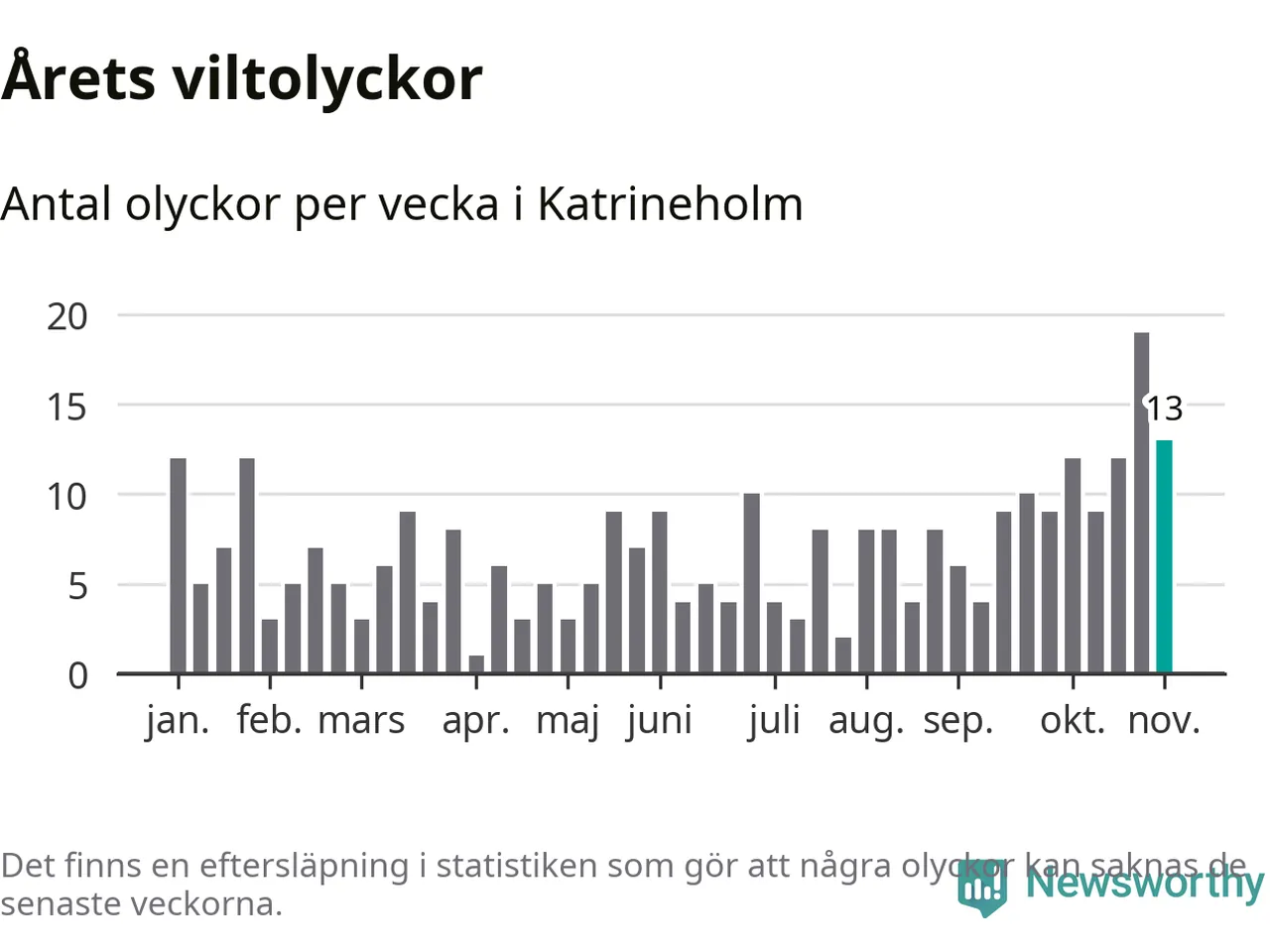 Hittills har 13 viltolyckor rapporterats in i Katrineholms kommun från vecka 45. Se listan här.