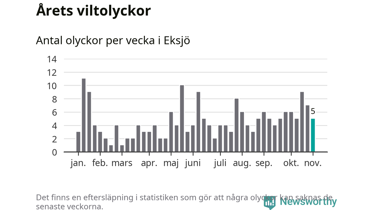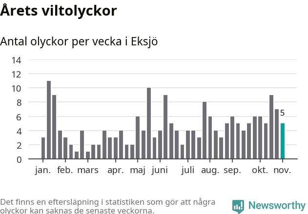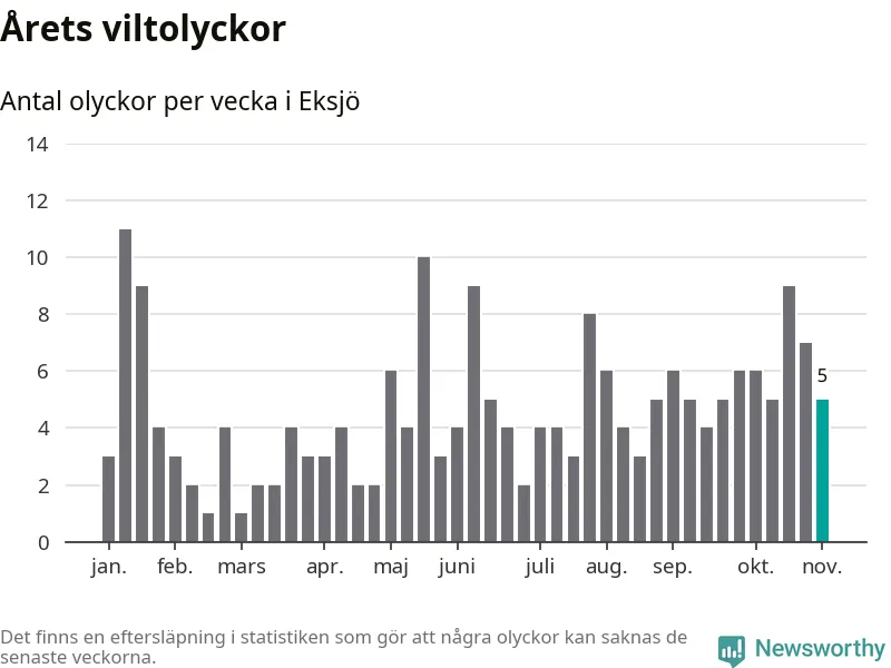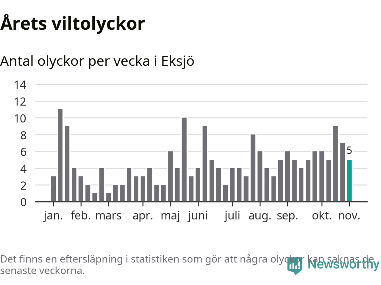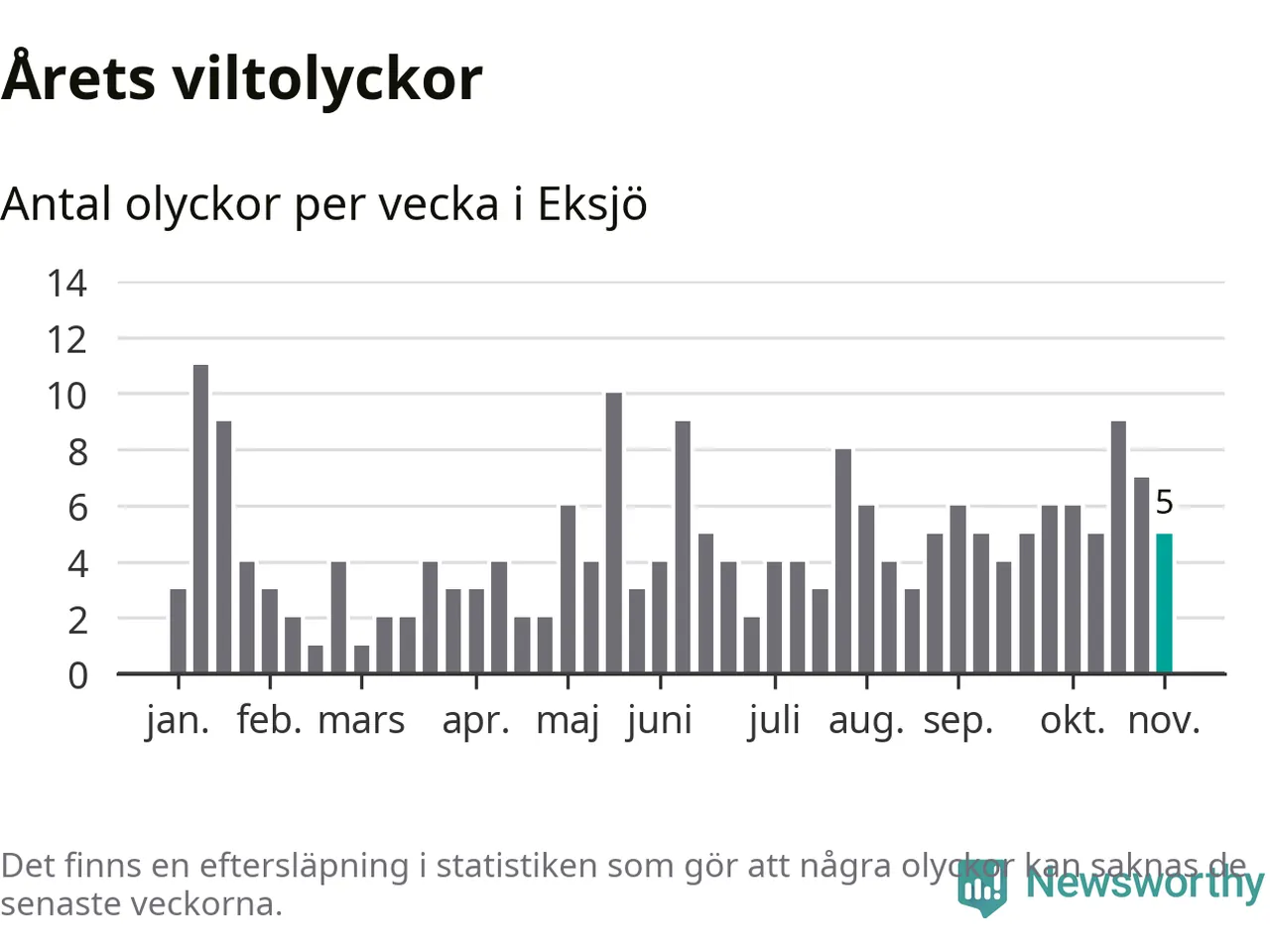Hittills har fem viltolyckor rapporterats in i Eksjö kommun från vecka 45. Se listan här.