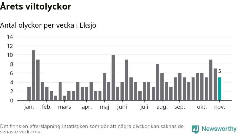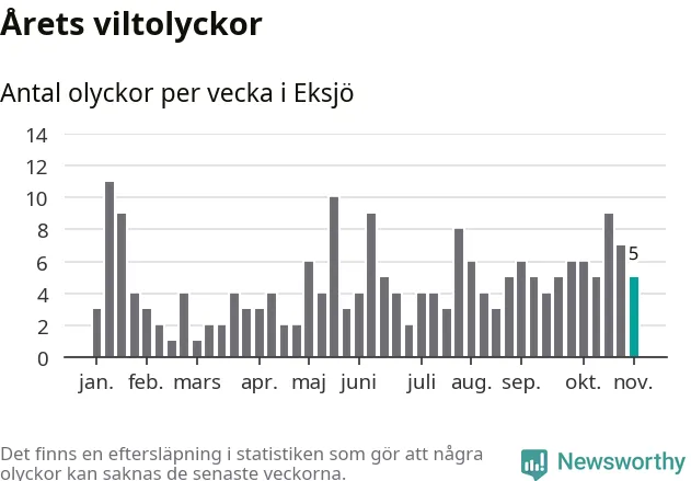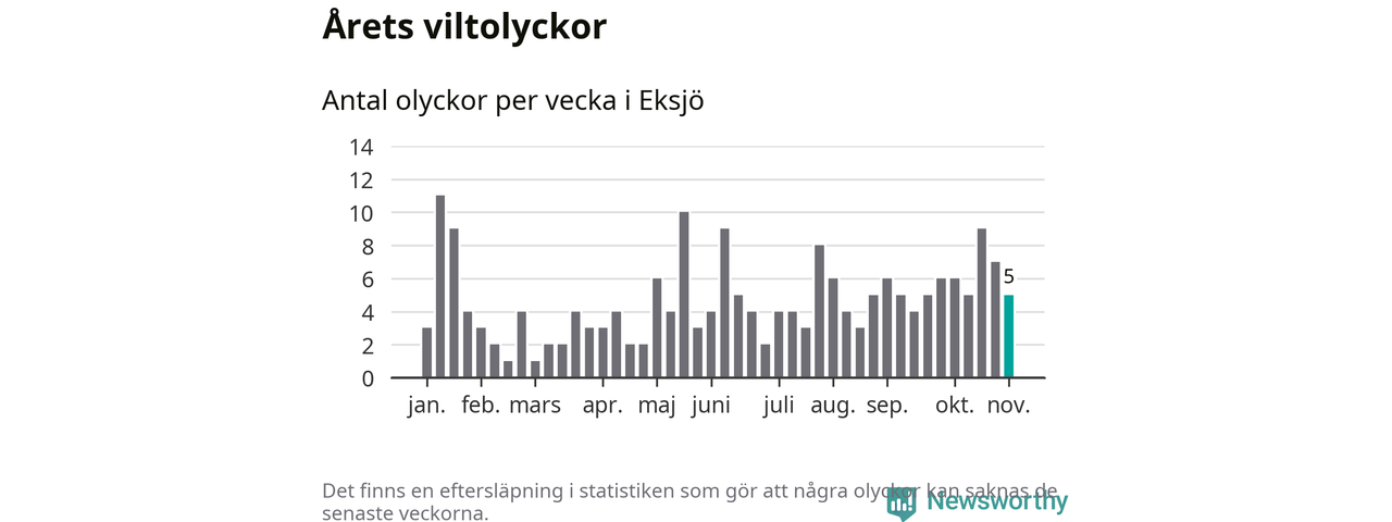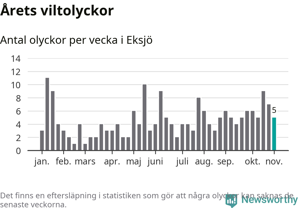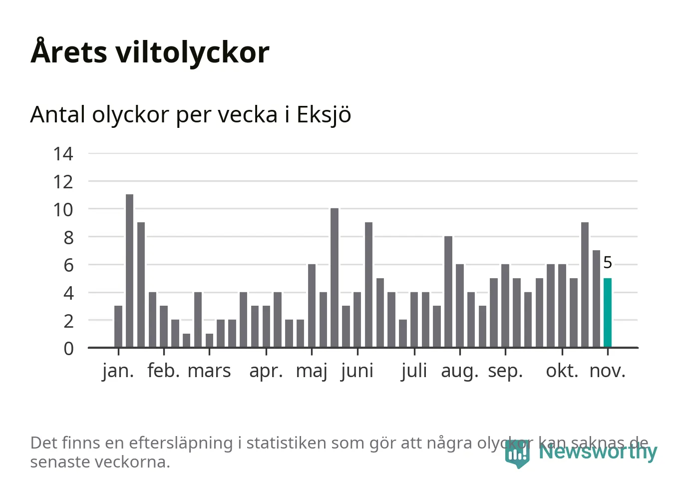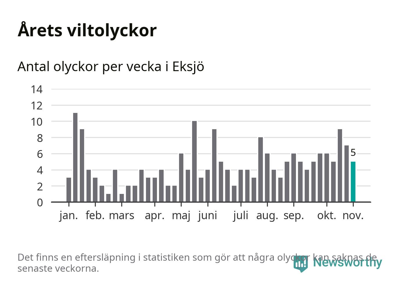 Hittills har fem viltolyckor rapporterats in i Eksjö kommun från vecka 45. Se listan här.
