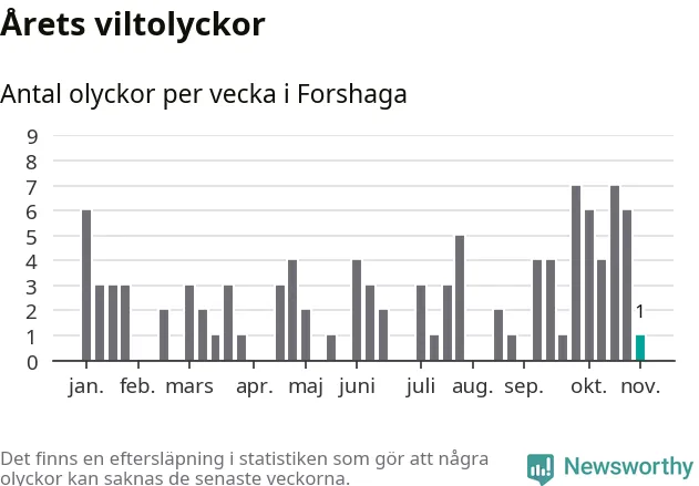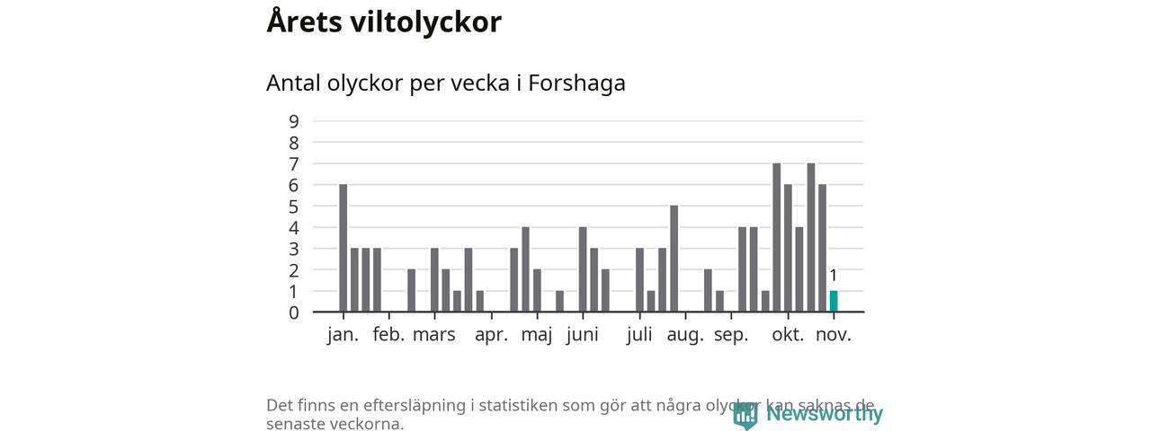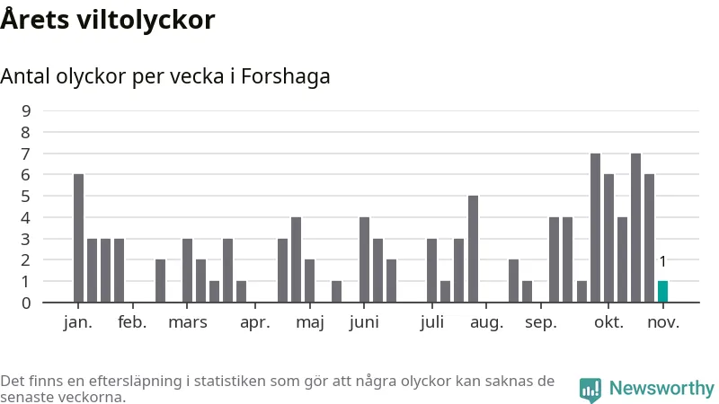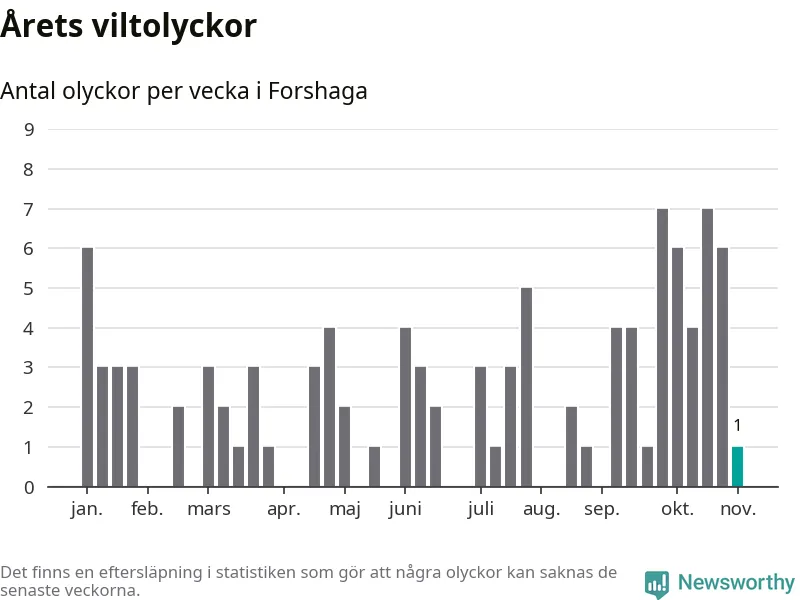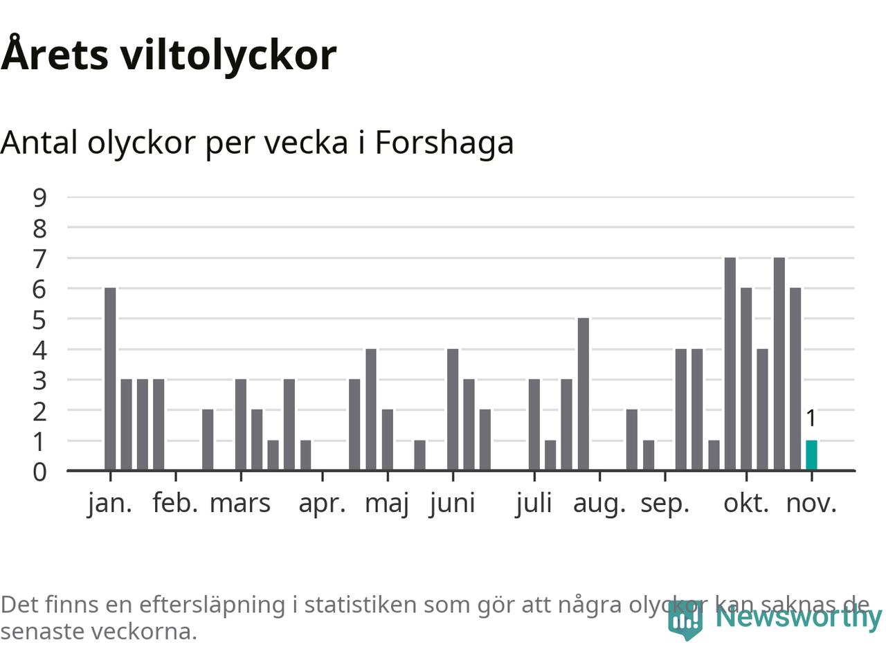 Från förra veckan (vecka 45) har hittills en viltolycka rapporterats in i Forshaga kommun.