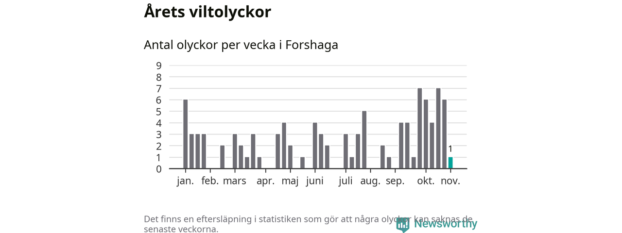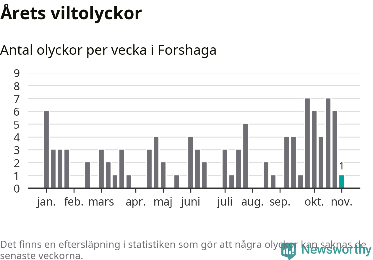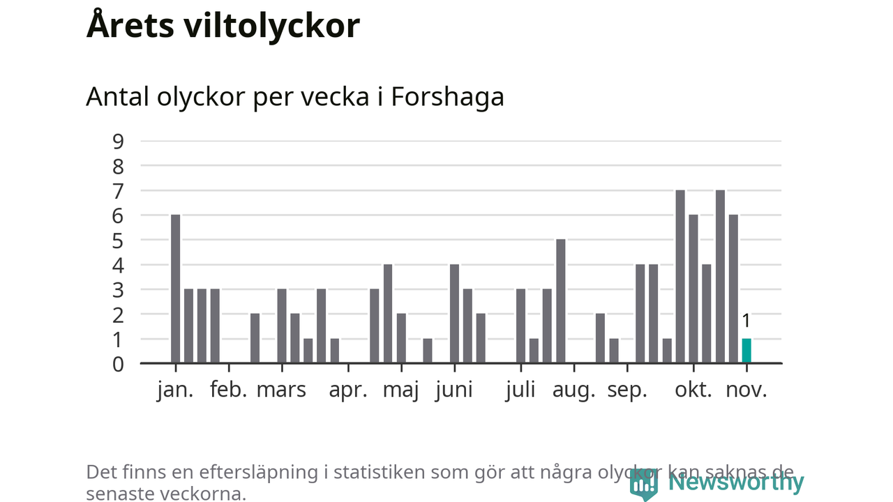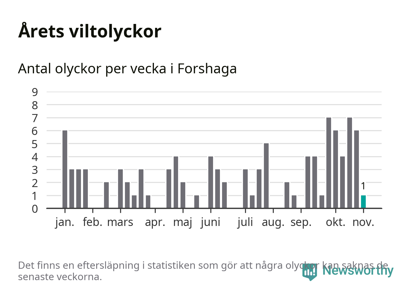 Från förra veckan (vecka 45) har hittills en viltolycka rapporterats in i Forshaga kommun.