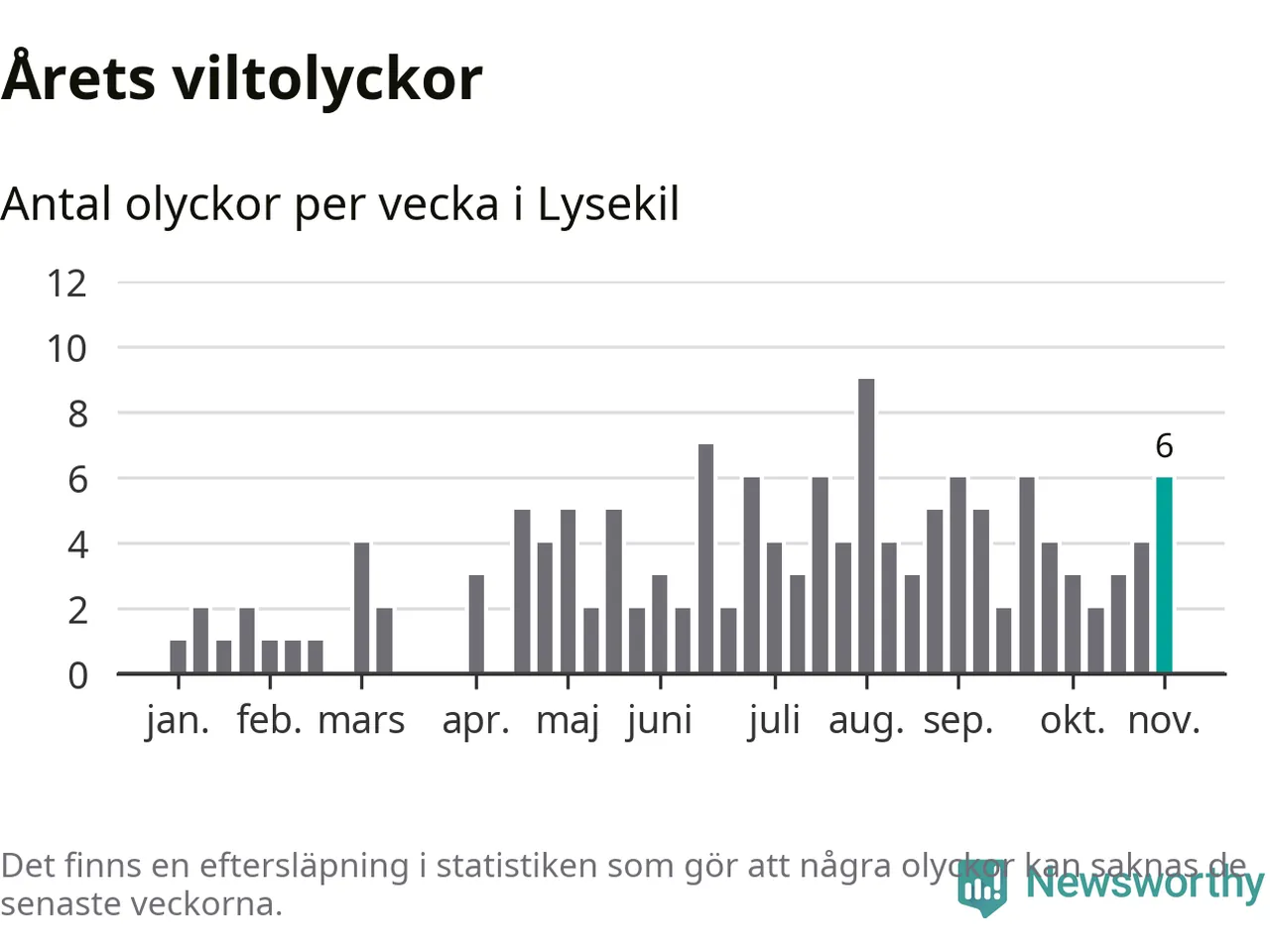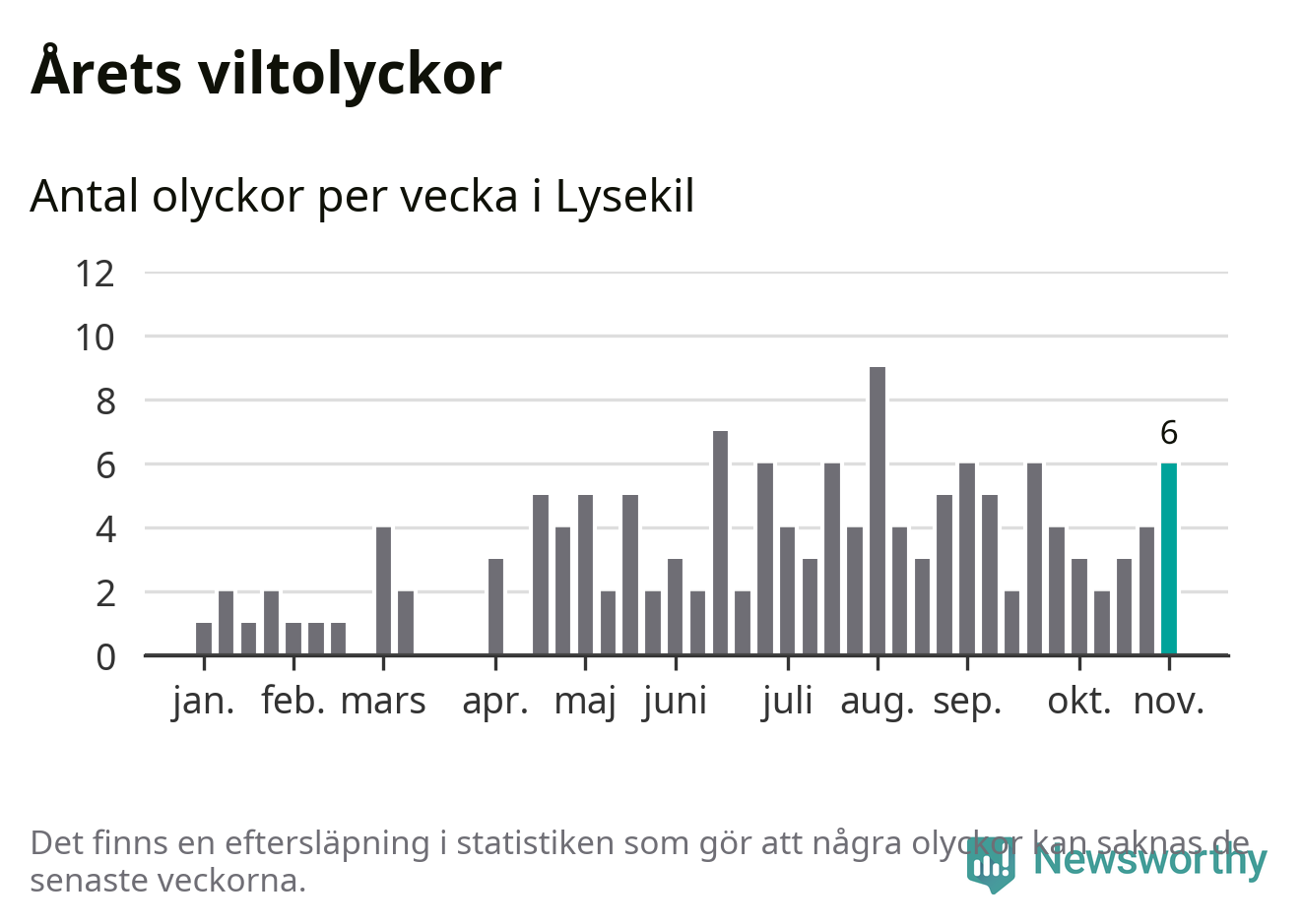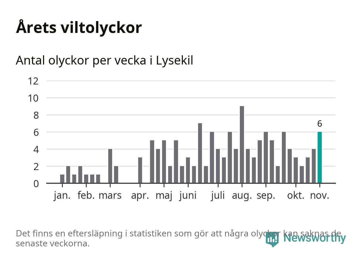 Hittills har sex viltolyckor rapporterats in i Lysekils kommun från vecka 45. Se listan här.